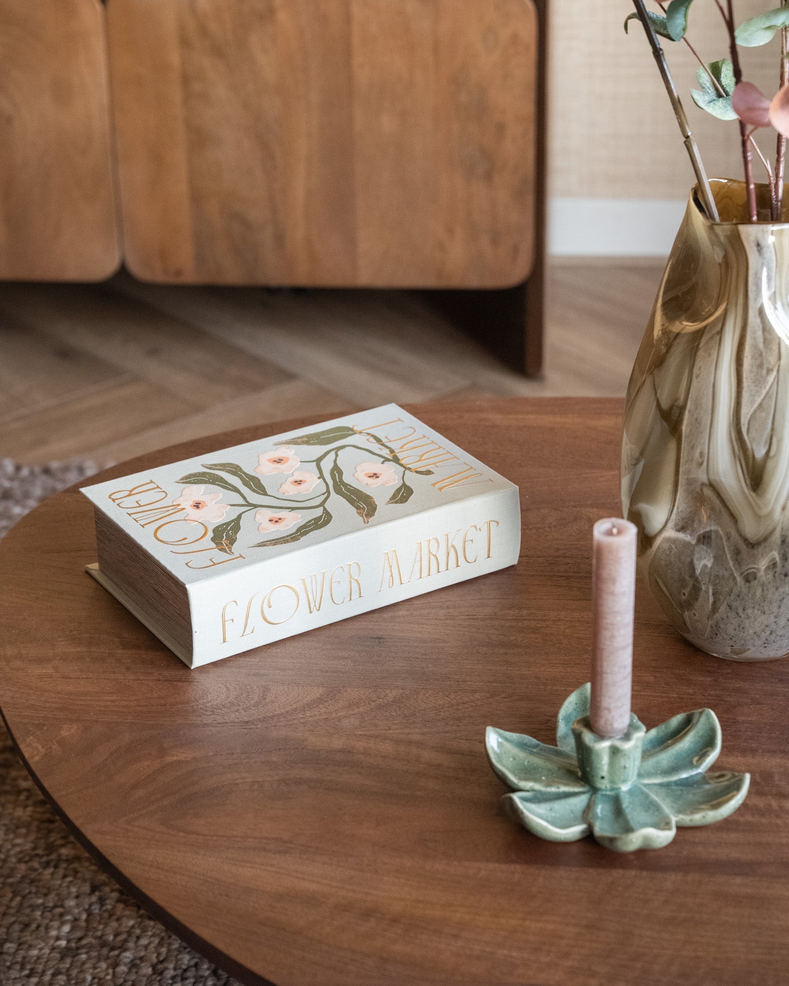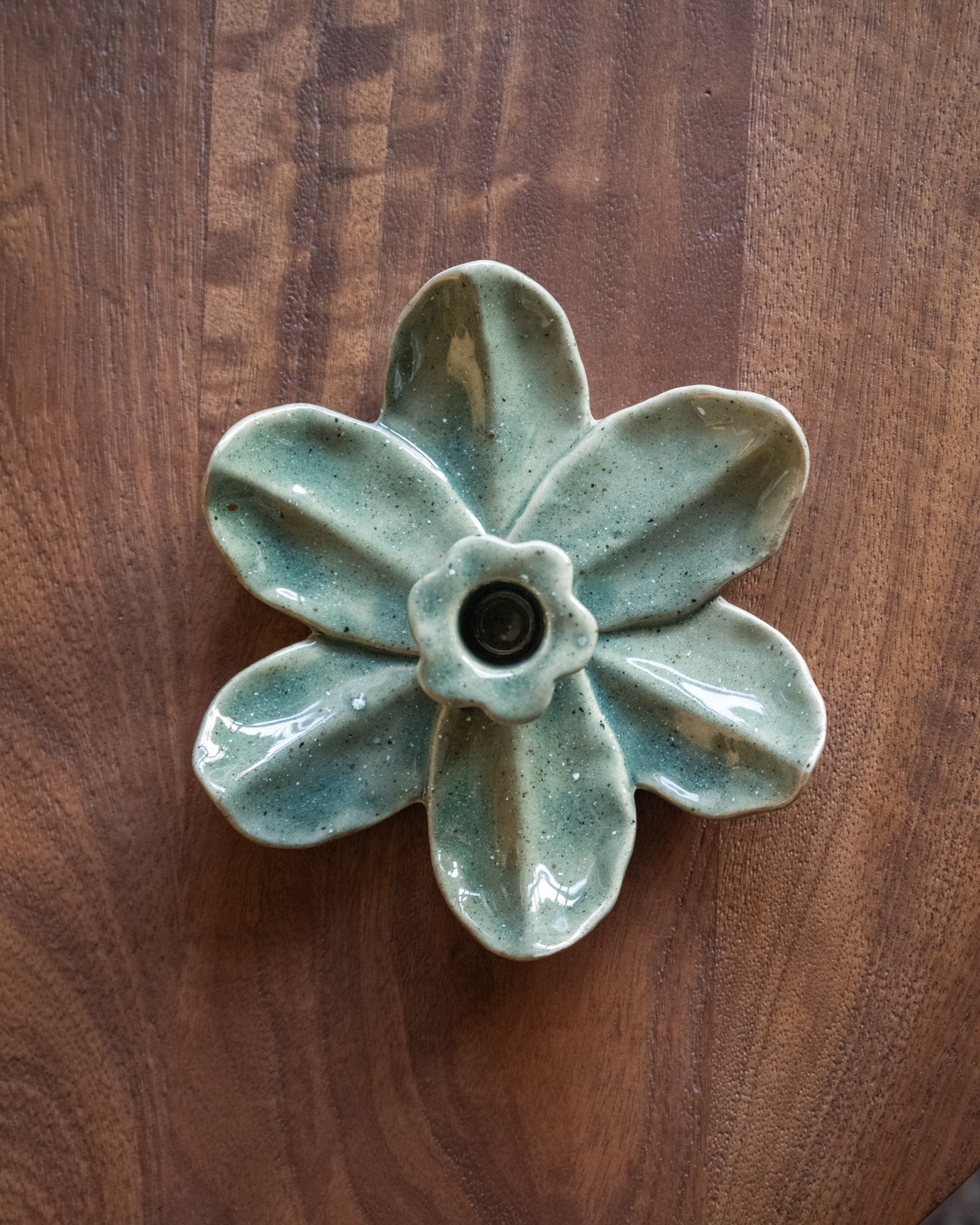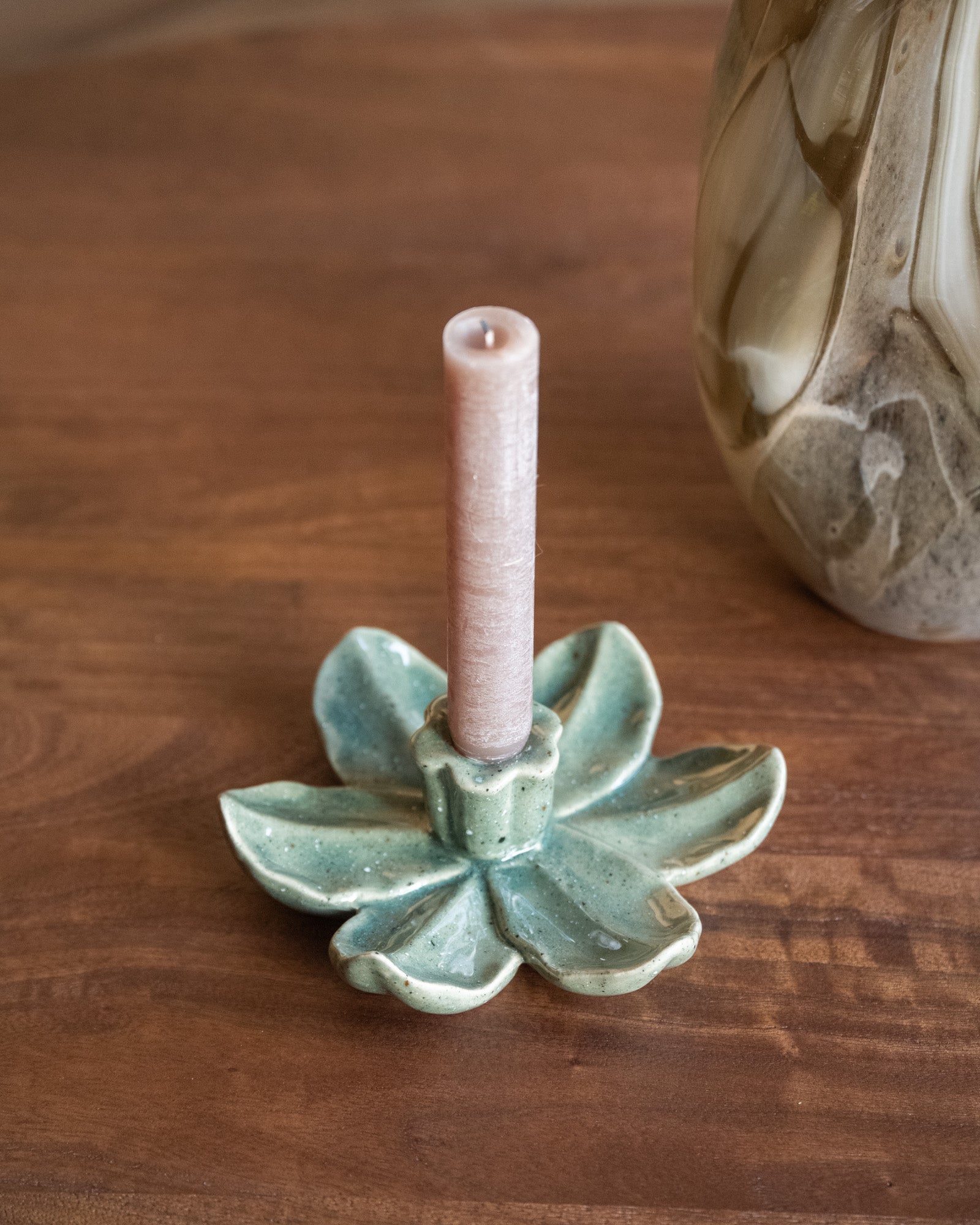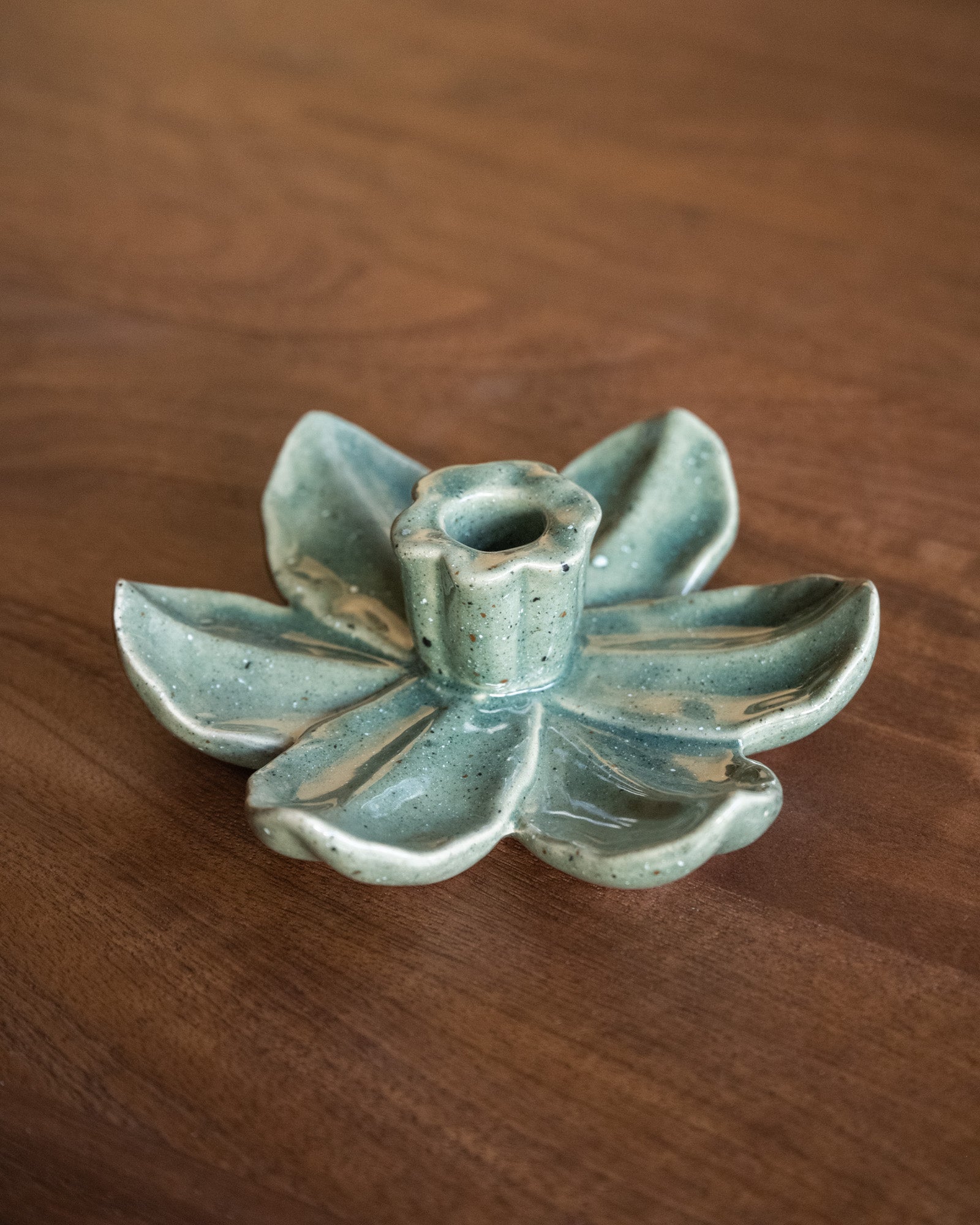 The Lotus Green Candle Holder is an elegant candlestick with a lotus-shaped design in a soft green hue. The ceramic finish creates a calm, natural look that fits perfectly on a sideboard, side table, or dining table.