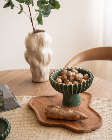 This ceramic bowl on a pedestal is a real eye-catcher on the table or in the kitchen. The speckled finish and playful texture give it a soft, natural look. Perfect for fruit, sandwiches, or snacks, but also beautiful as a decorative object on its own. A stylish blend of practical and decorative.