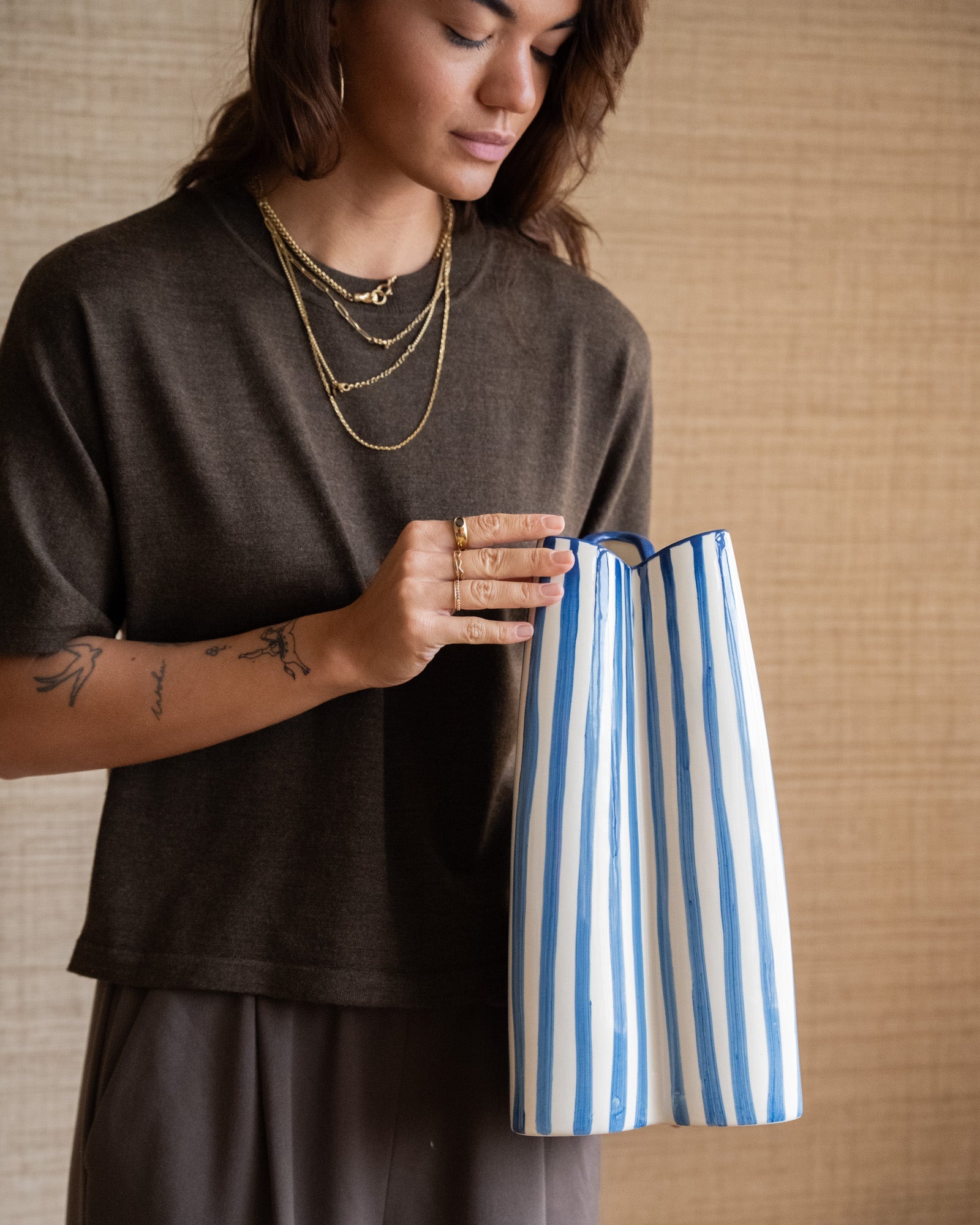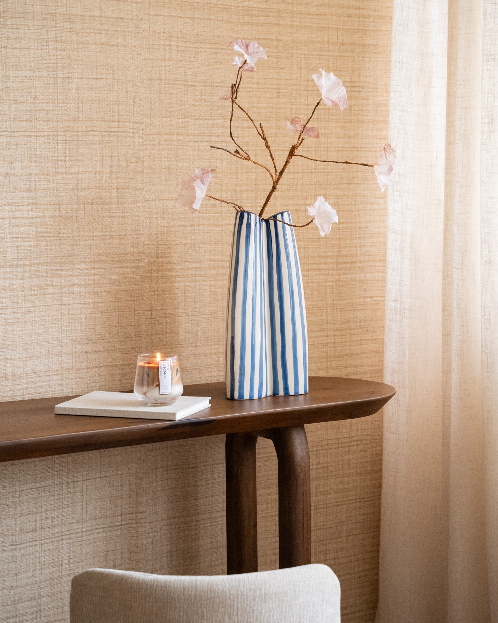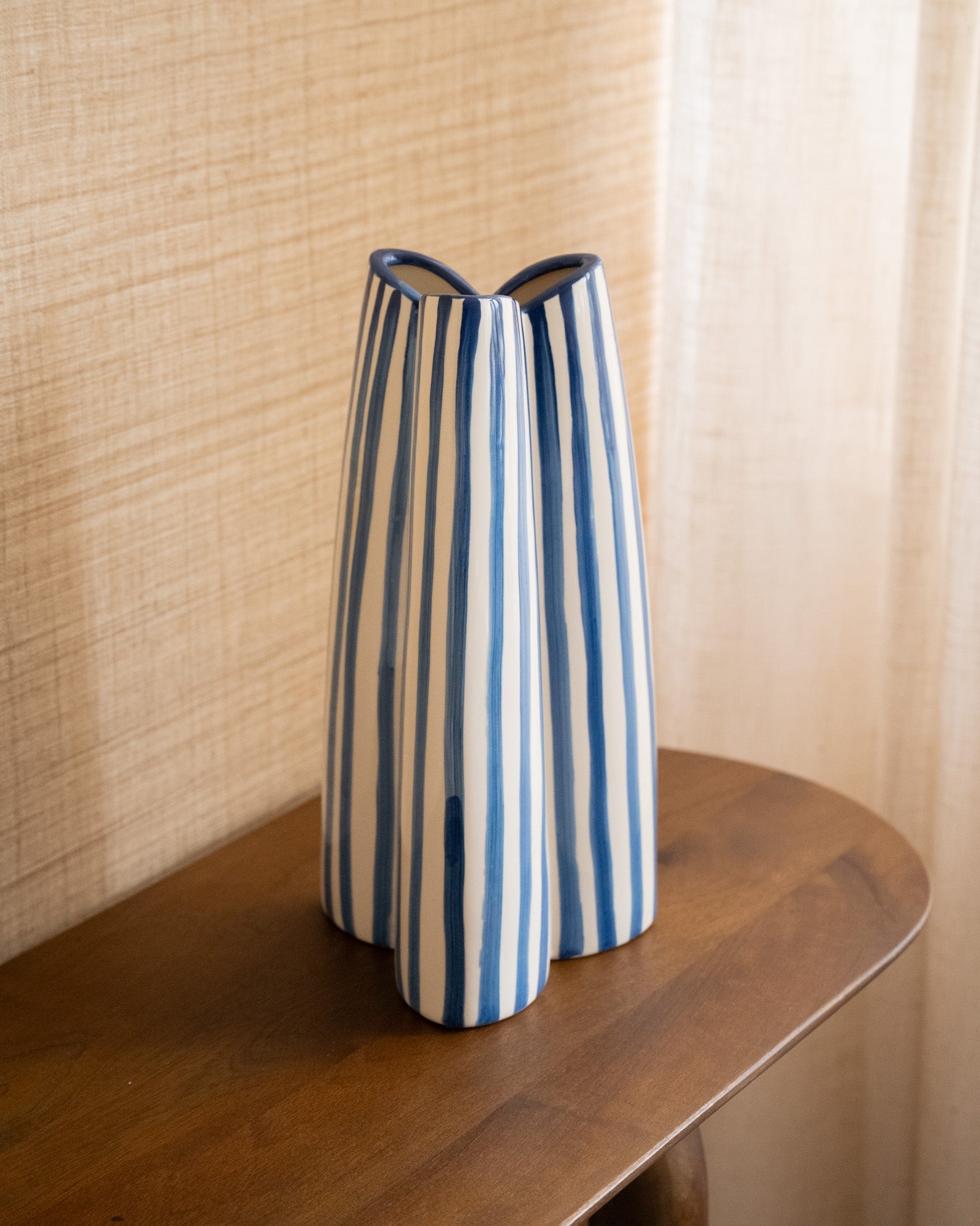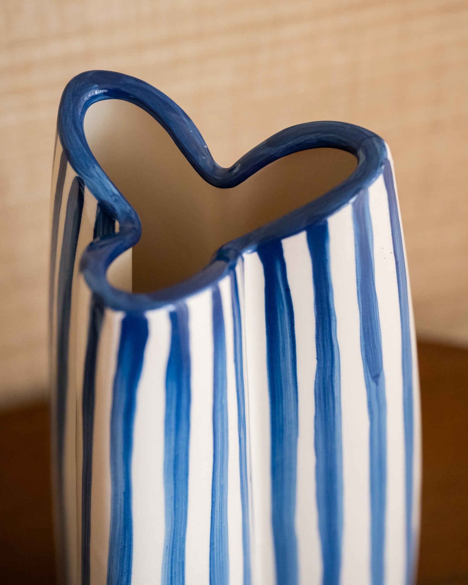 Add a touch of playful elegance to your interior with the Deco Vase Lina Blue. This ceramic vase stands out with its organic shape and blue stripes, creating a fresh and artistic look. Perfect as a decorative object or for displaying your favorite dried or artificial flowers!