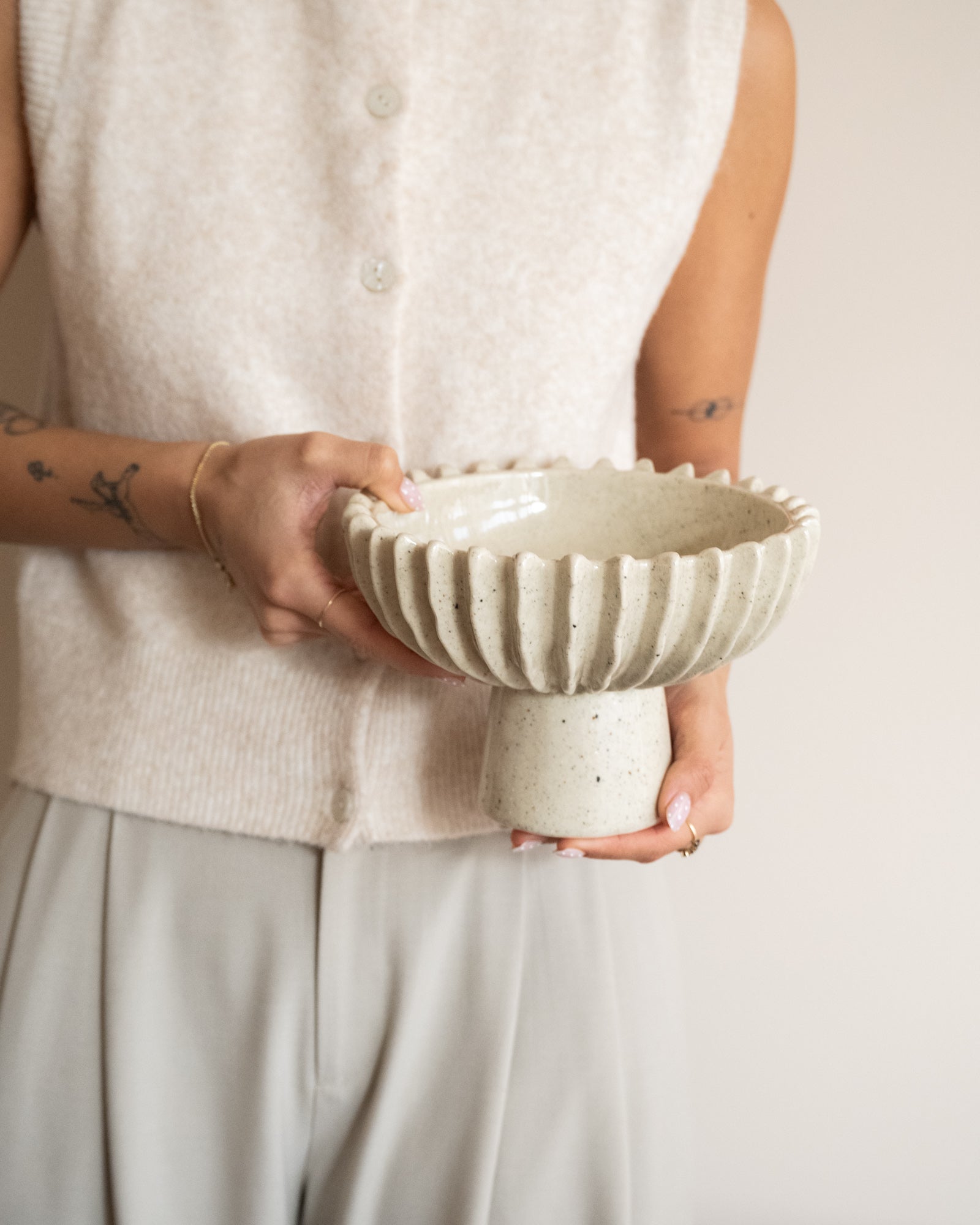 This ceramic bowl on a pedestal is a real eye-catcher on the table or in the kitchen. The speckled finish and playful texture give it a soft, natural look. Perfect for fruit, sandwiches, or snacks, but also beautiful as a decorative object on its own. A stylish blend of practical and decorative.