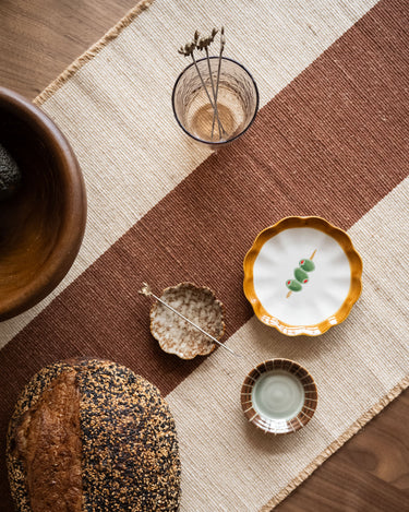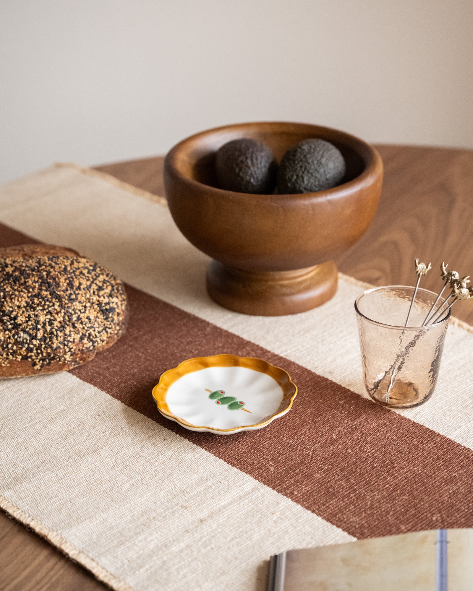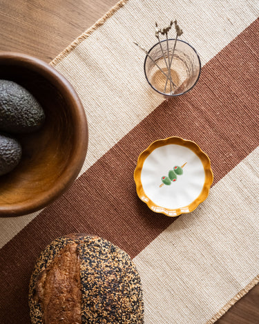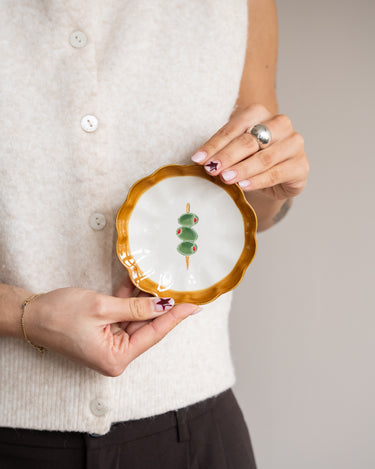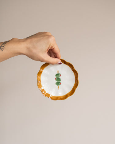 The Small Plate Olive Skewer is a playful ceramic plate with an olive illustration and a wavy rim in warm brown tones. Perfect for serving small snacks, tapas, or as a decorative dish on the table. A charming detail that adds a touch of character to your table setting.