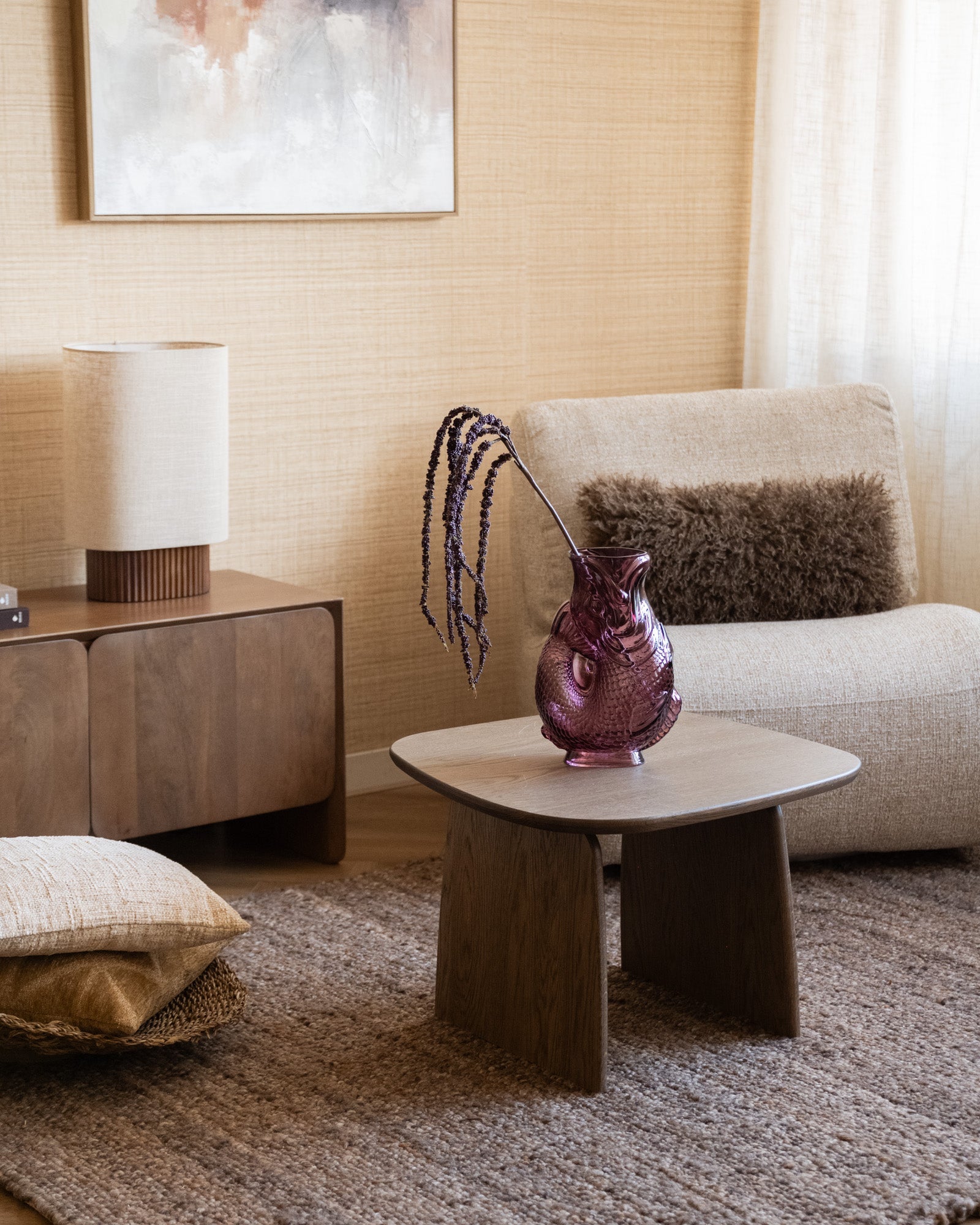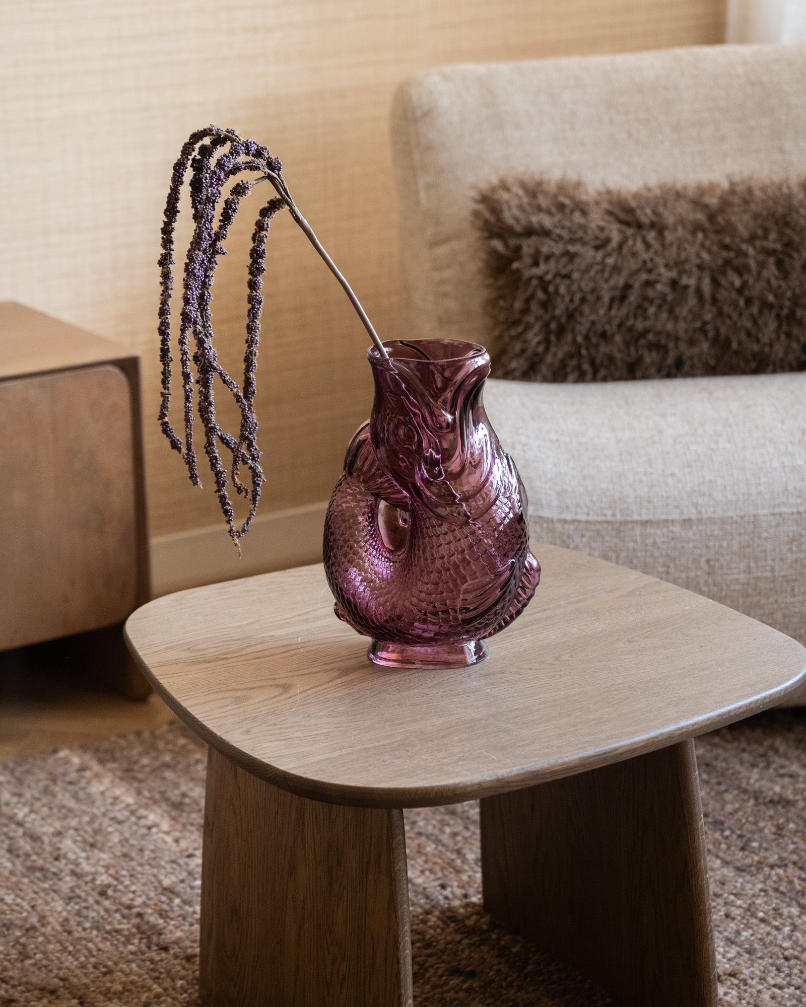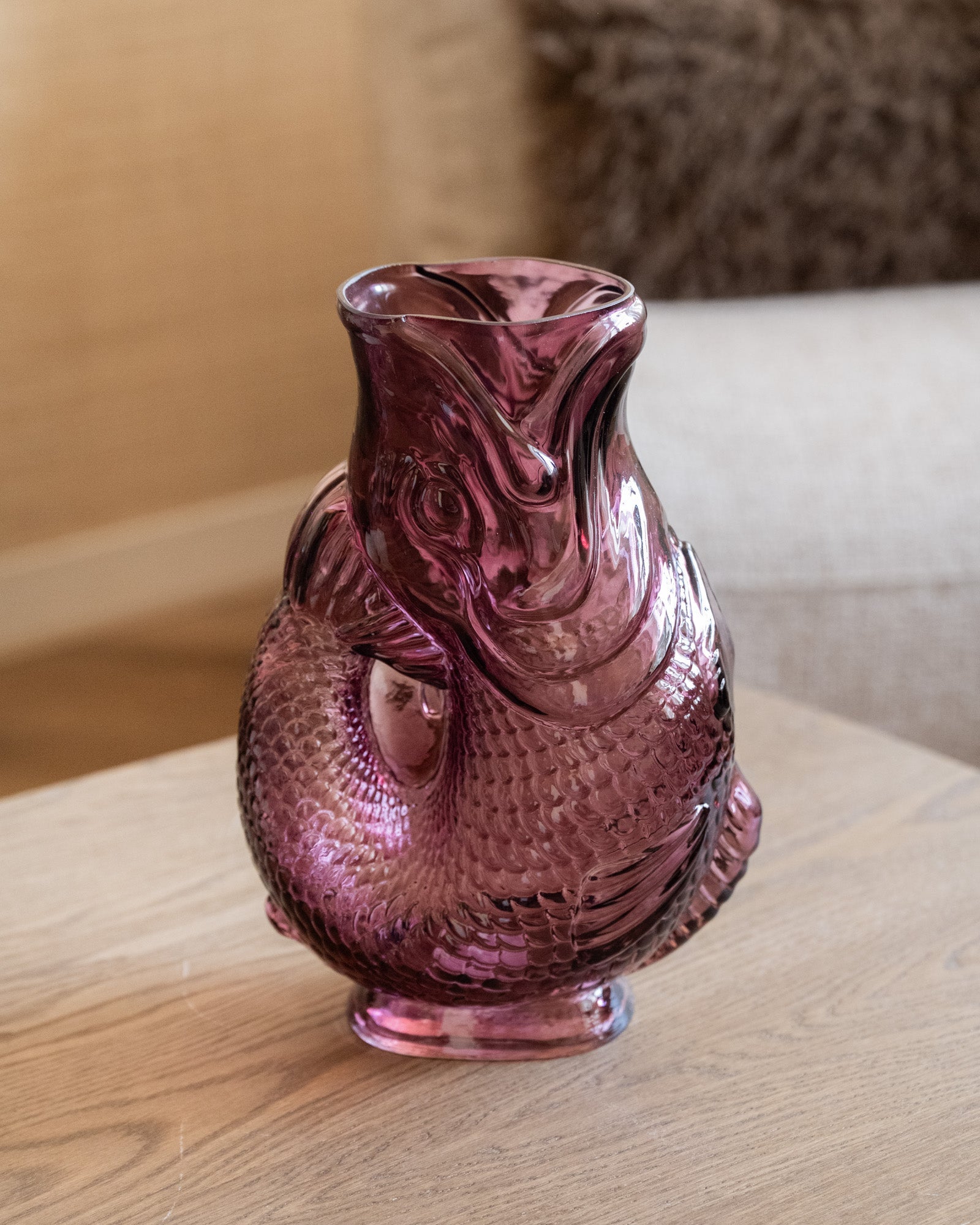 The Fish Glass Aubergine Vase is a real eye-catcher with its playful fish shape and deep aubergine sheen. The glass design catches the light beautifully and adds a striking, decorative touch to any interior. Perfect as a statement piece on a table, sideboard, or shelving unit, with or without flowers.