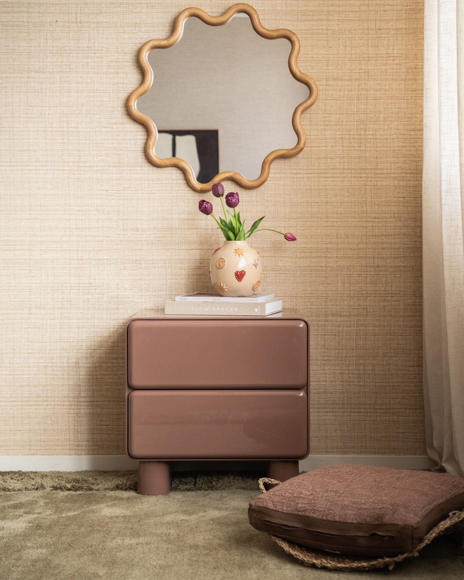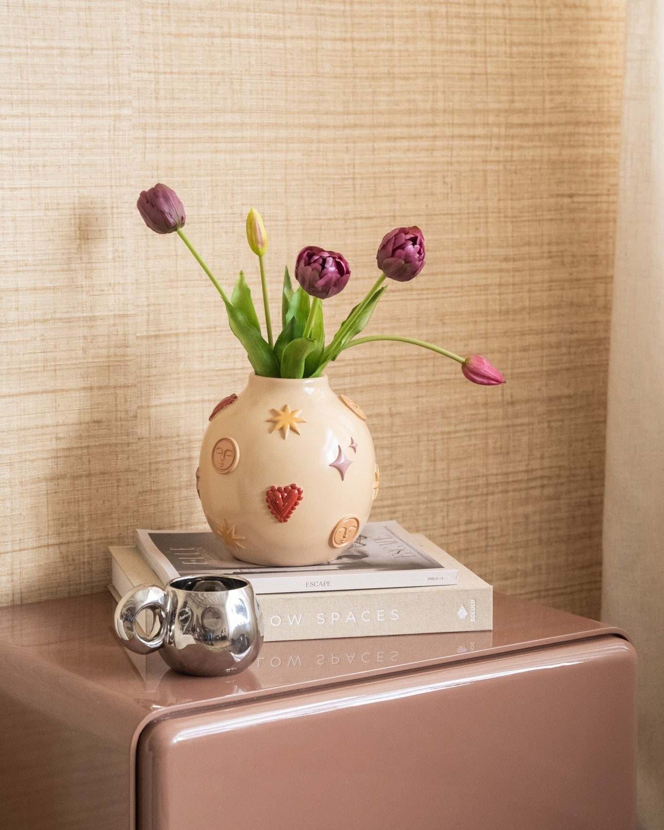 Give your interior a playful touch with the Deco Vase Cosmic Symbols. This decorative polyresin vase has a glossy finish and subtle reliefs of suns, stars, hearts, and moons in soft hues. Perfect as an eye-catcher with artificial flowers, a beautiful branch, or dried flowers.