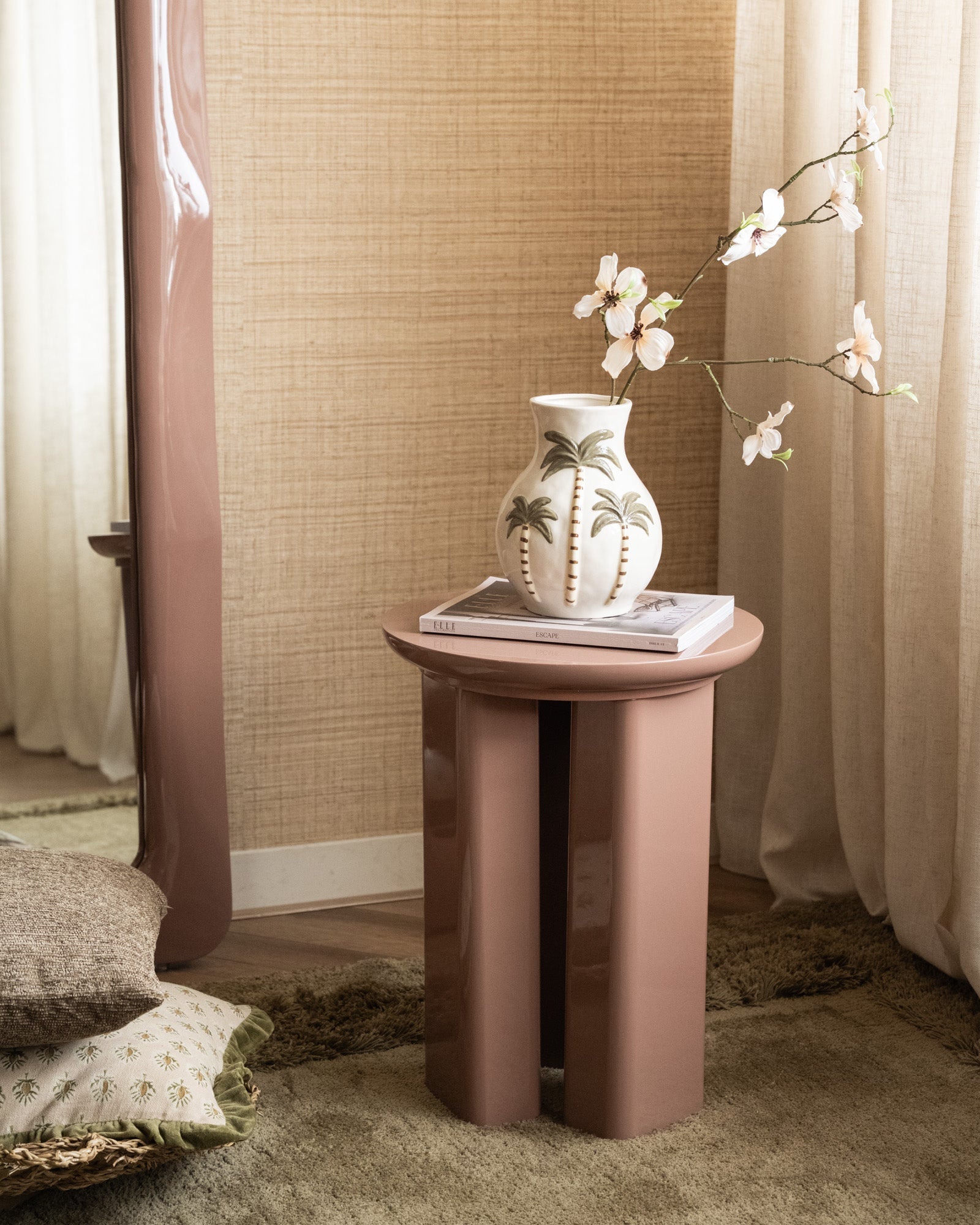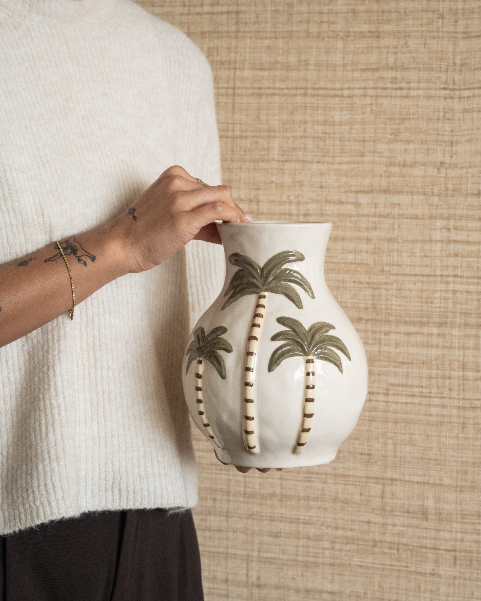 Deco Vase Palm Trees Ceramic brings a subtle tropical touch to your interior. The ceramic vase has a glossy finish with an elegant palm tree relief in soft, natural hues. Thanks to its timeless design, this decorative vase fits perfectly into a modern, boho, or tranquil interior. Beautiful as an eye-catcher on a side table, nightstand, or dresser, with artificial flowers, a branch, or dried flowers.