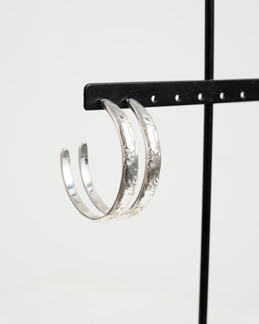 Silver hoop earrings with a subtle sun-like texture. Fresh, elegant, and easy to combine.