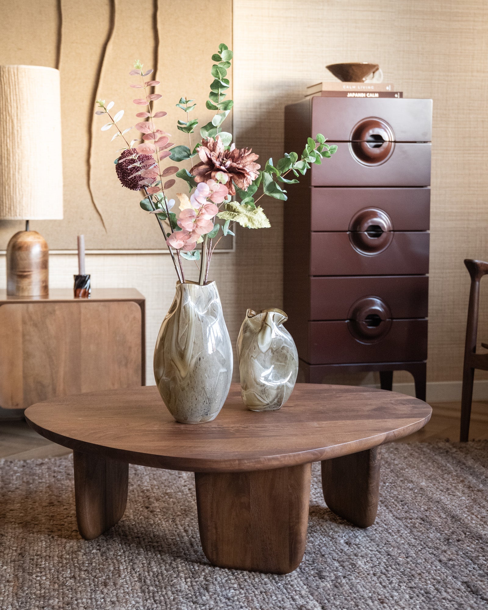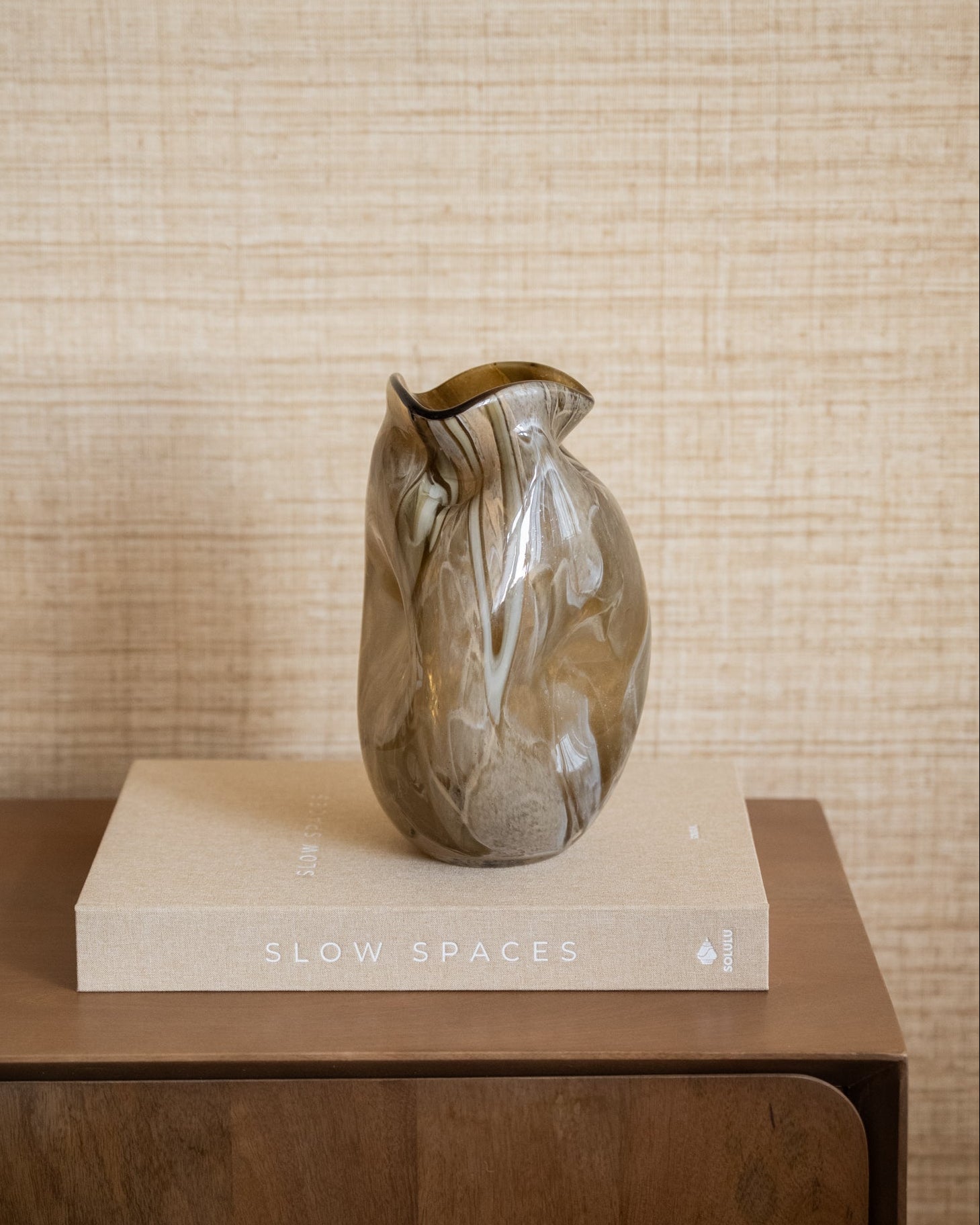 The Jorien Taupe Glass Vase is an elegant glass vase with a warm, mottled palette of sand, brown, and smoky gray. The organic shape and unique glass pattern give each piece its own character, making it perfect for both flower arrangements and purely decorative use. A stylish eye-catcher for a warm and modern interior, available in small and medium sizes.