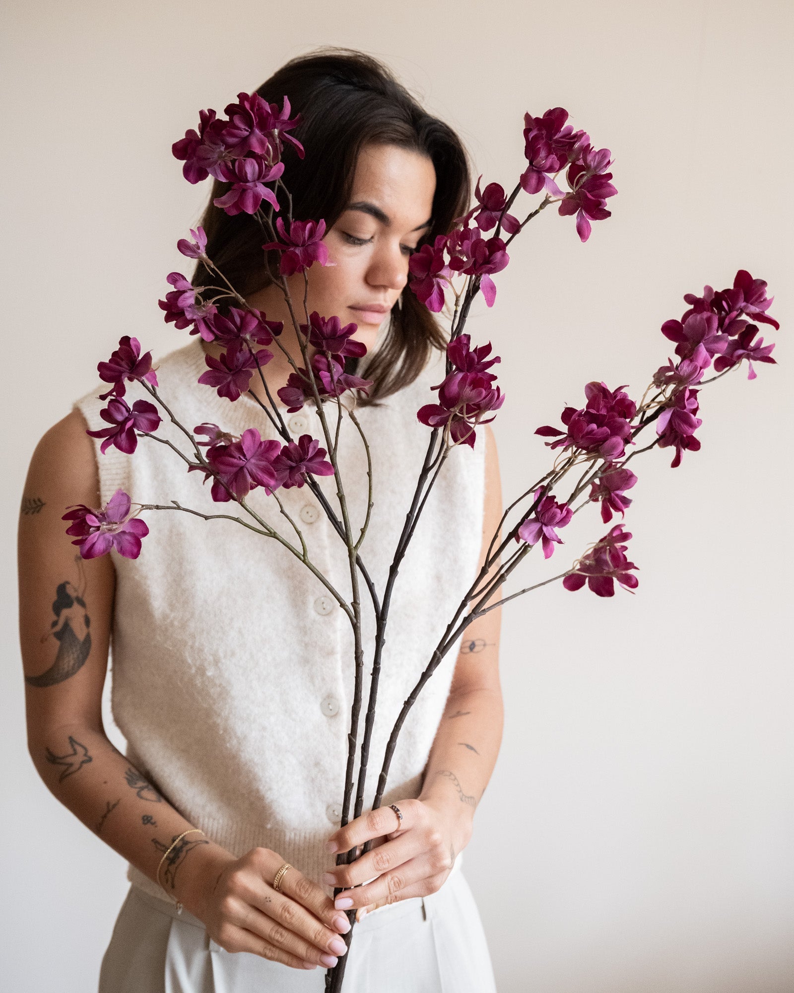 Add colour to your interior with the Faux Flower Cherry Blossom Purple. The deep purple blossoms and refined branch give a luxurious, trendy vibe to any vase. Perfect for a stylish, low-maintenance eye-catcher.