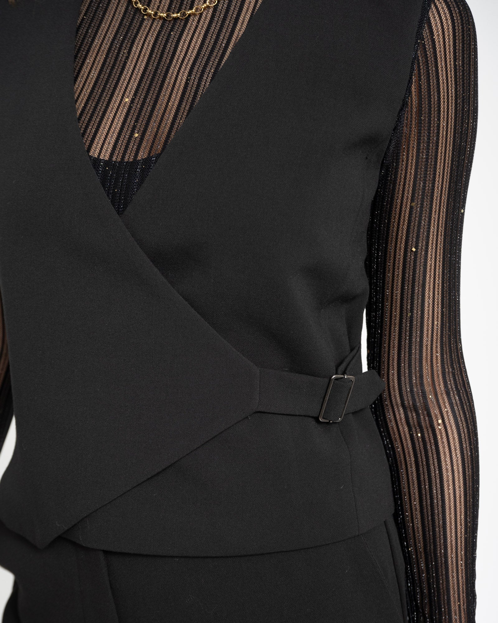 Tailored yet trendy. This cropped, sleeveless waistcoat with a buckle is the perfect mix of chic and cool.