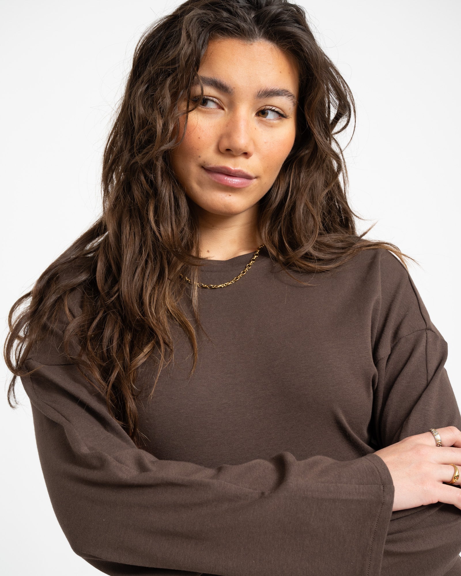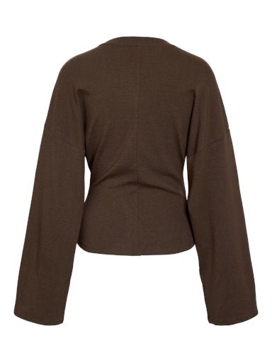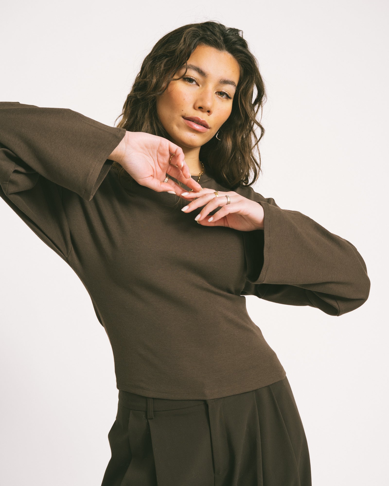 This top feels minimal, yet makes a statement. The flowing fabric and wide sleeves give it a calm elegance, while the deep chocolate brown color keeps it warm and modern.