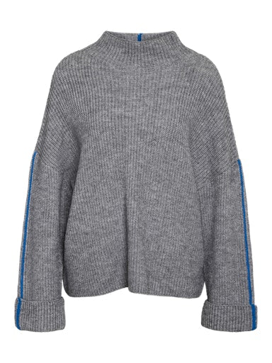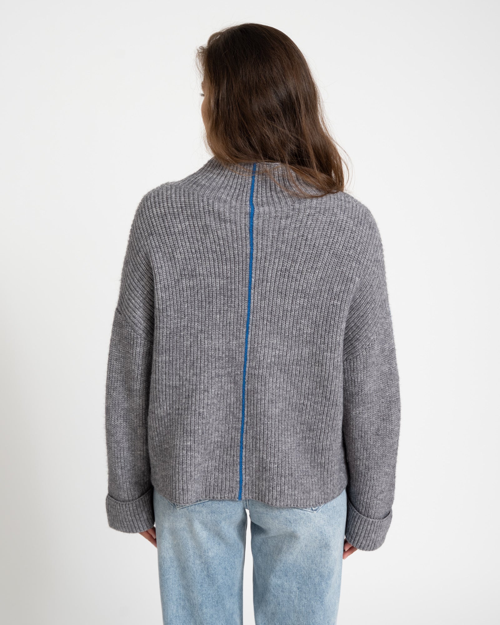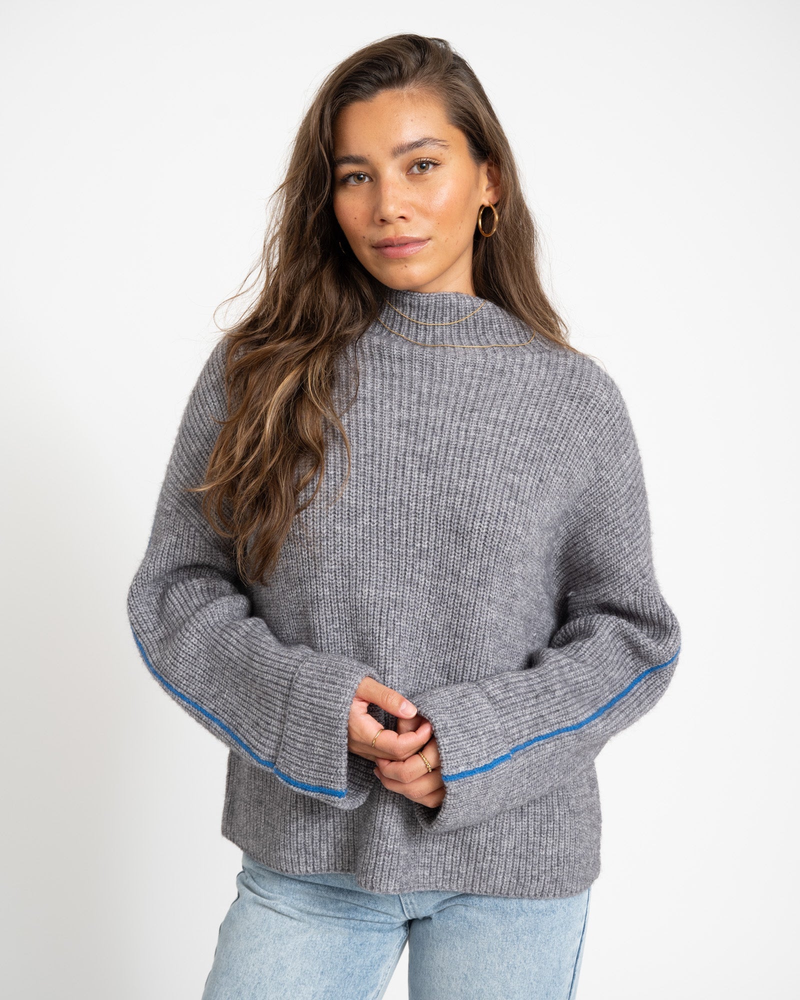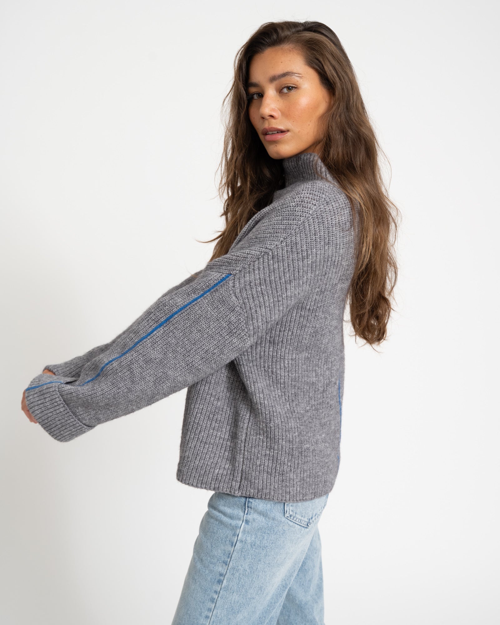 Cozy meets cool. A chunky gray knit with a high neck and subtle blue stripes along the sleeves and back.