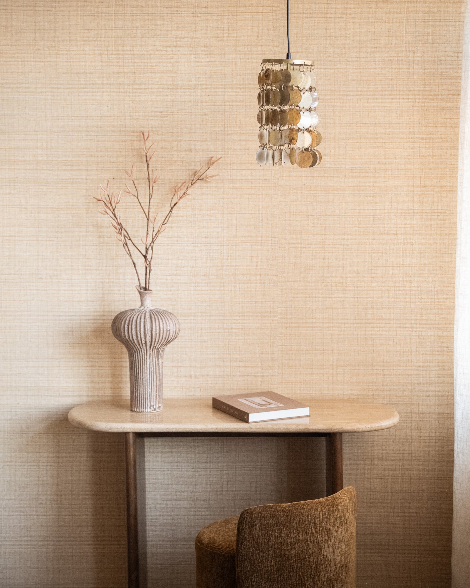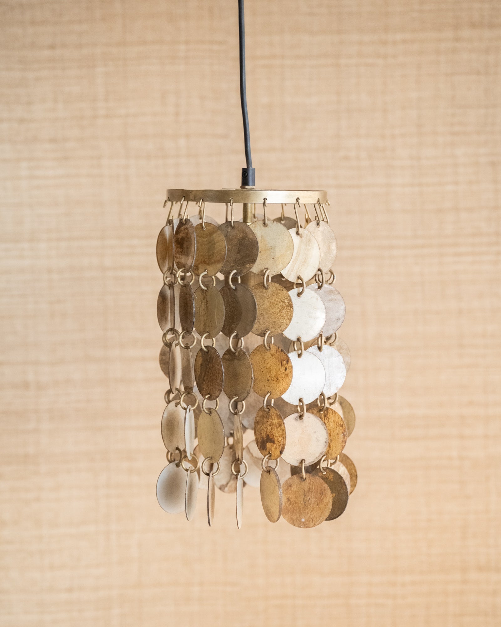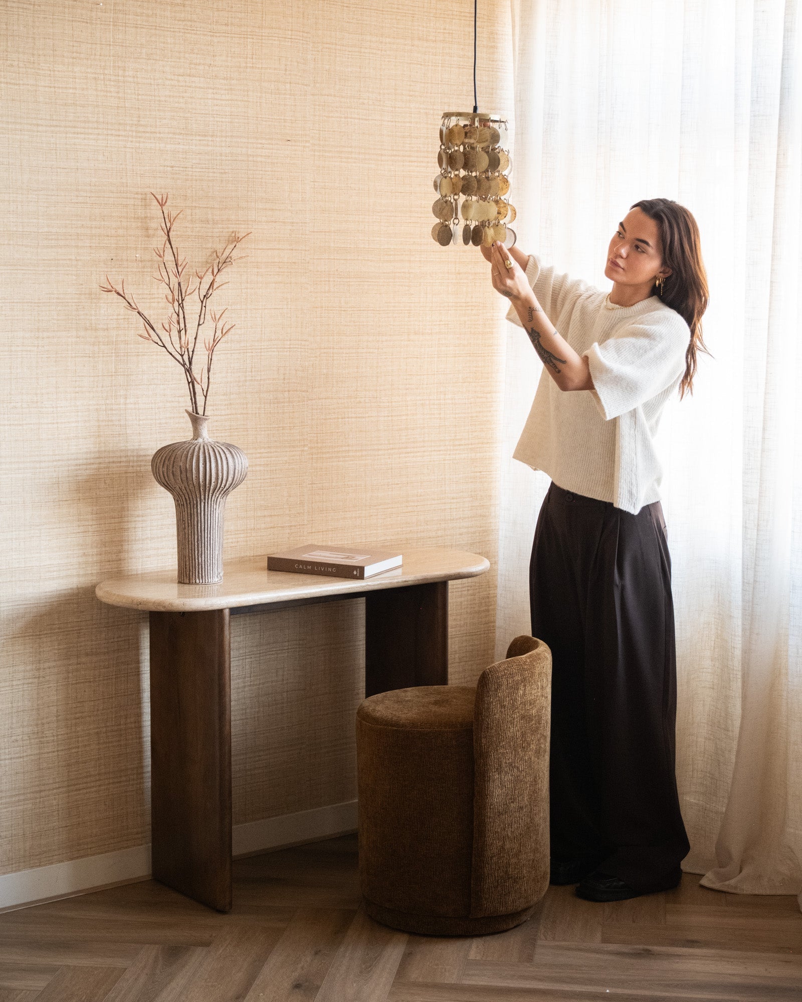 The Yoko pendant lamp is an elegant pendant lamp with a playful design of discs in warm brass tones and a subtle marble look. The layered structure creates a soft, atmospheric light, making this lamp perfect above a kitchen island, dining table, next to the bed, or as a stylish focal point in the hallway.