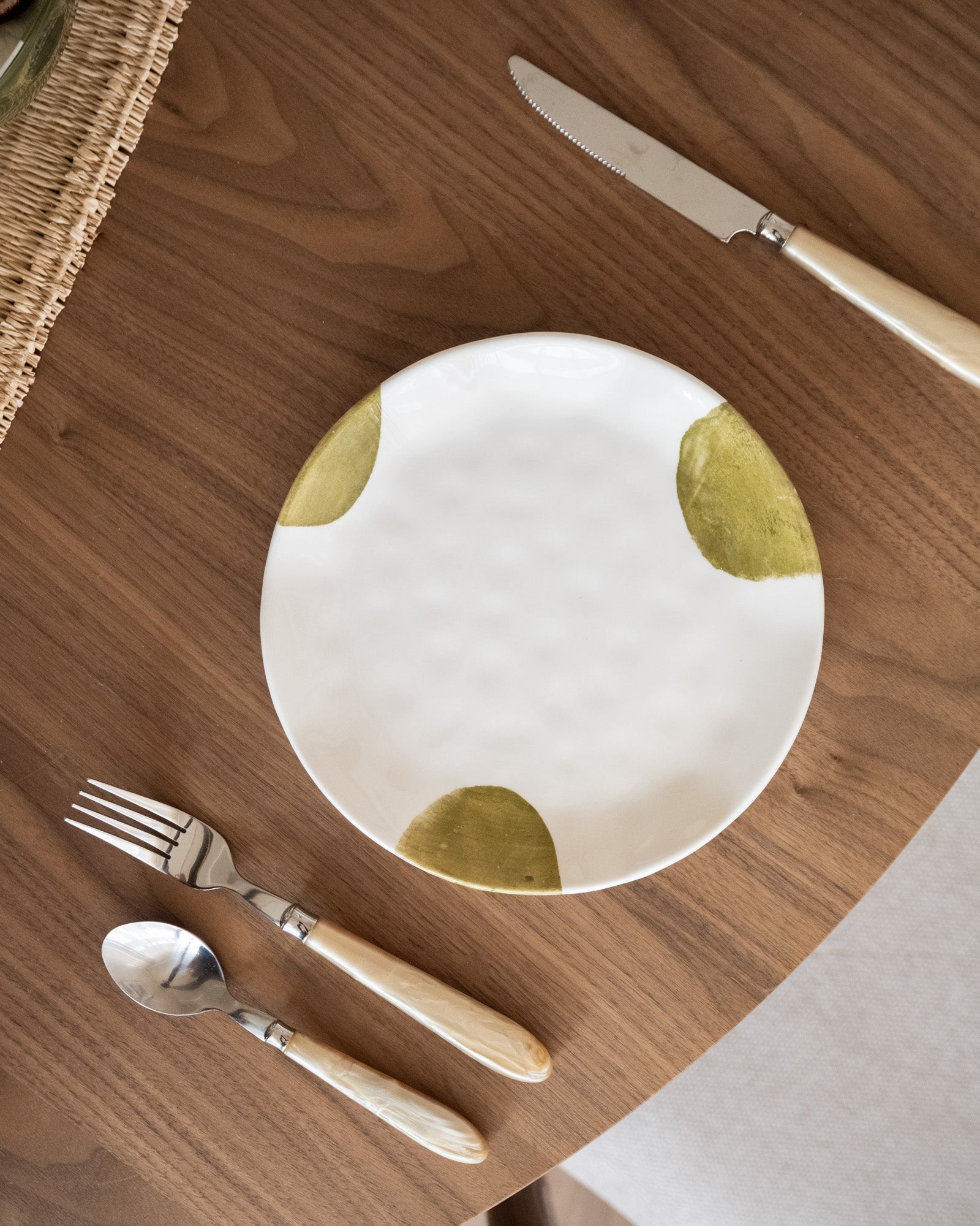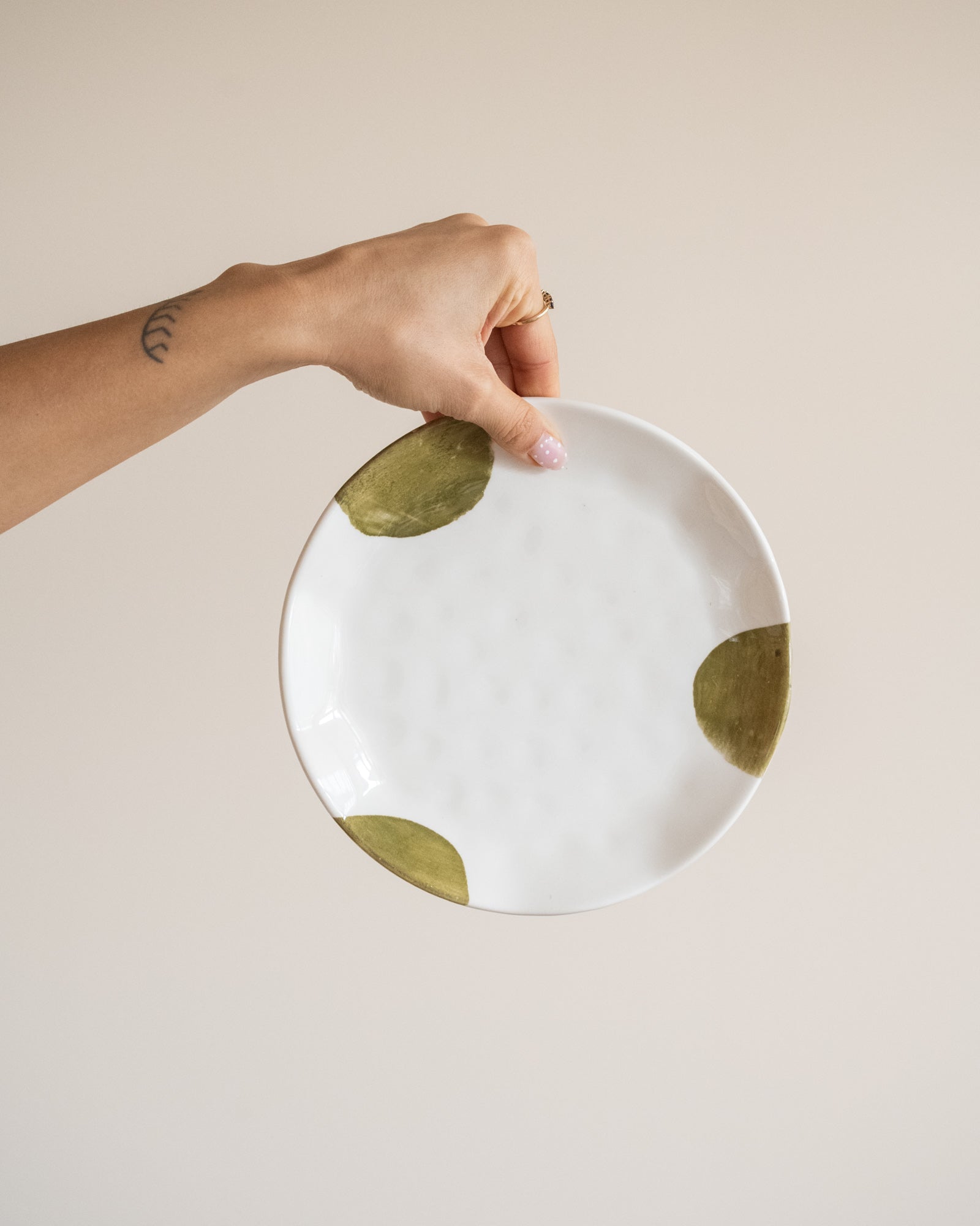 This porcelain breakfast plate is inspired by the sleek shapes and look of a modern laboratory. The hand-painted finish and organic accents in an earthy olive green make each plate unique. Perfect for breakfast, brunch, or small dishes, it pairs beautifully with other items from the Labo tableware line.