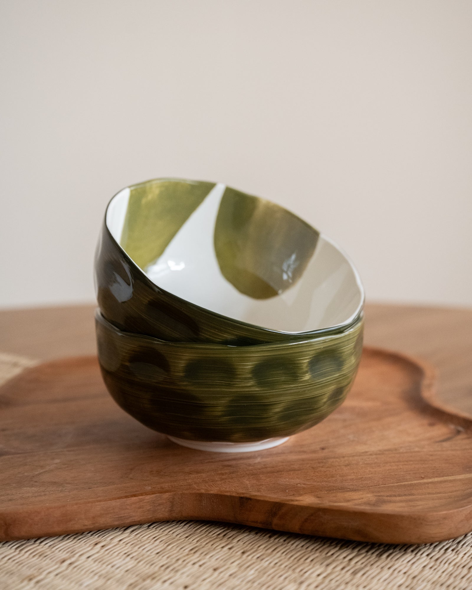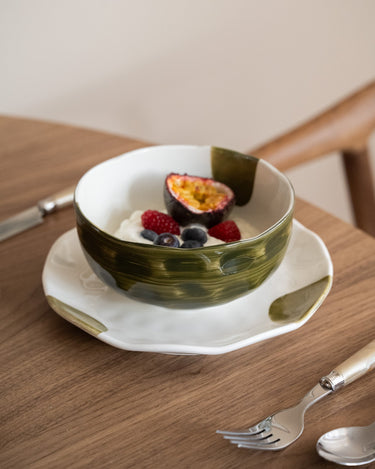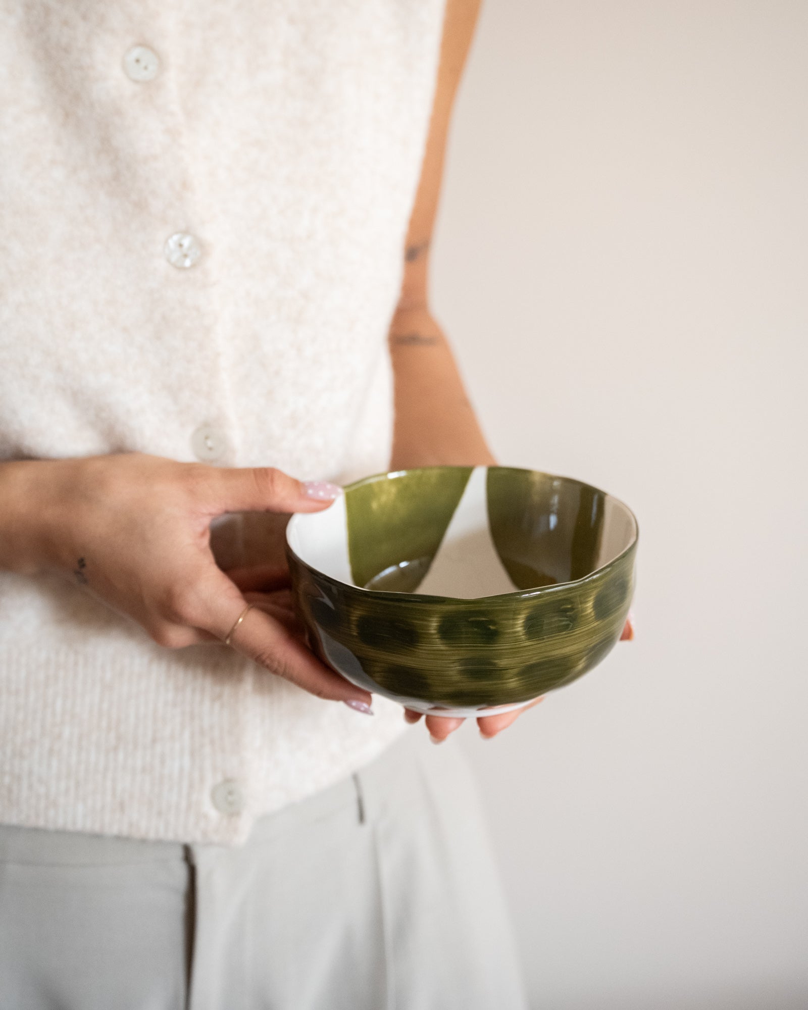 Inspired by the sleek lines of a modern laboratory, this porcelain bowl features a hand-painted finish with organic olive green accents. Its playful, almost experimental design makes it perfect for breakfast, yogurt, snacks, or small dishes.