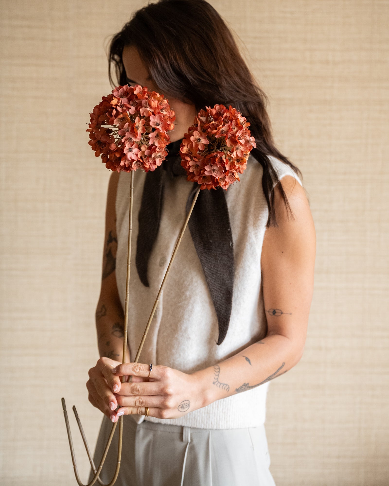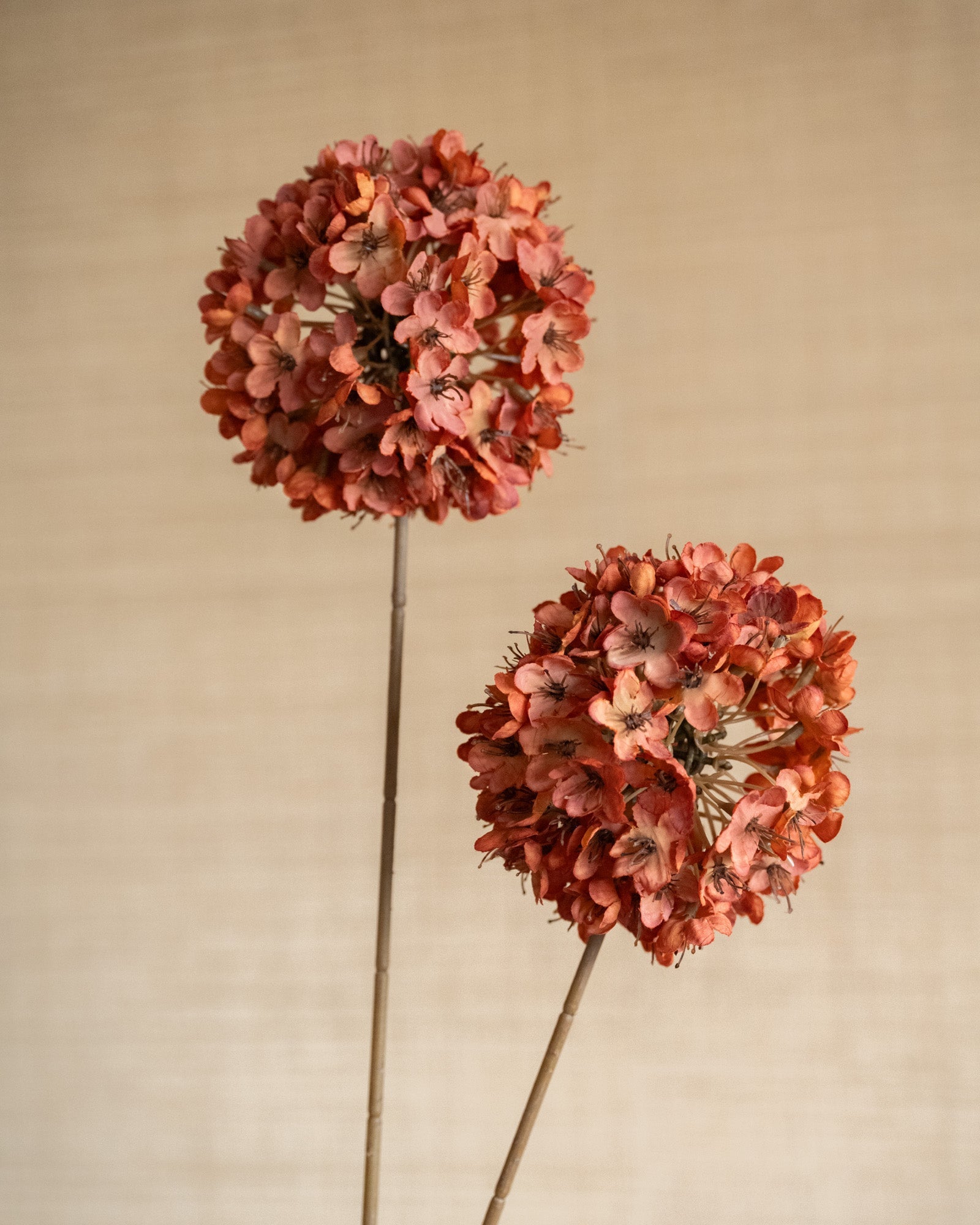 The Faux Flower Allium Terra is a stylish artificial flower with a full, spherical bloom in a warm terracotta hue. Thanks to its delicate flowers and long stem, this artificial allium instantly adds character to your vase or dried flower bouquet. Perfect for styling on its own or combining with other faux flowers for a playful and modern look. Maintenance-free and always beautiful, ideal for any season.