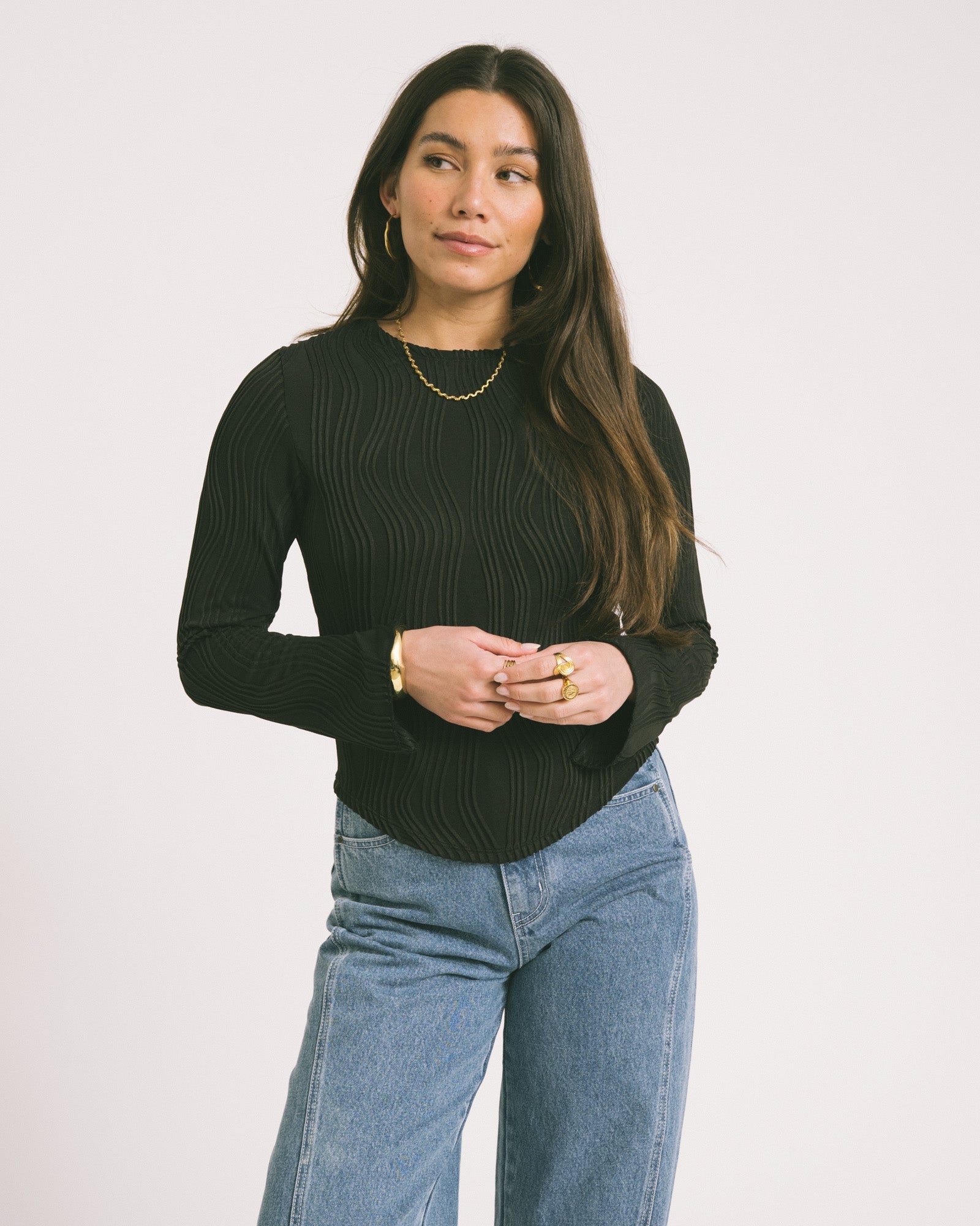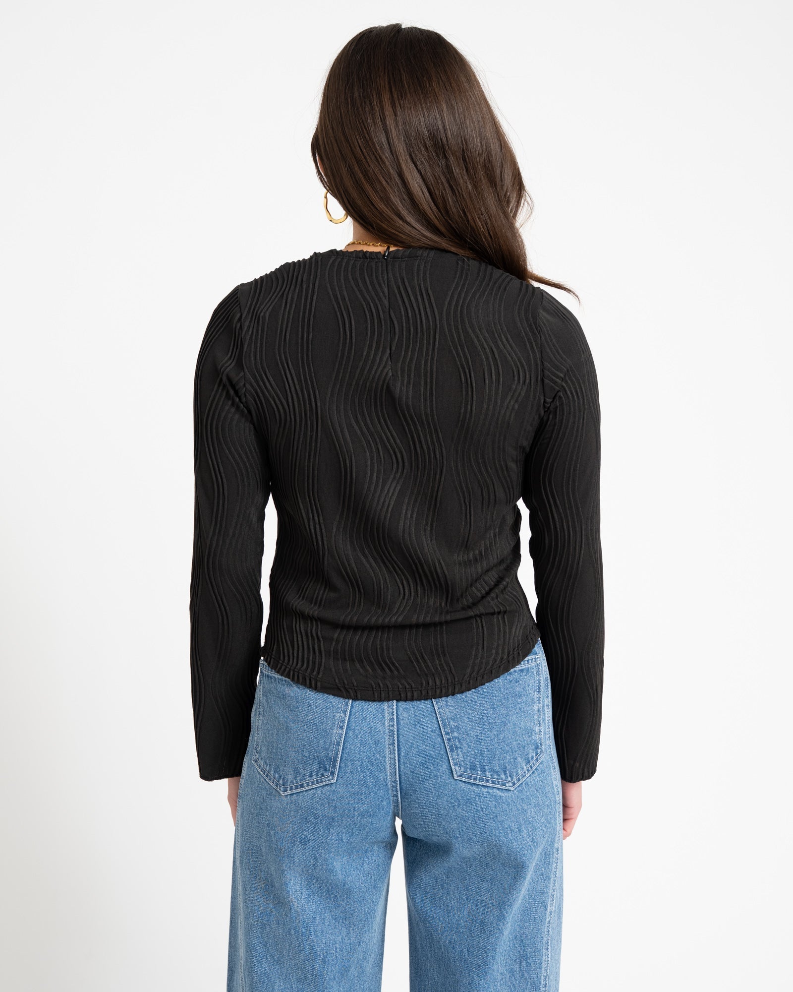This top does exactly what you want: flowy, feminine, and a touch flirty. The wavy texture and subtle bell sleeves make it just that little bit different from your standard top. Perfect for a dinner date, Christmas, or any occasion where you want to look effortlessly chic.