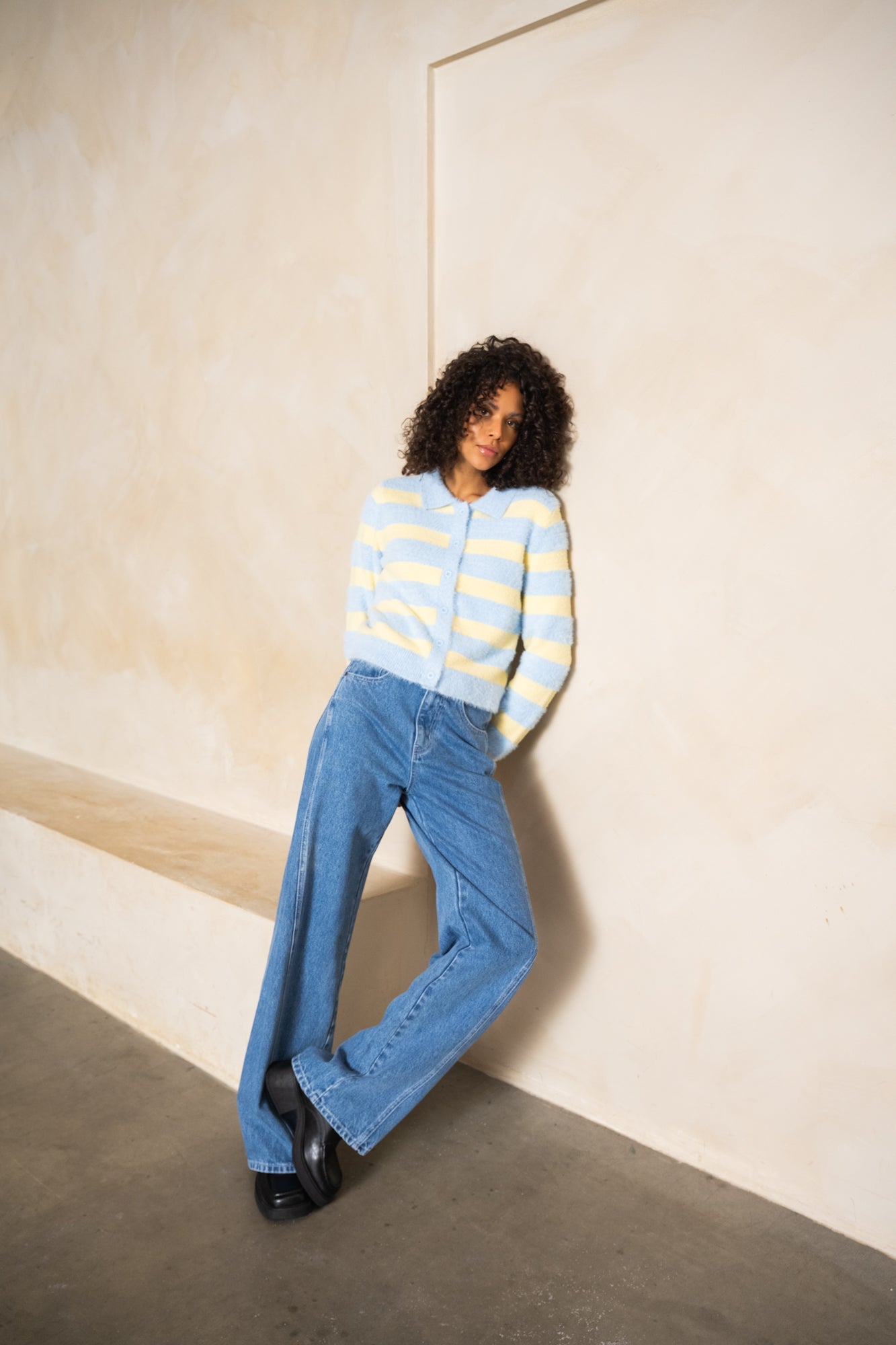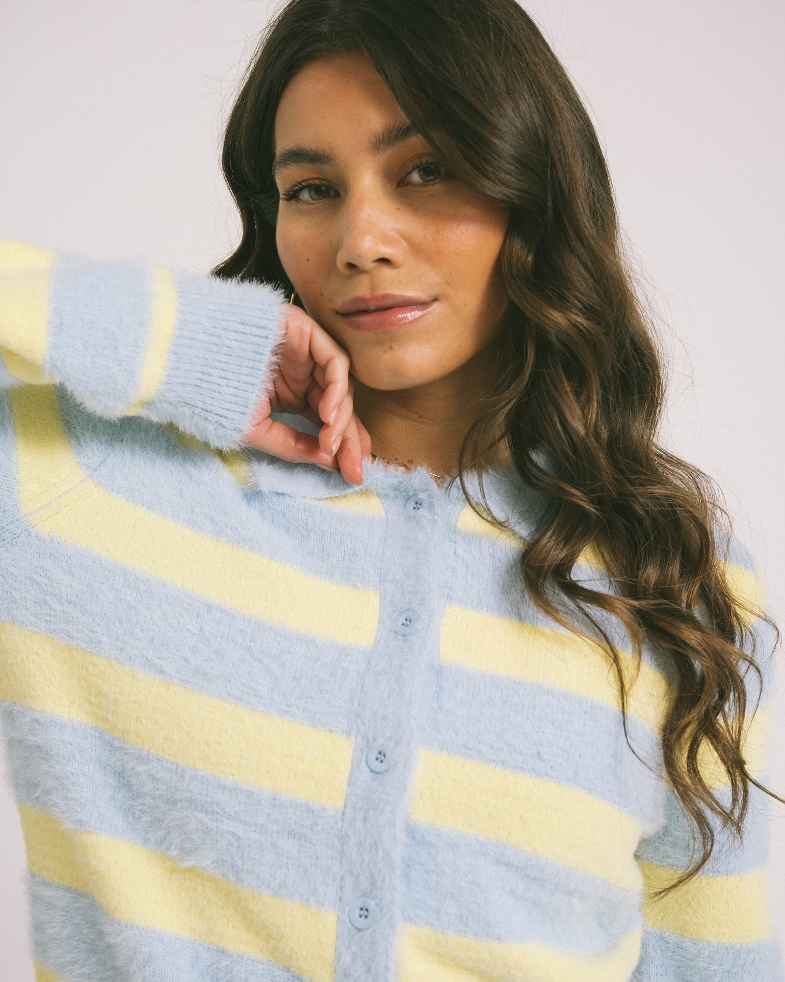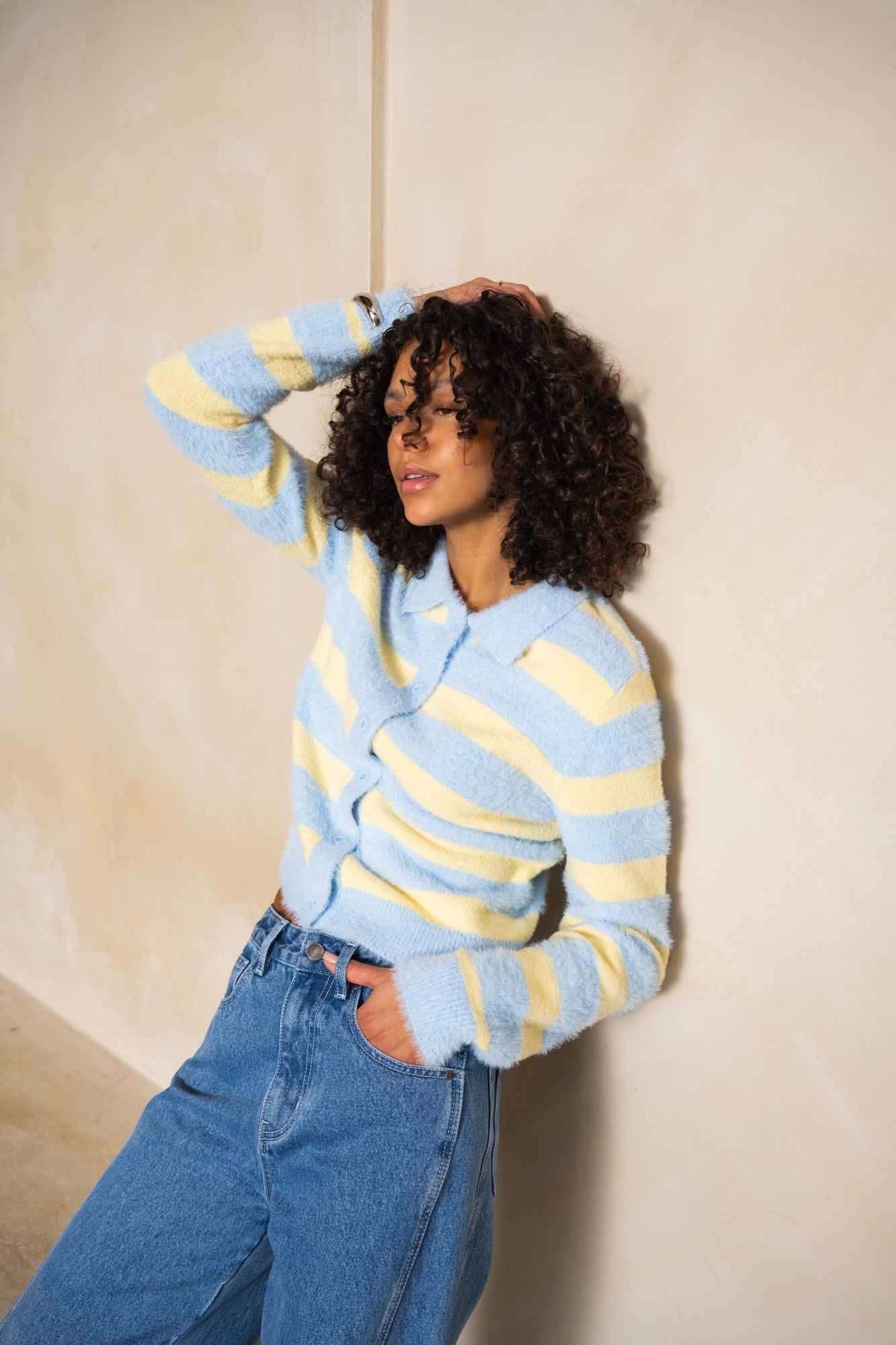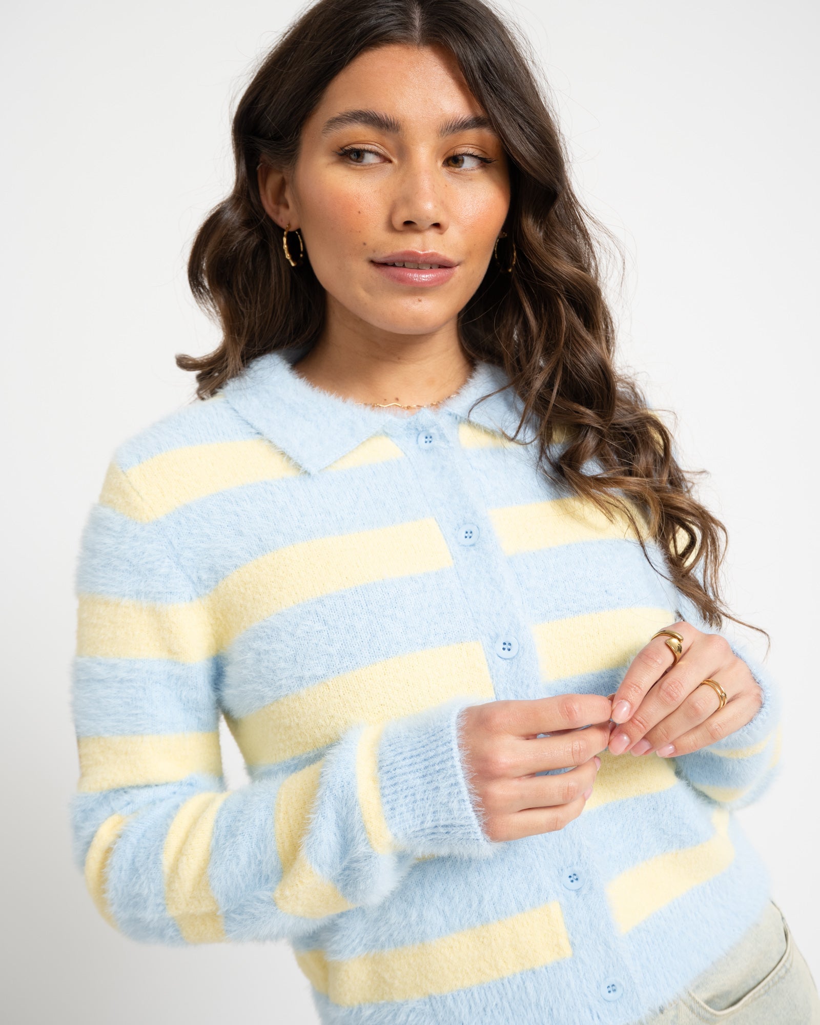 A soft, slightly fuzzy cardigan with striking yellow and blue stripes. Perfect for when you want a touch of color but also want to stay warm and comfortable throughout the new year. Finished with a button closure and a polo collar.