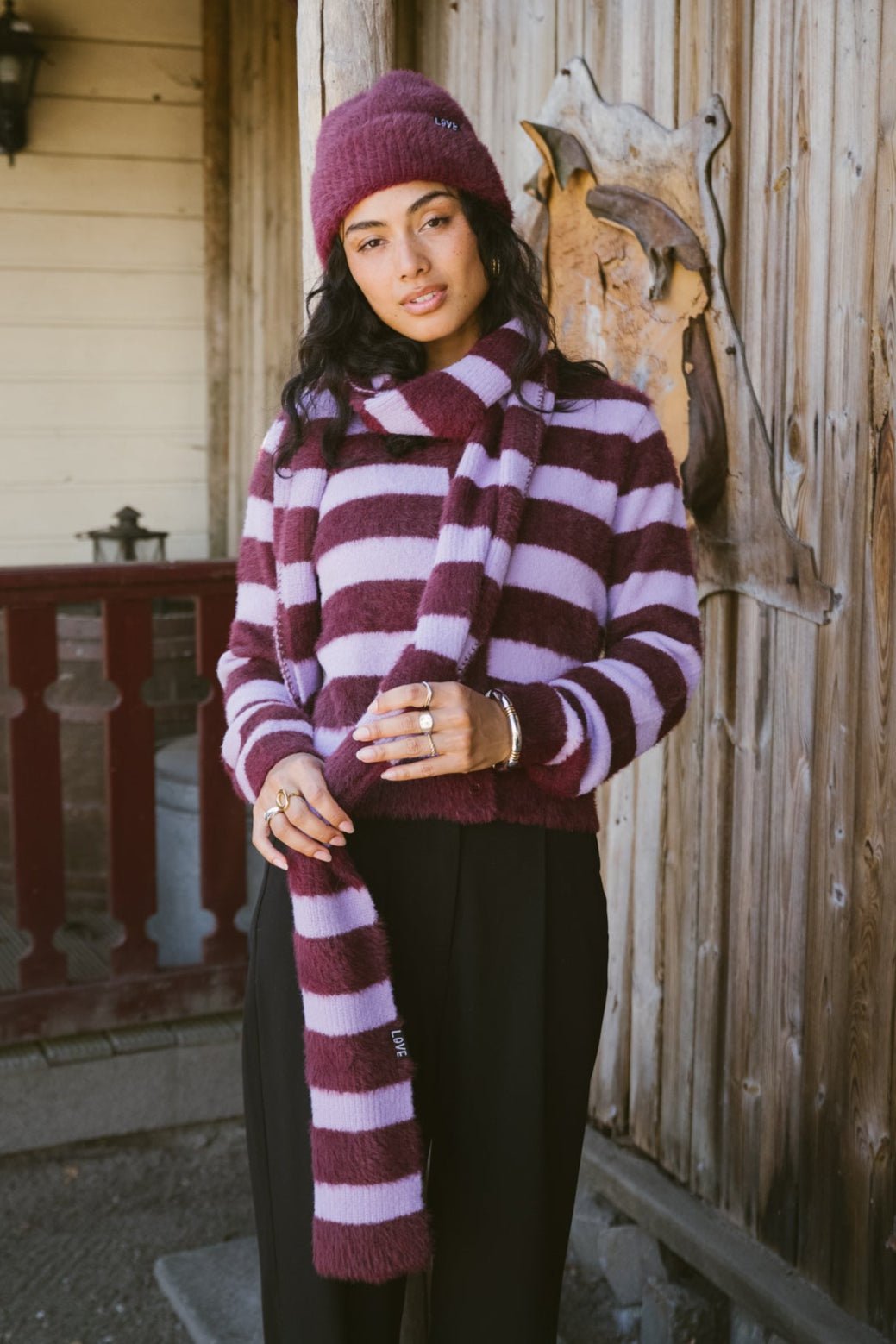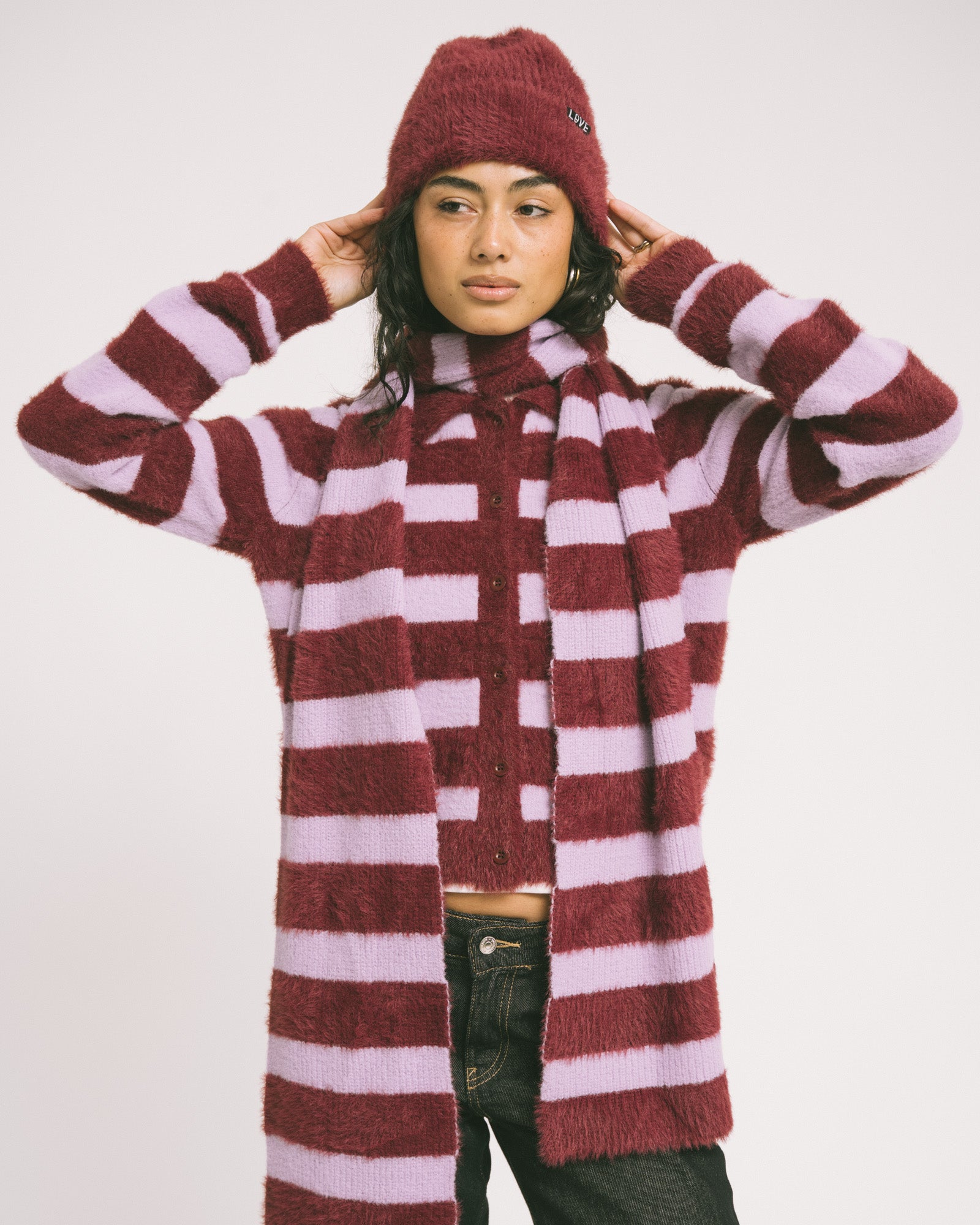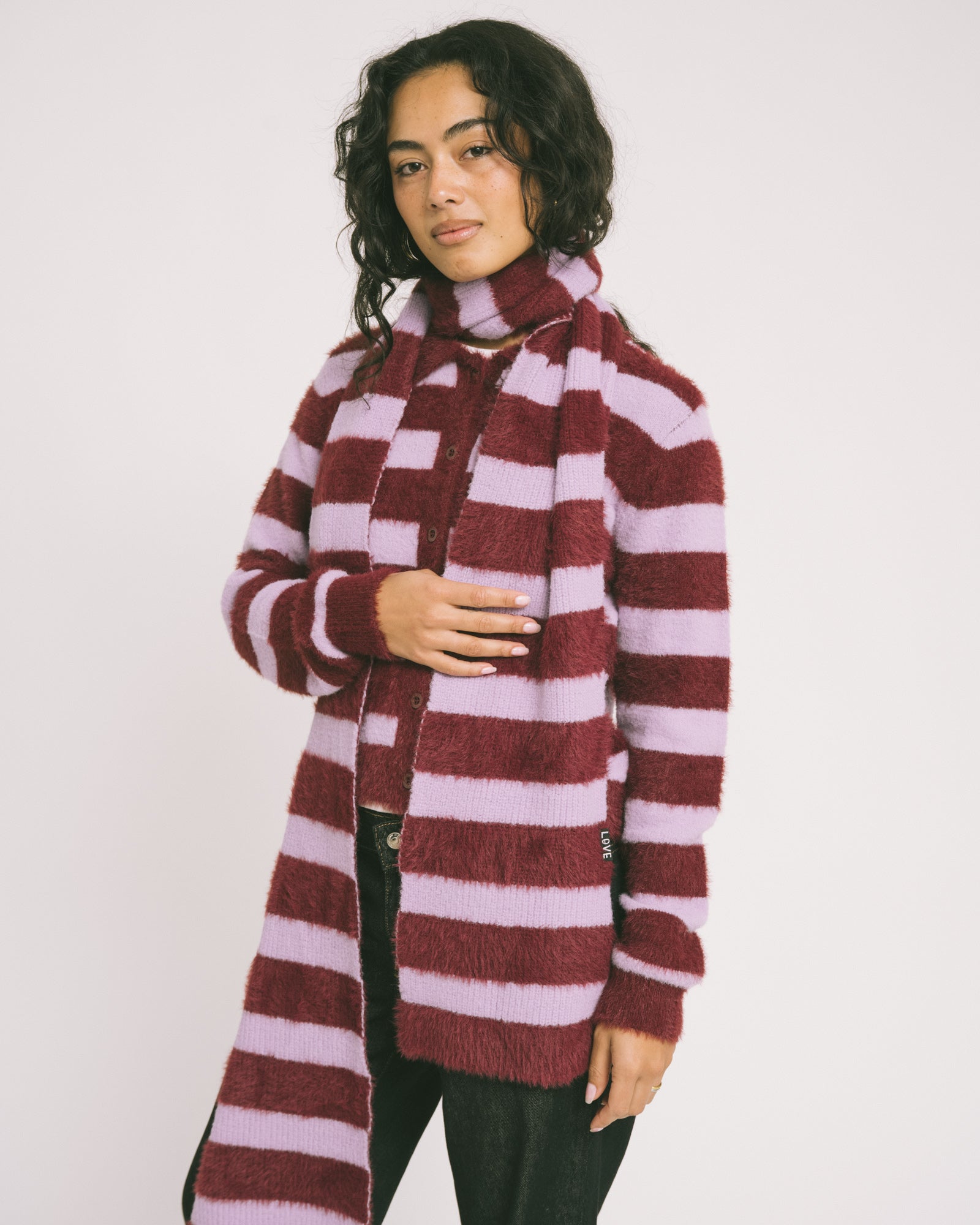 A soft, slightly fuzzy scarf with striking lilac-burgundy stripes. Perfect for pairing with the matching sweater and scarf!
