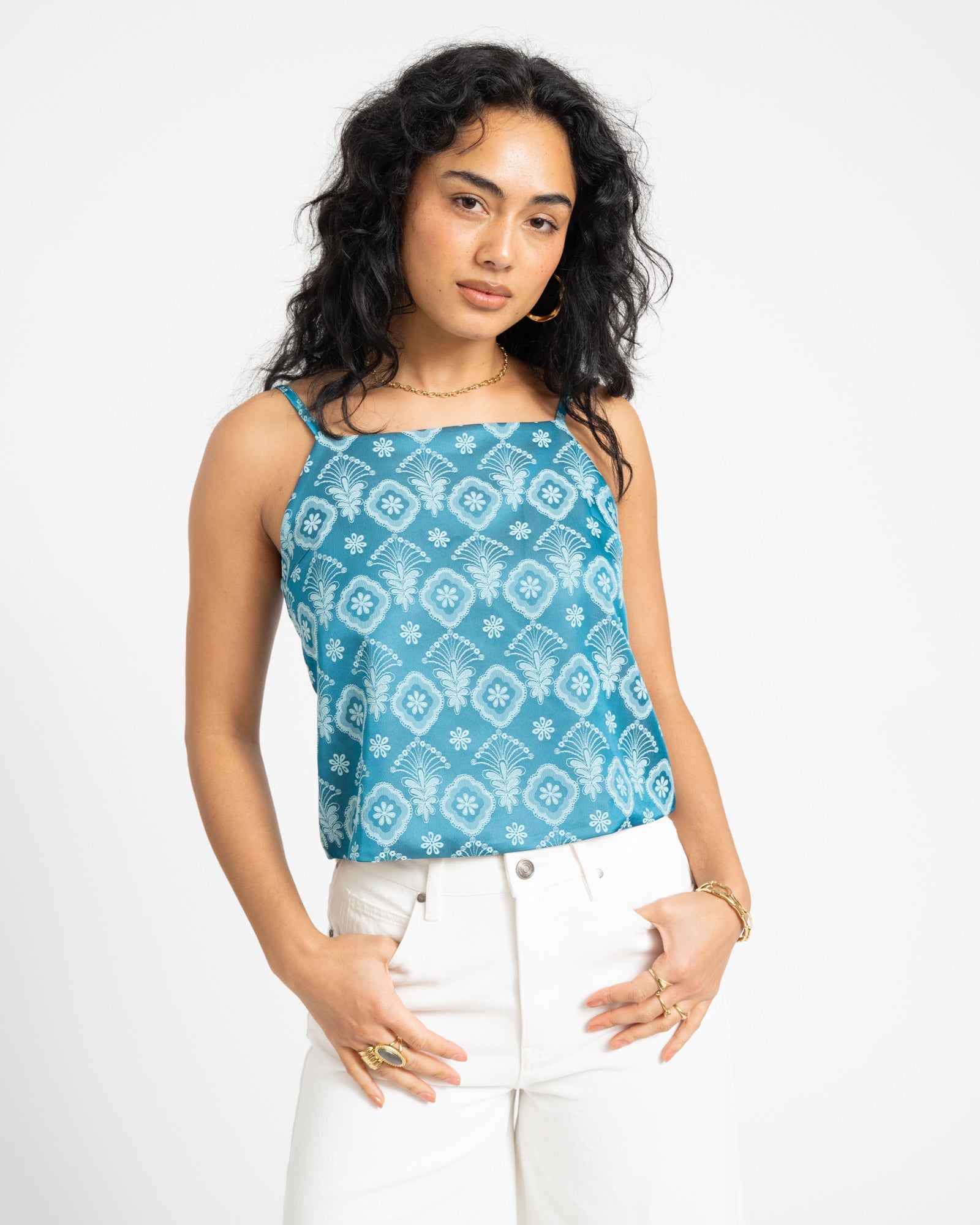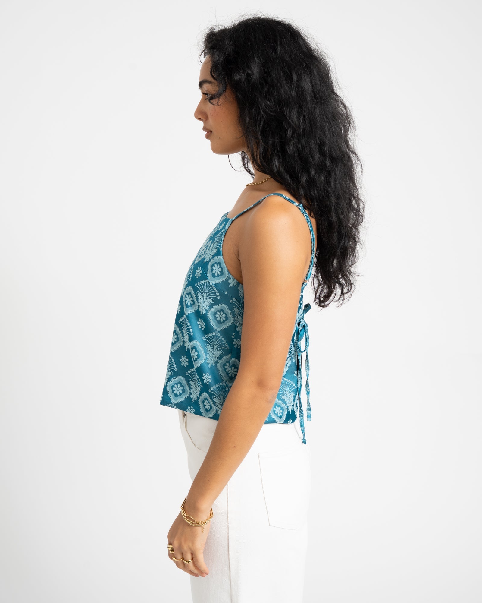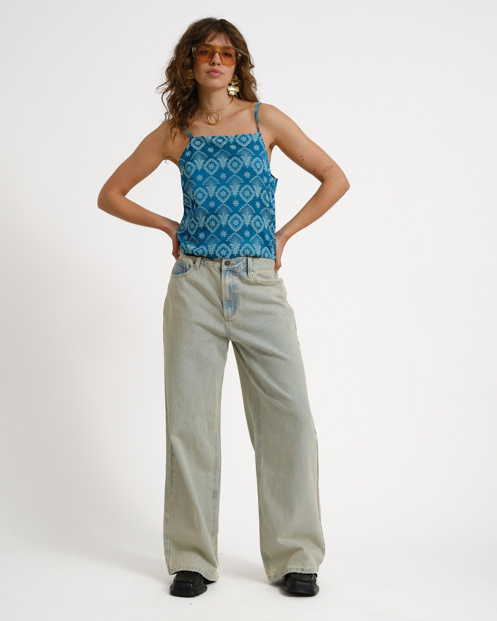 The TILTIL Cloe Top in blue is a minimalistic, feminine top with a straight neckline and thin spaghetti straps. The open back with a tie detail adds a playful touch and makes the fit adjustable.