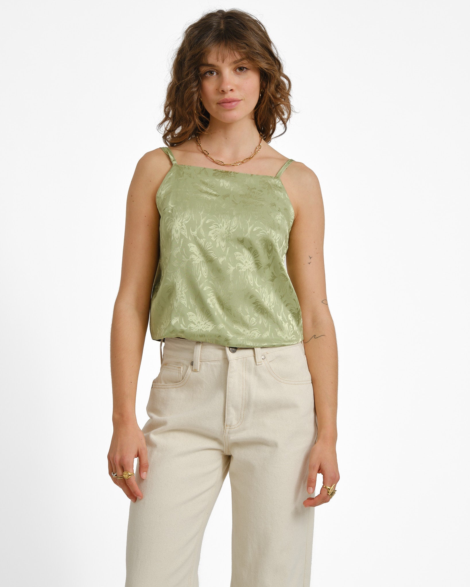 The TILTIL Cloe Top in green is a minimalist, feminine top with a straight neckline and thin spaghetti straps. The open back with a tie detail adds a playful touch and makes the fit adjustable.