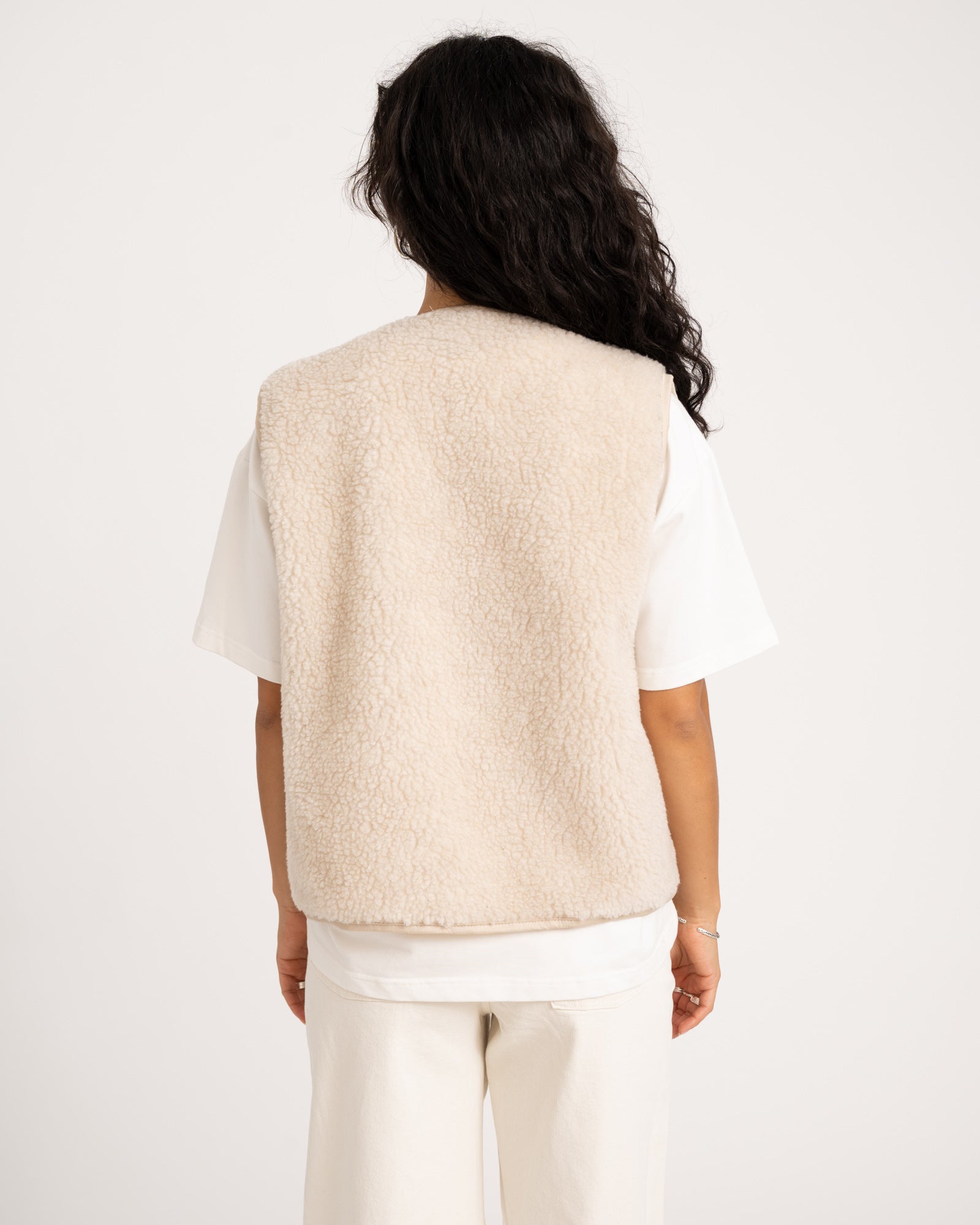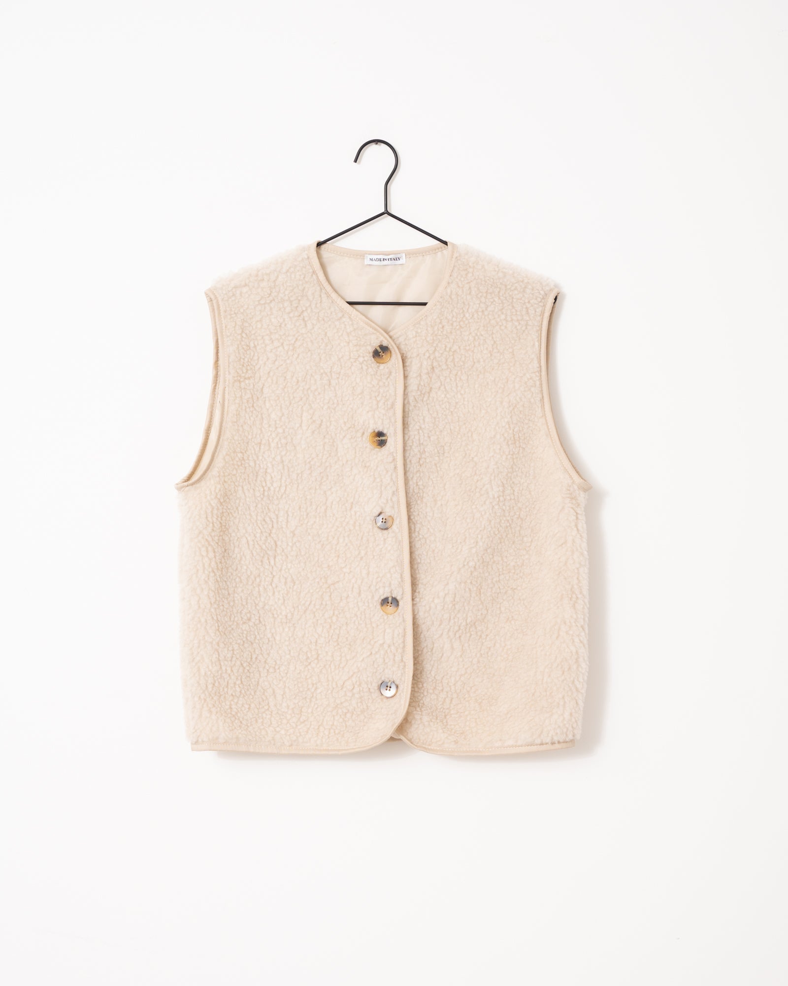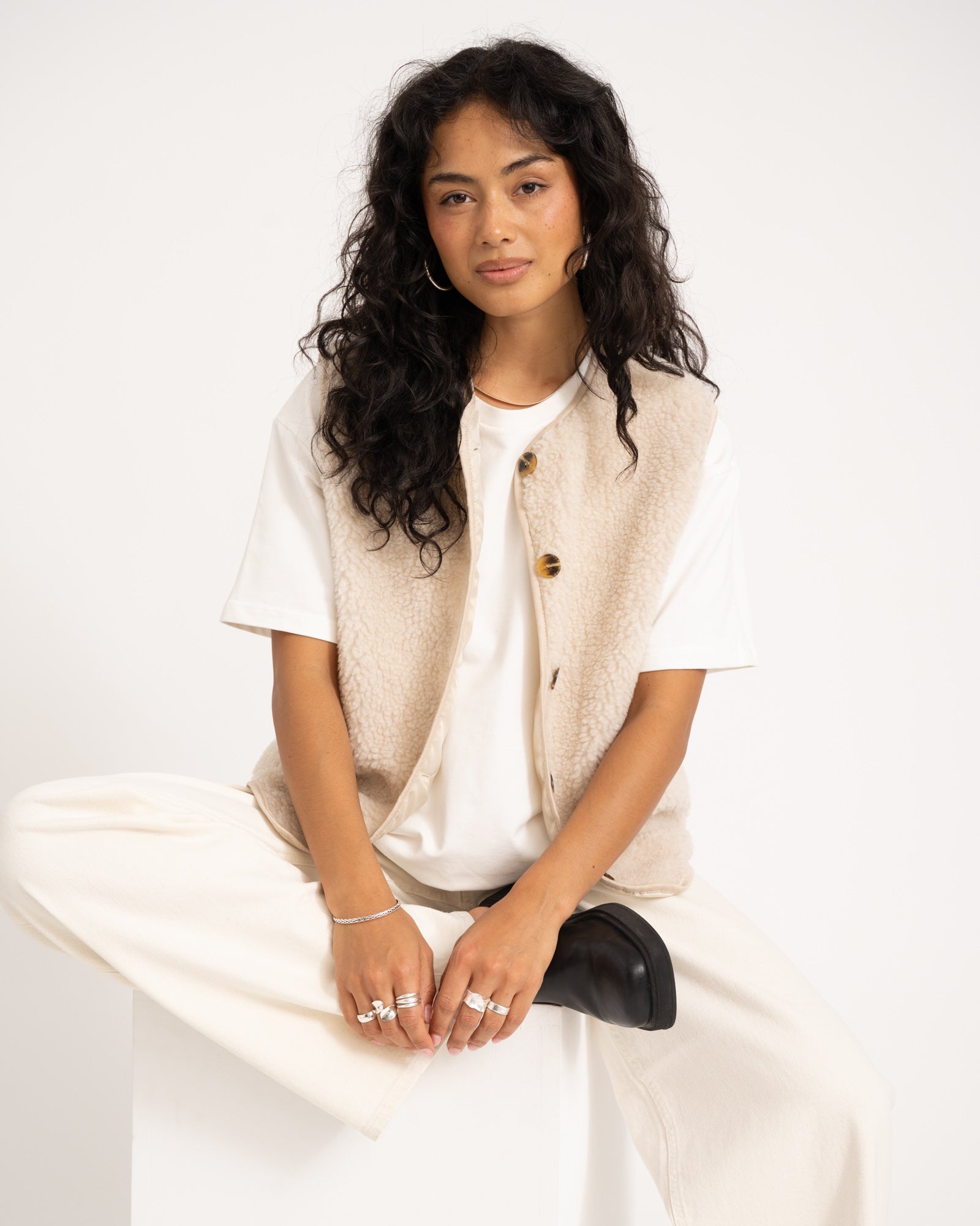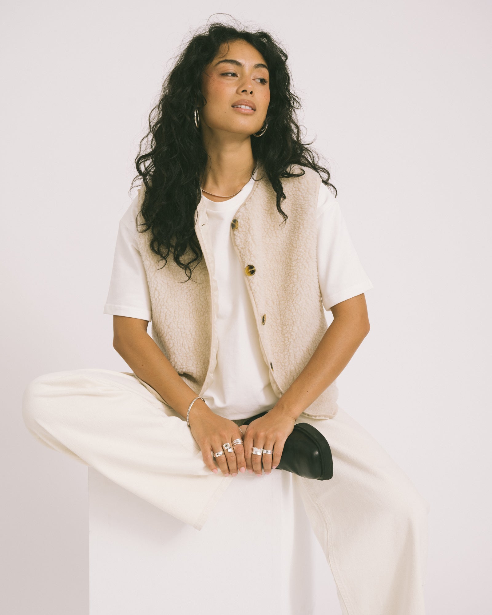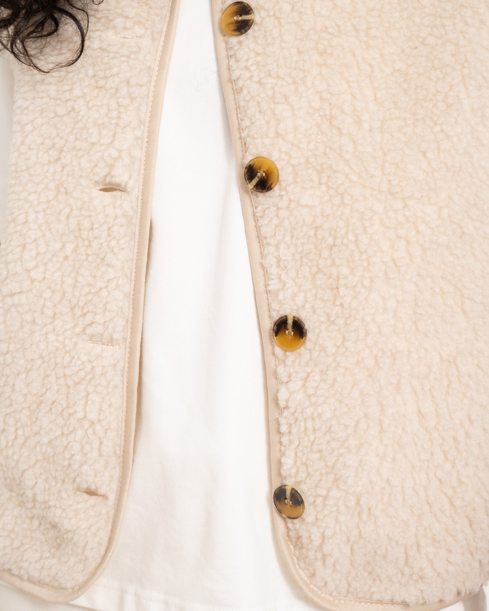 An off-white teddy vest with a beautiful finish and button closure. Pair it with all your basics.