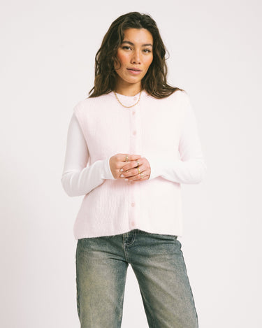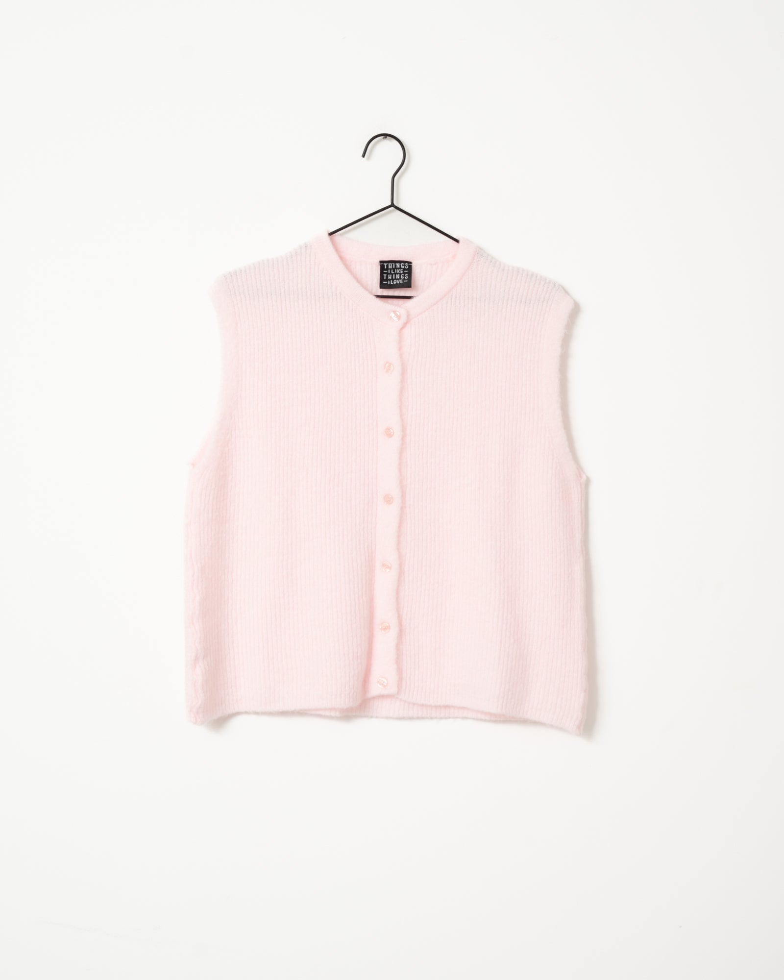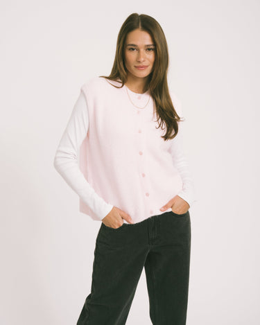 This sleeveless, ribbed cardigan in light pink is wonderfully soft and has a slightly longer fit. With matching buttons at the front, you can wear it open or closed.