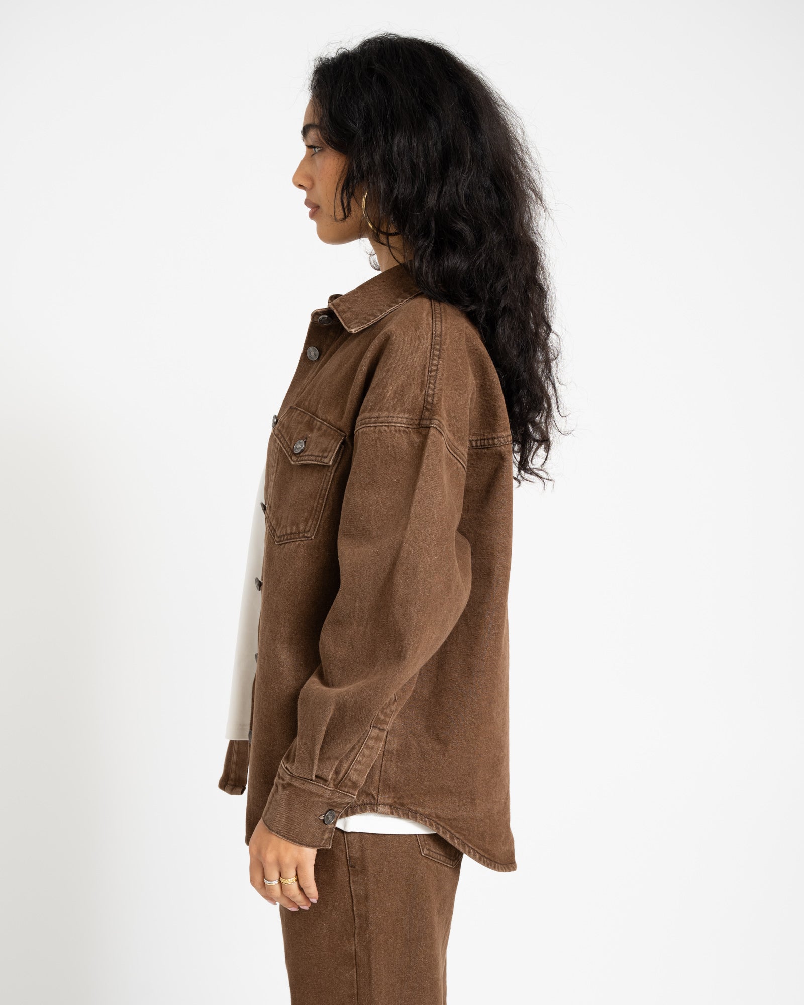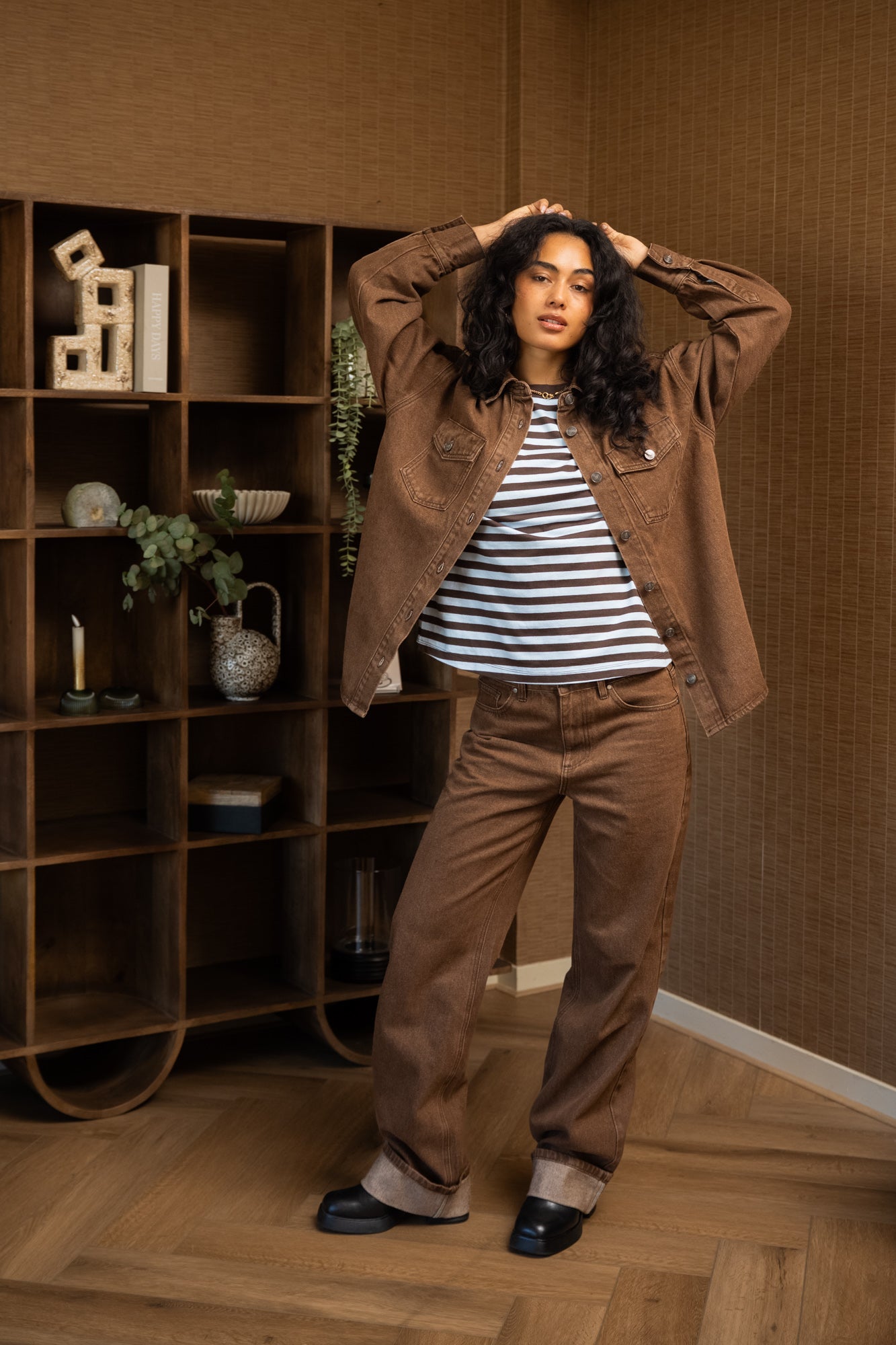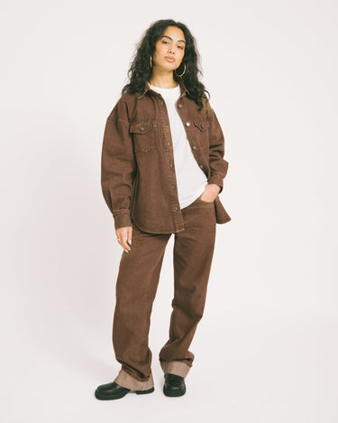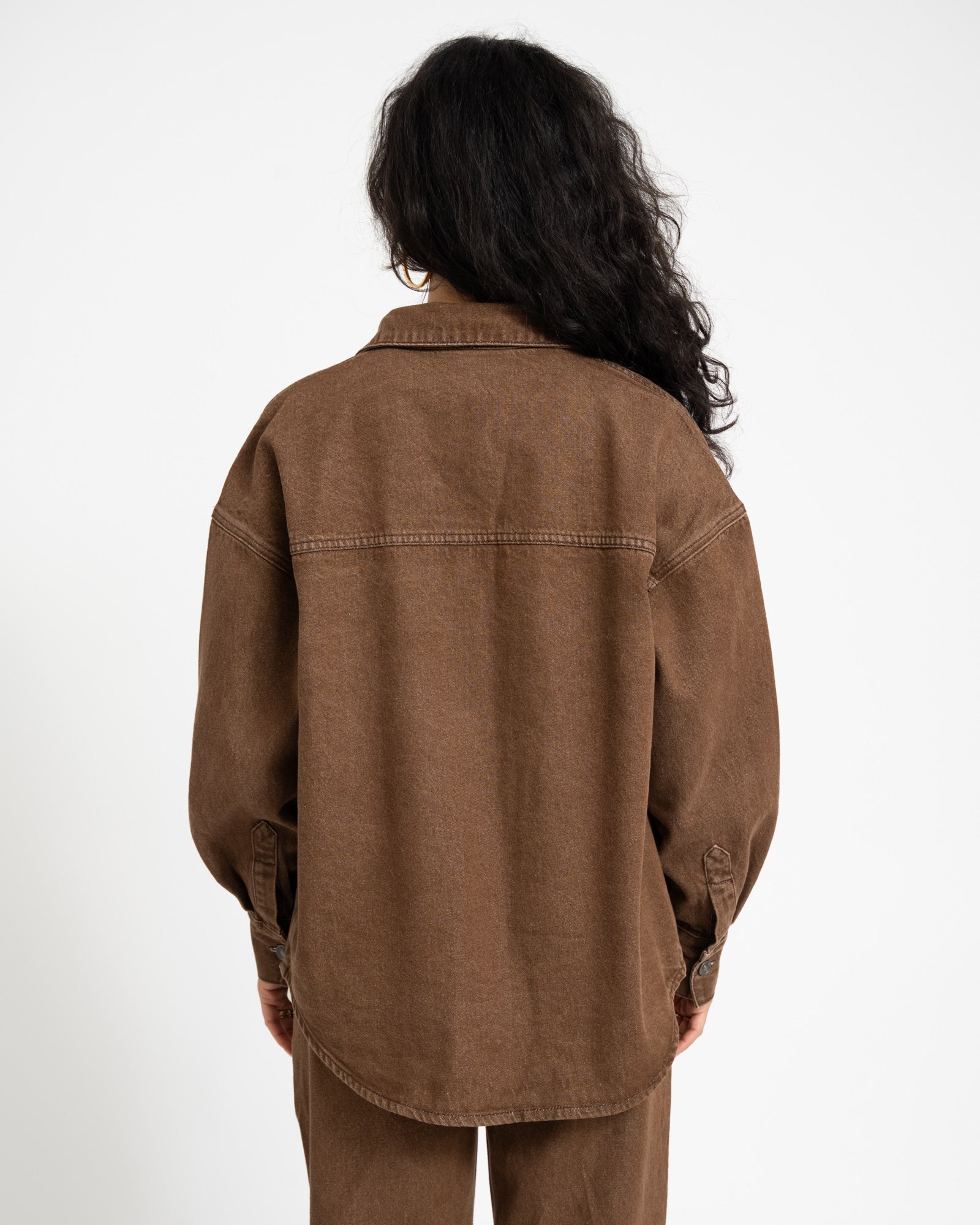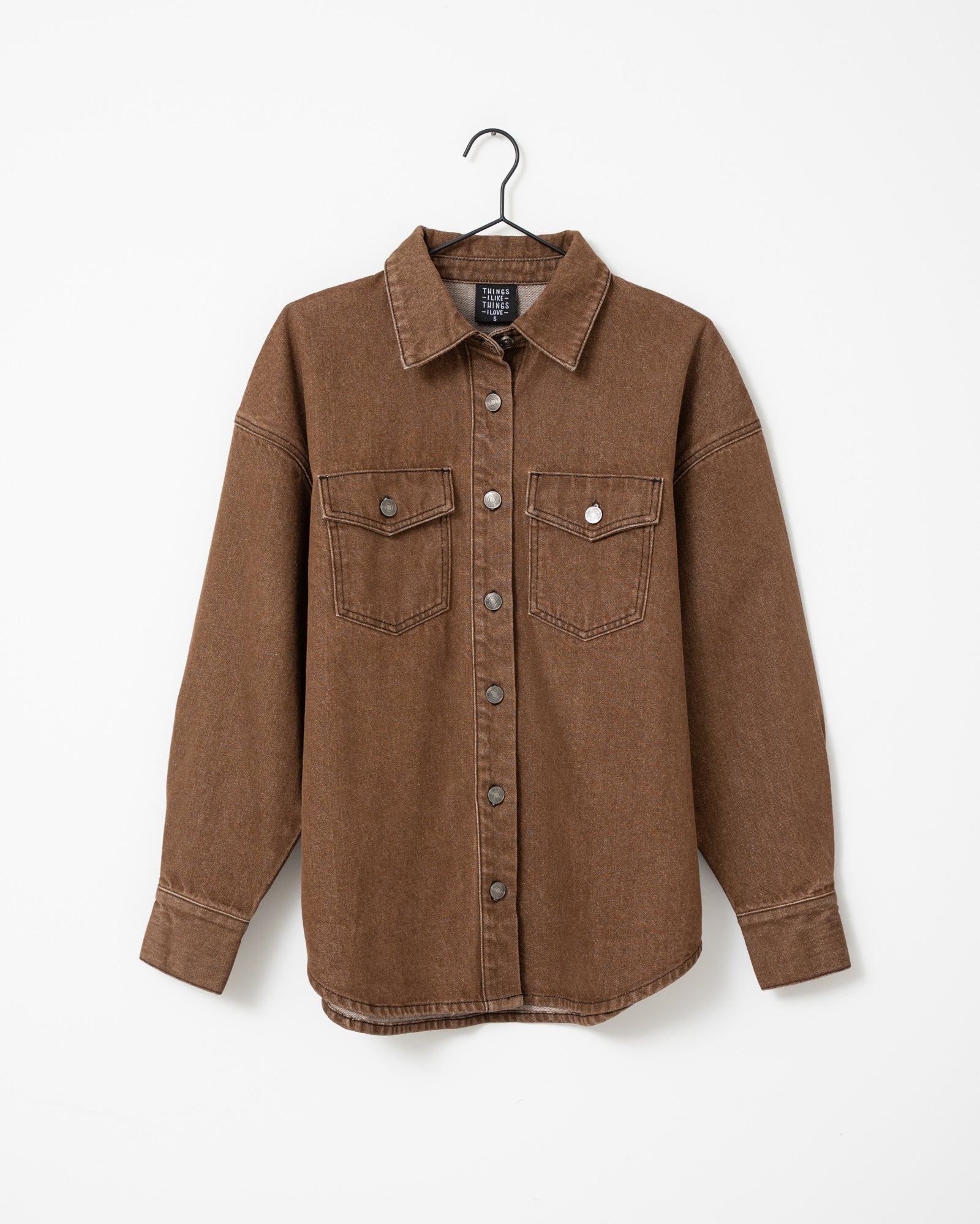 A denim classic with a modern fit. This brown blouse features matching brown stitching, a collar, two chest pockets, and a button closure. The oversized fit creates a relaxed, effortless look.