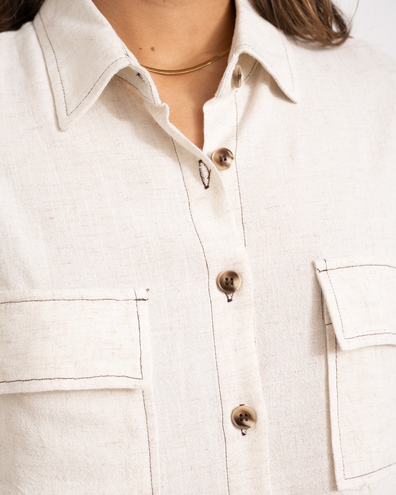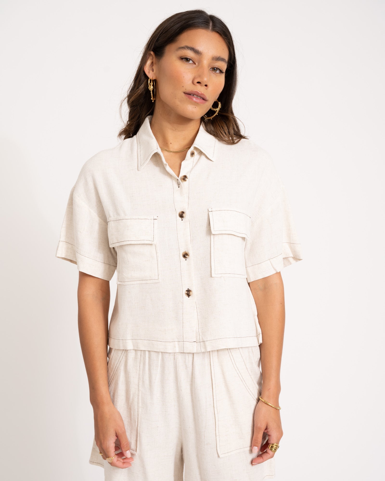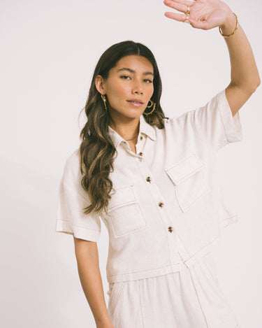 Linen is our go-to this summer! A breezy, cropped blouse with a loose fit.