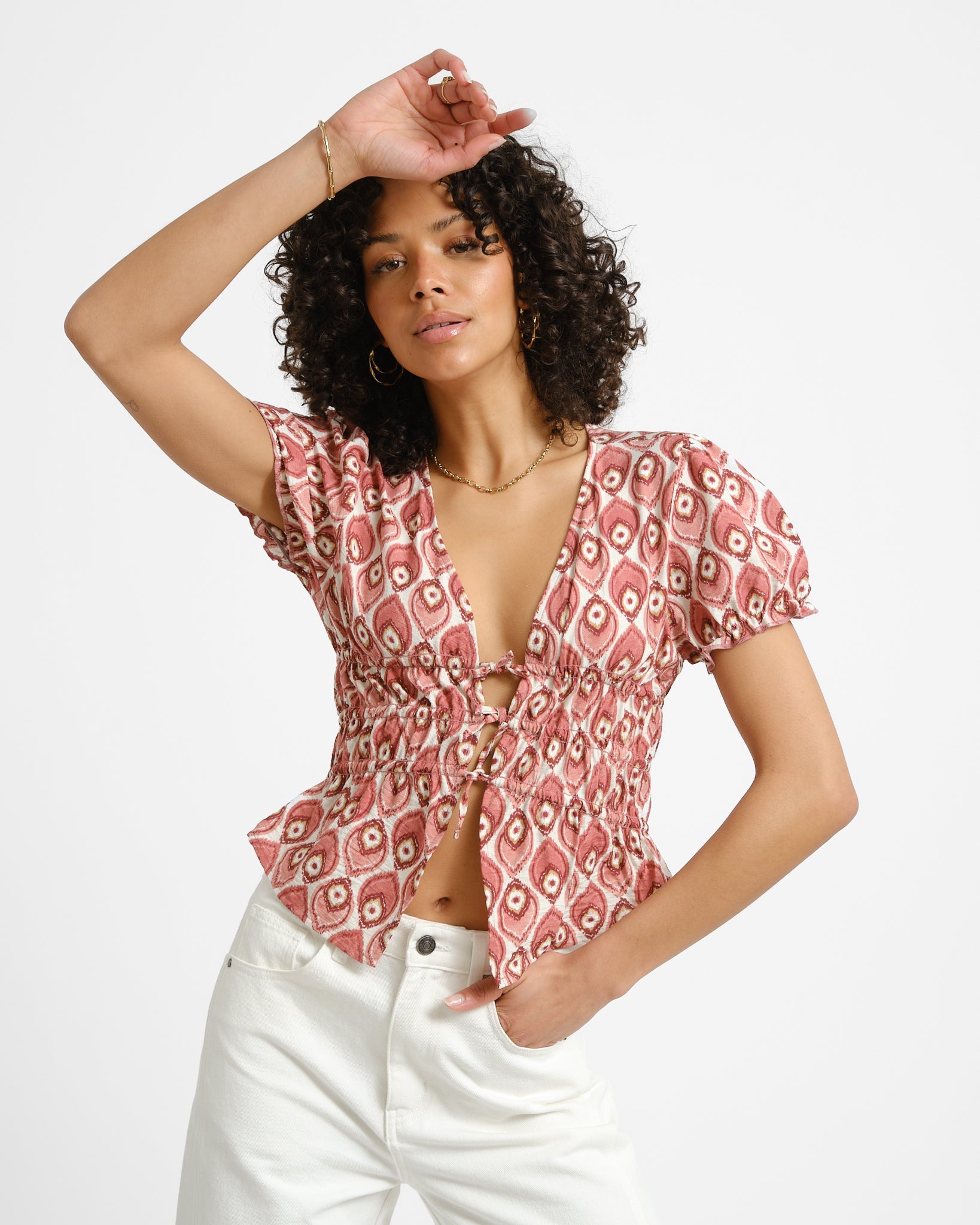 The Erla blouse is one of those items that instantly completes your outfit. The pink print and subtle details on the front give it just enough character without being too busy.