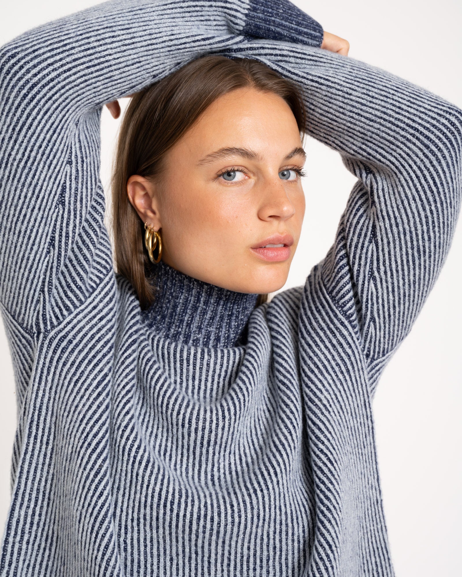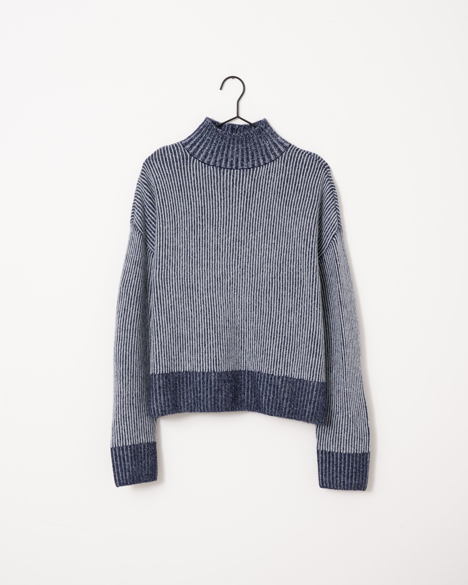 A soft knitted sweater with a relaxed fit and a modern mockneck. The subtle color contrast at the neck, cuffs, and hem gives this classic a fresh twist.