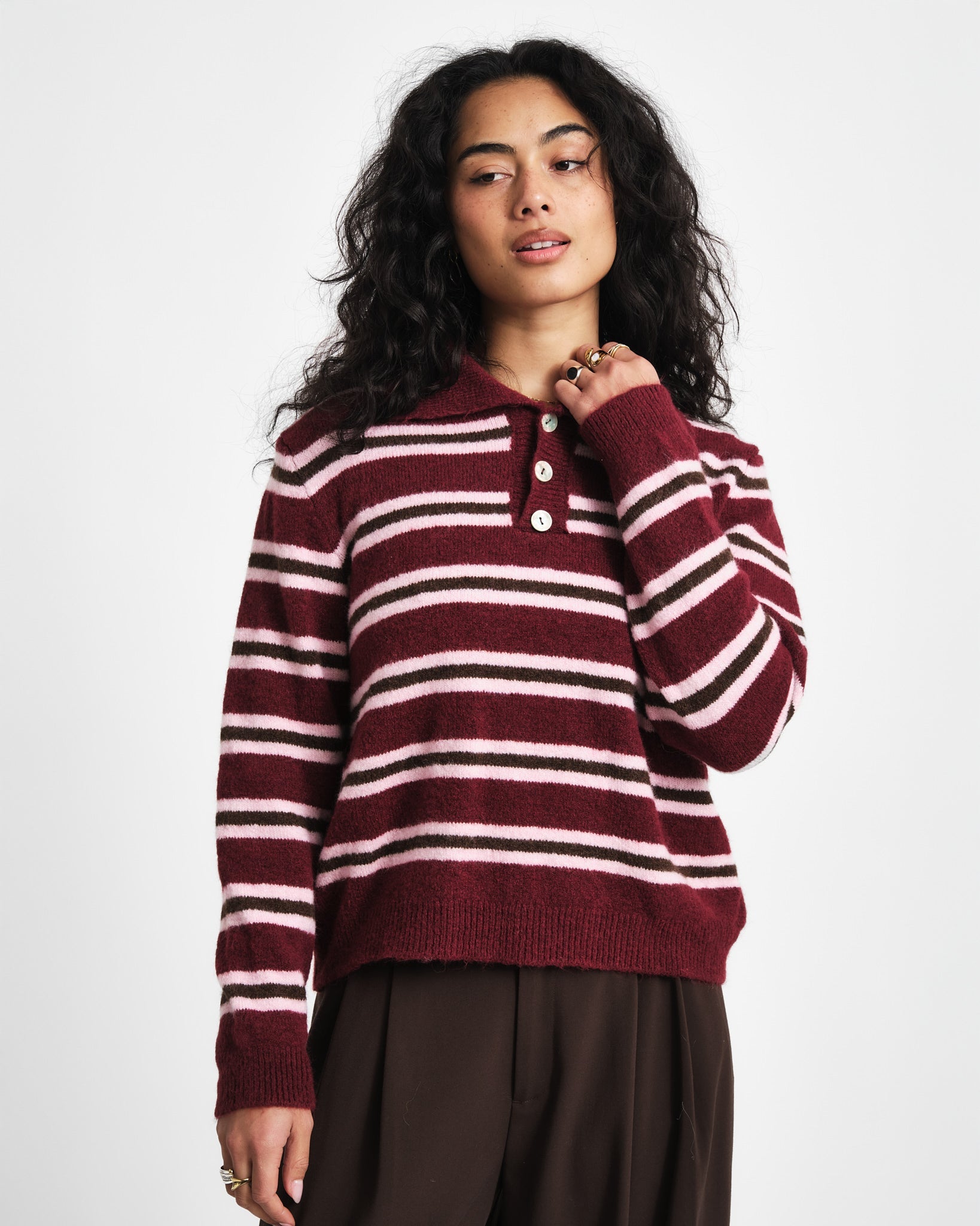Zo’n knit waar je meteen verliefd op wordt. Zacht, cozy en met die bordeaux-roze strepen die elke outfit instant personality geven. One of those pieces you keep grabbing.