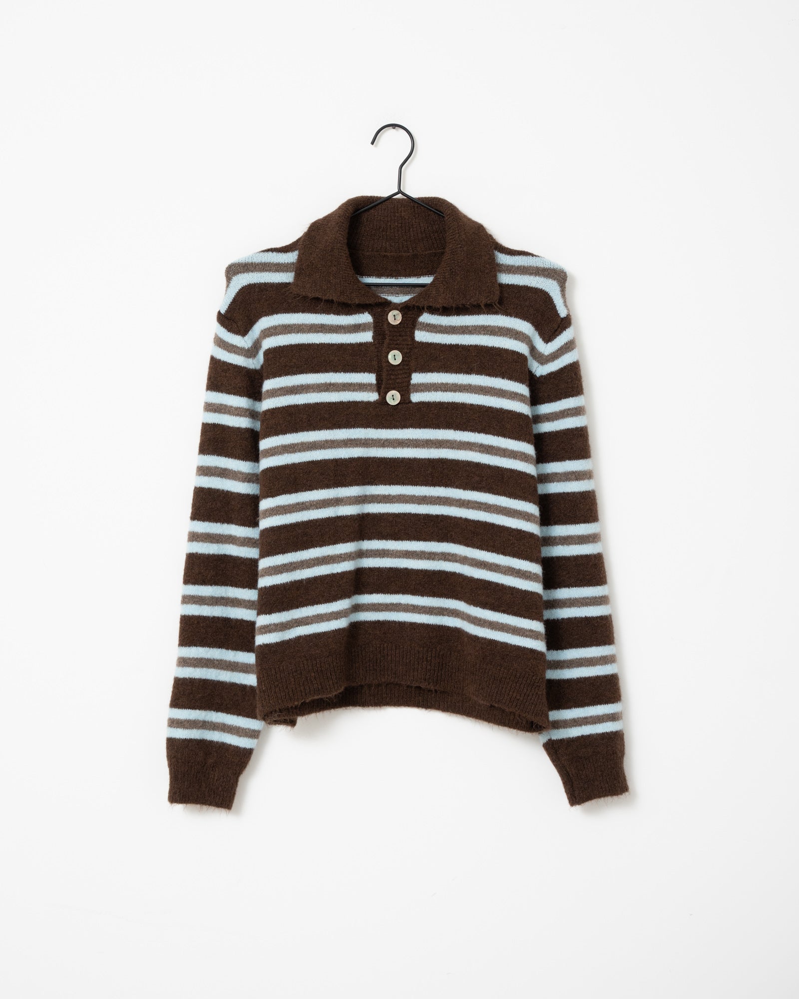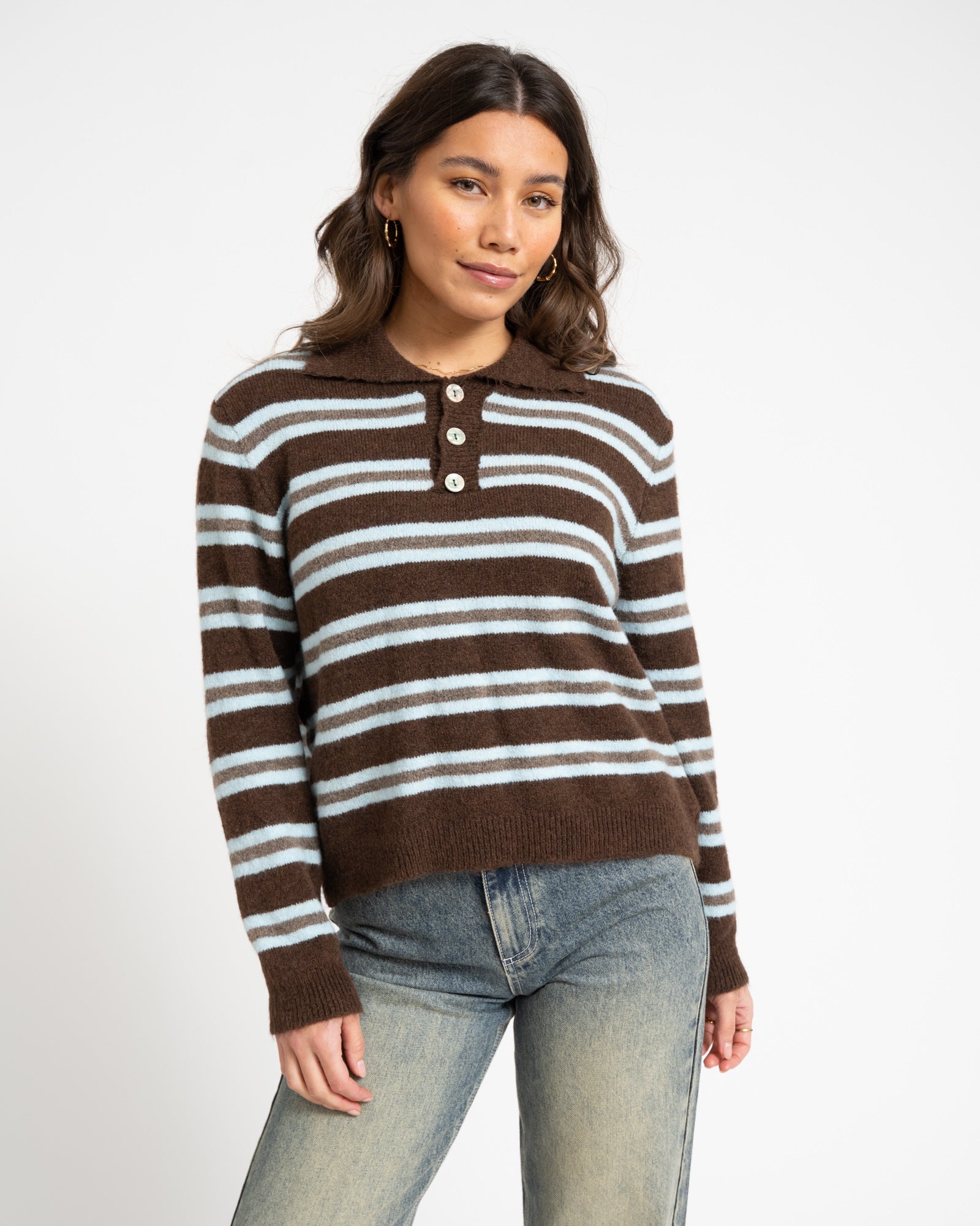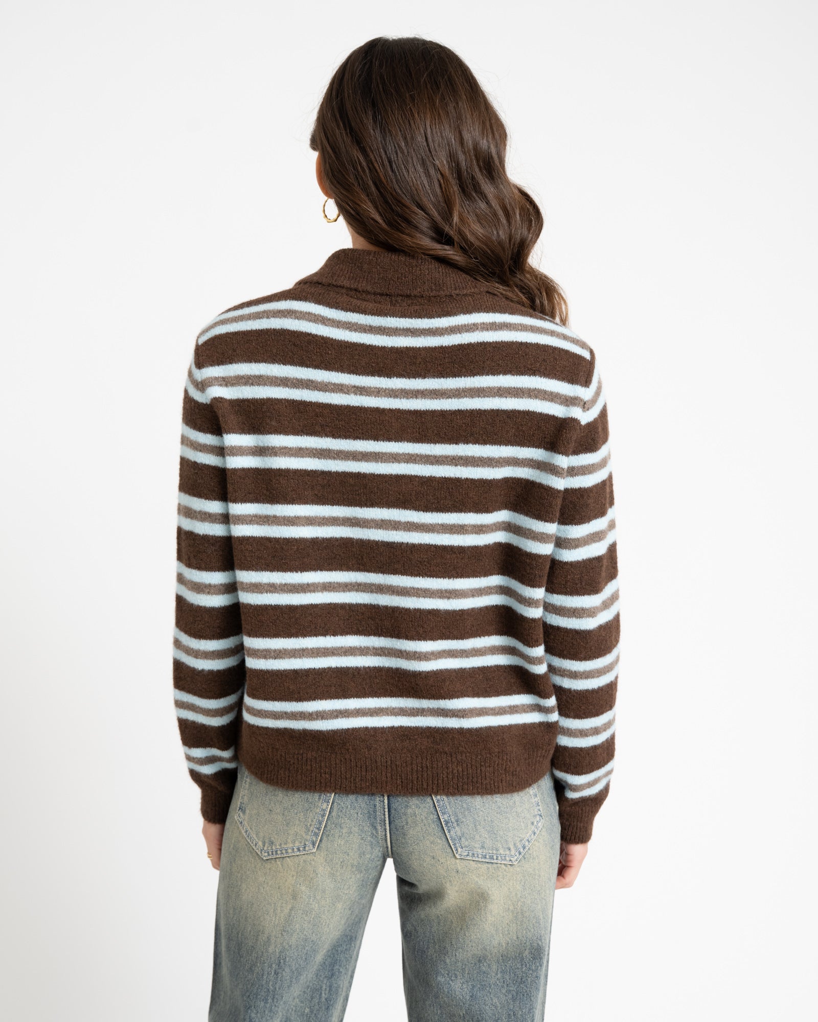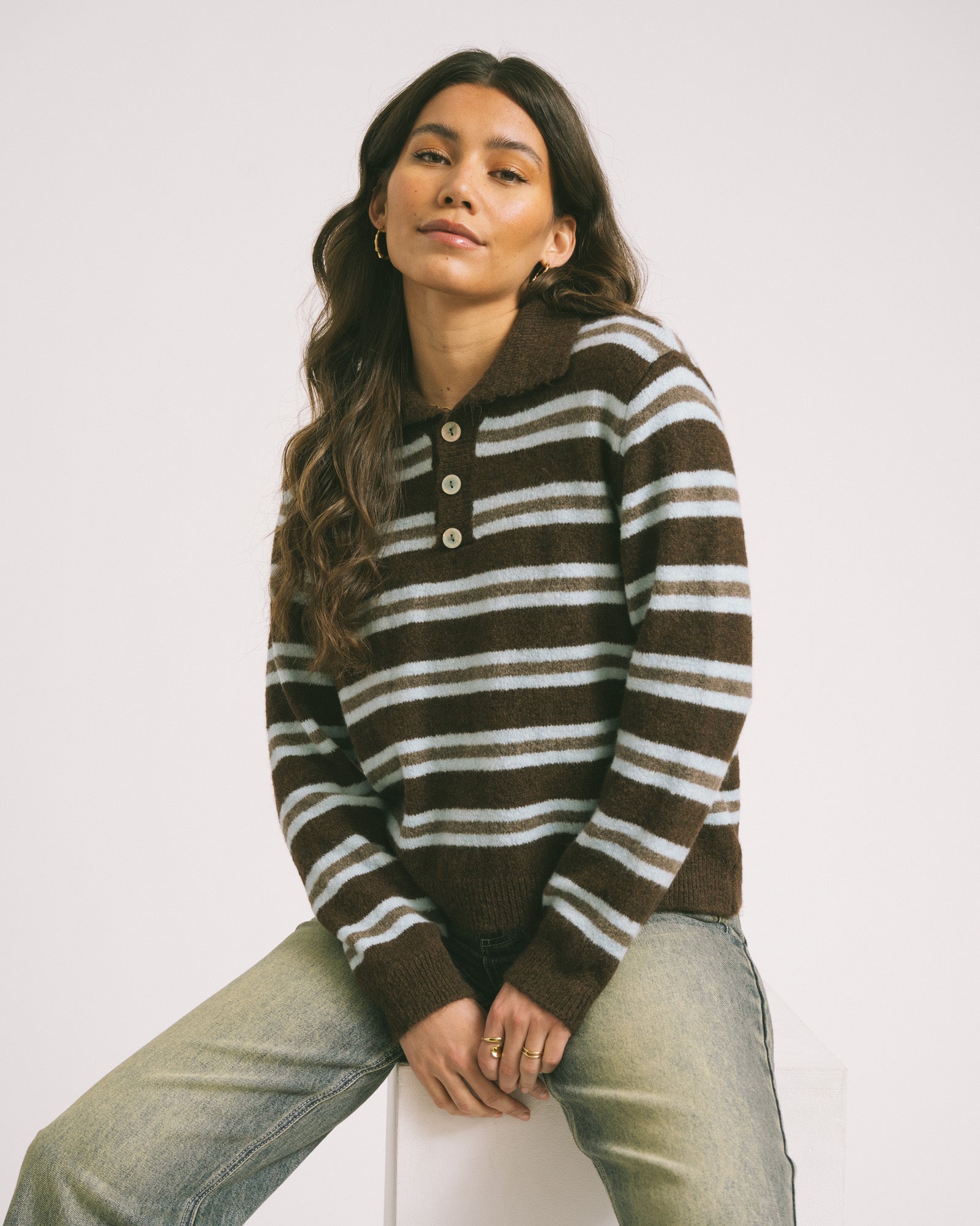 A knit you'll instantly fall in love with. Soft, cozy, and with those brown-blue stripes that instantly add personality to any outfit. One of those pieces you'll keep grabbing.