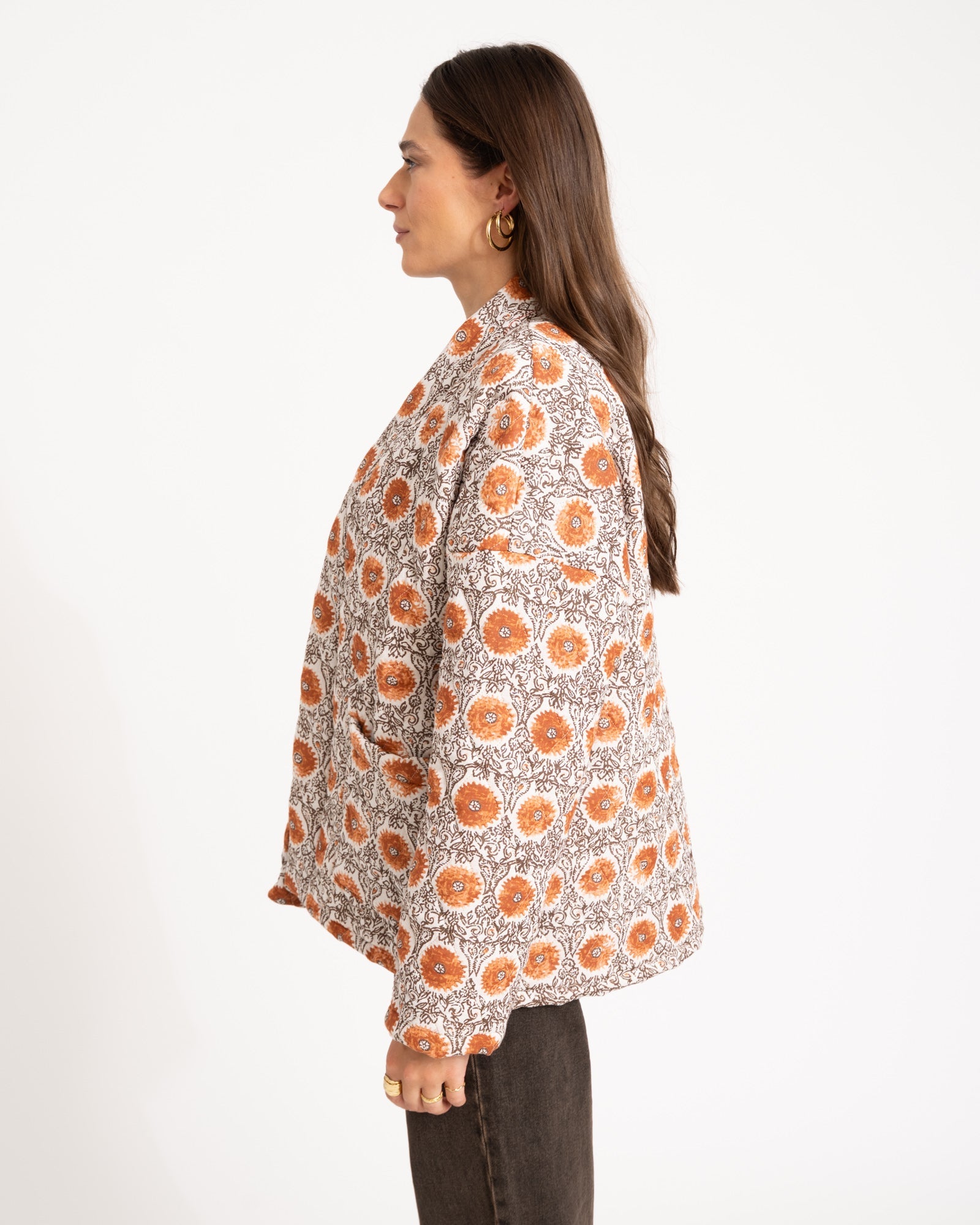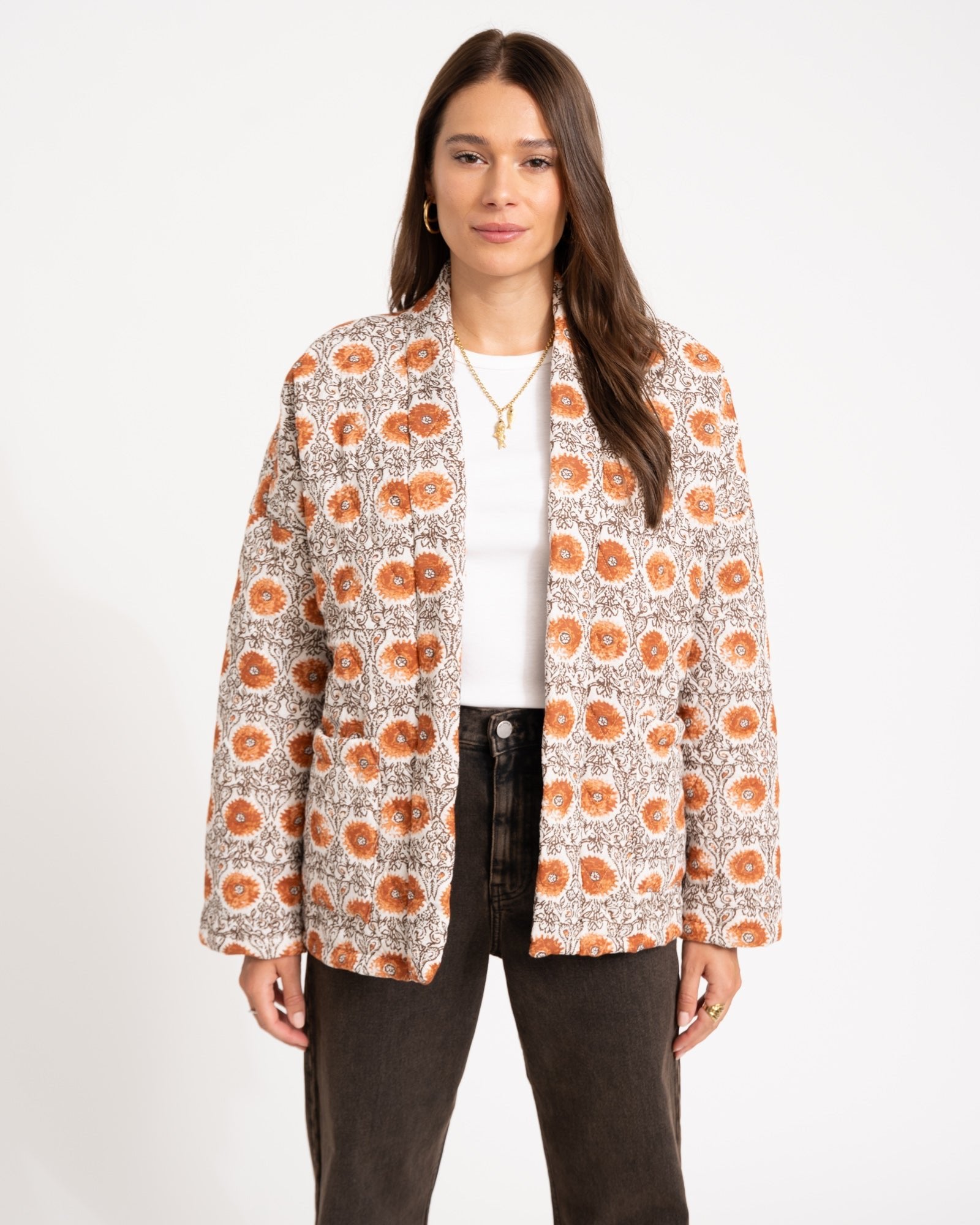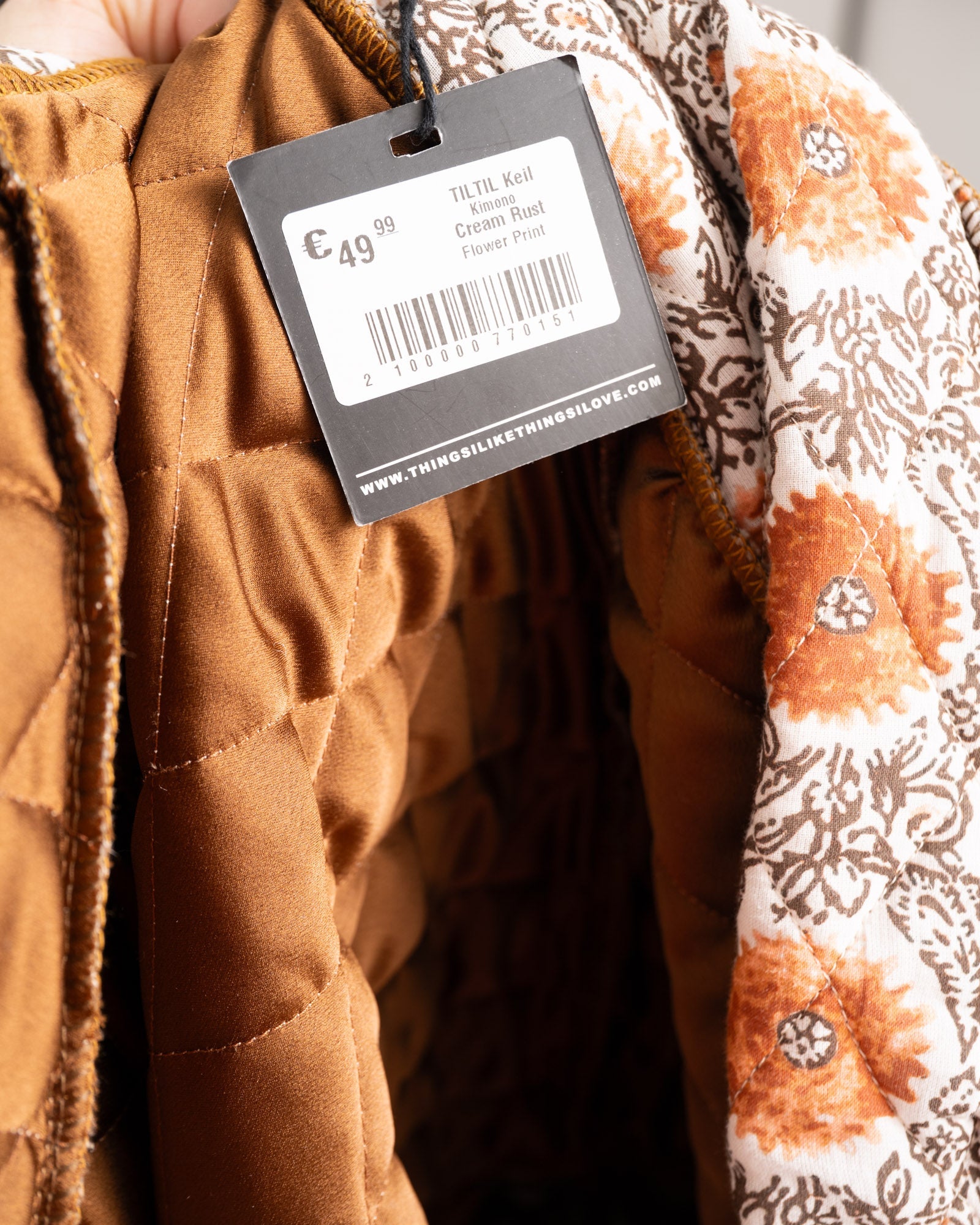 Eye-catcher alert! A padded kimono with open fit, dropped shoulders and jacket pockets. Also a beautiful print over the entire kimono, available in multiple colors.