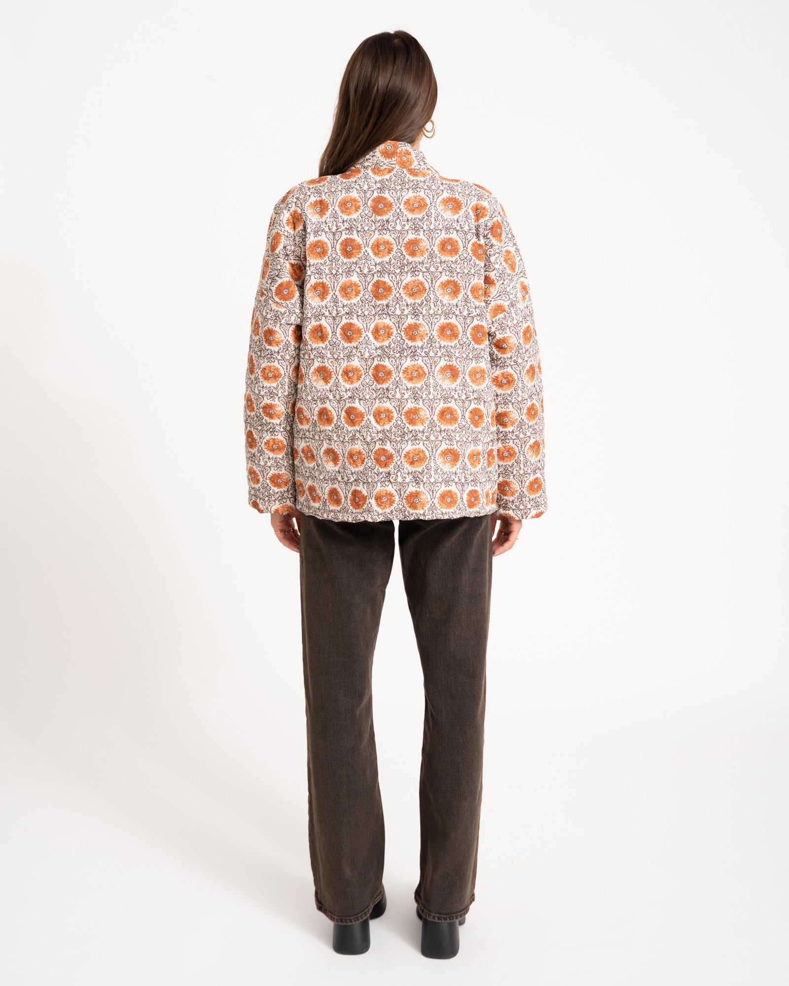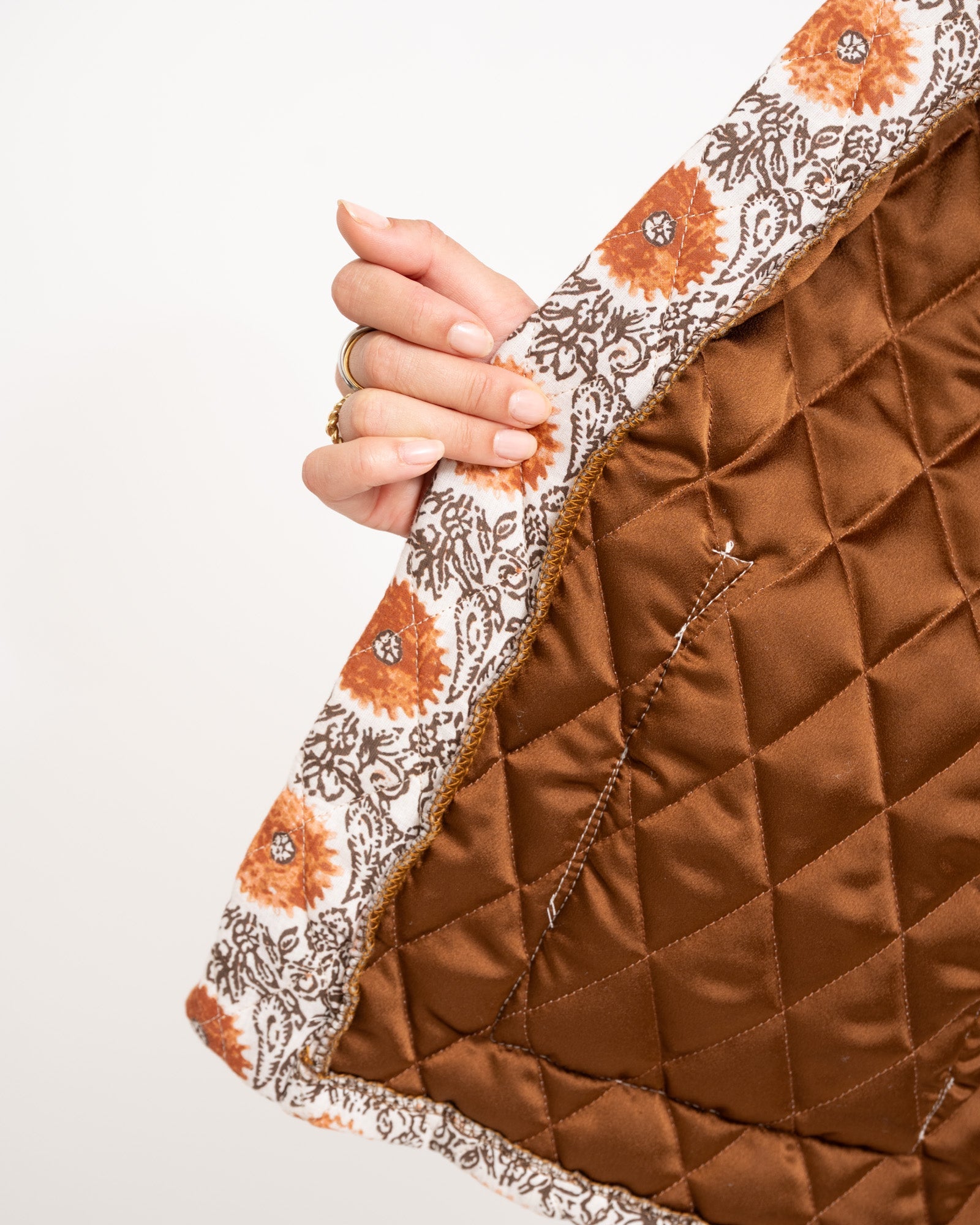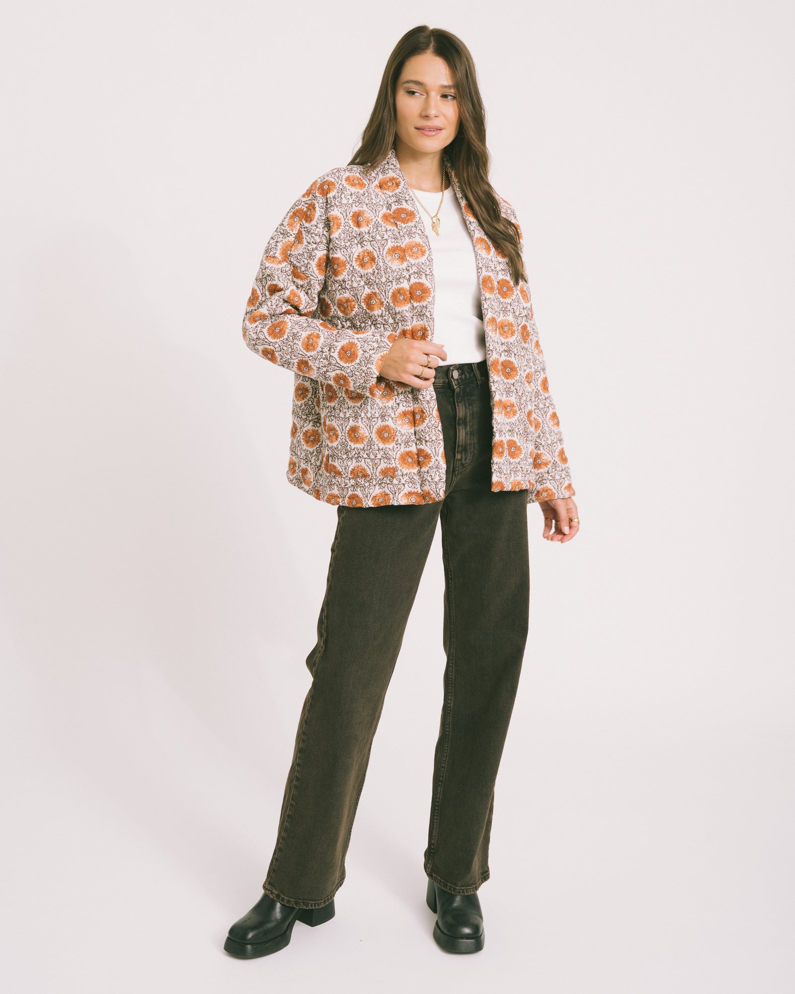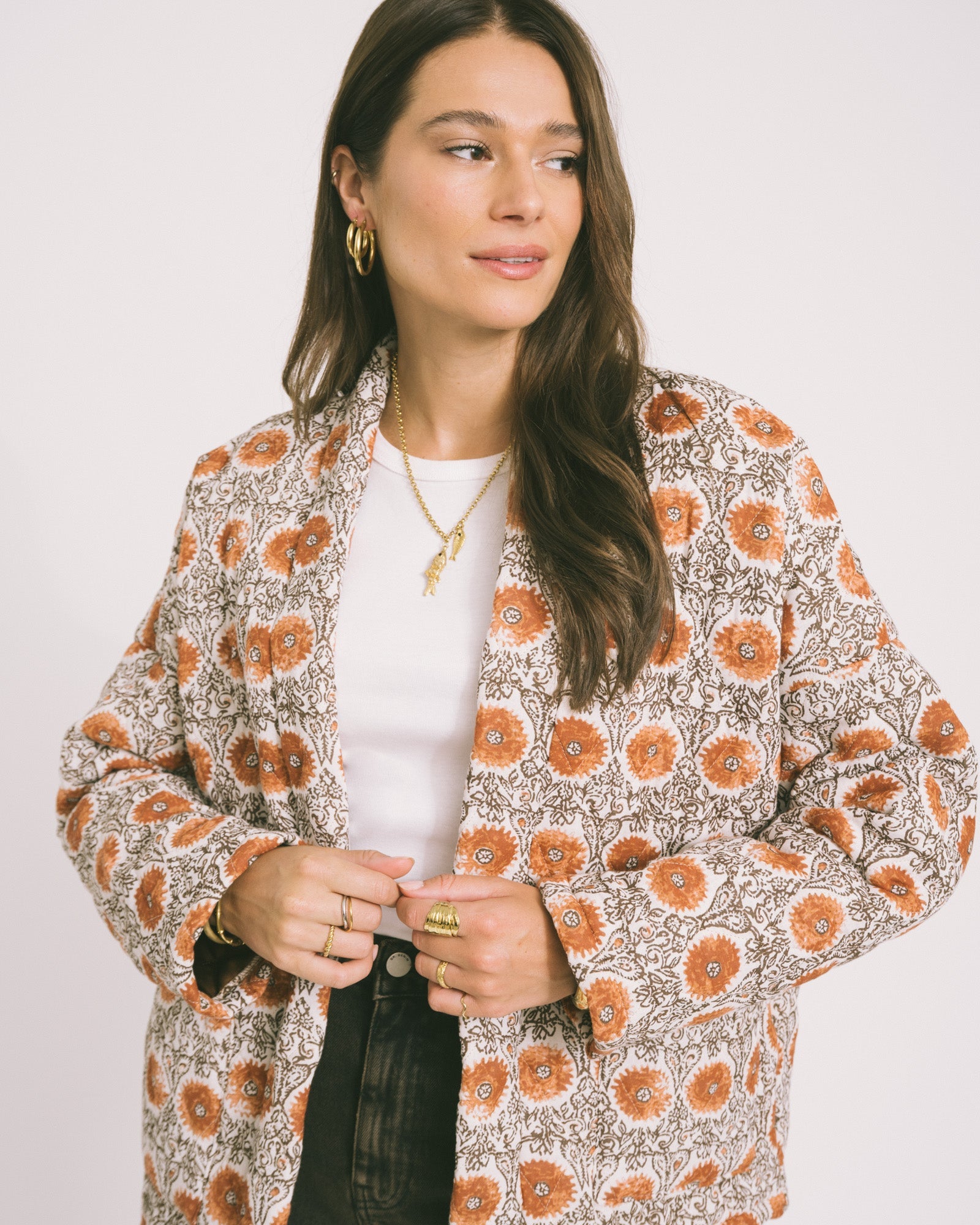 Eye-catcher alert! A padded kimono with open fit, dropped shoulders and jacket pockets. Also a beautiful print over the entire kimono, available in multiple colors.