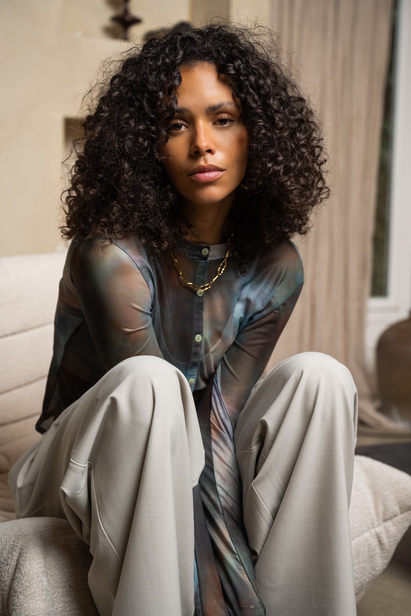 This mesh top with a refined print is perfect for adding a touch of flair to your outfit. The fitted cut and button closure create a feminine and contemporary look. It's ideal for mixing and matching, from casual to chic.