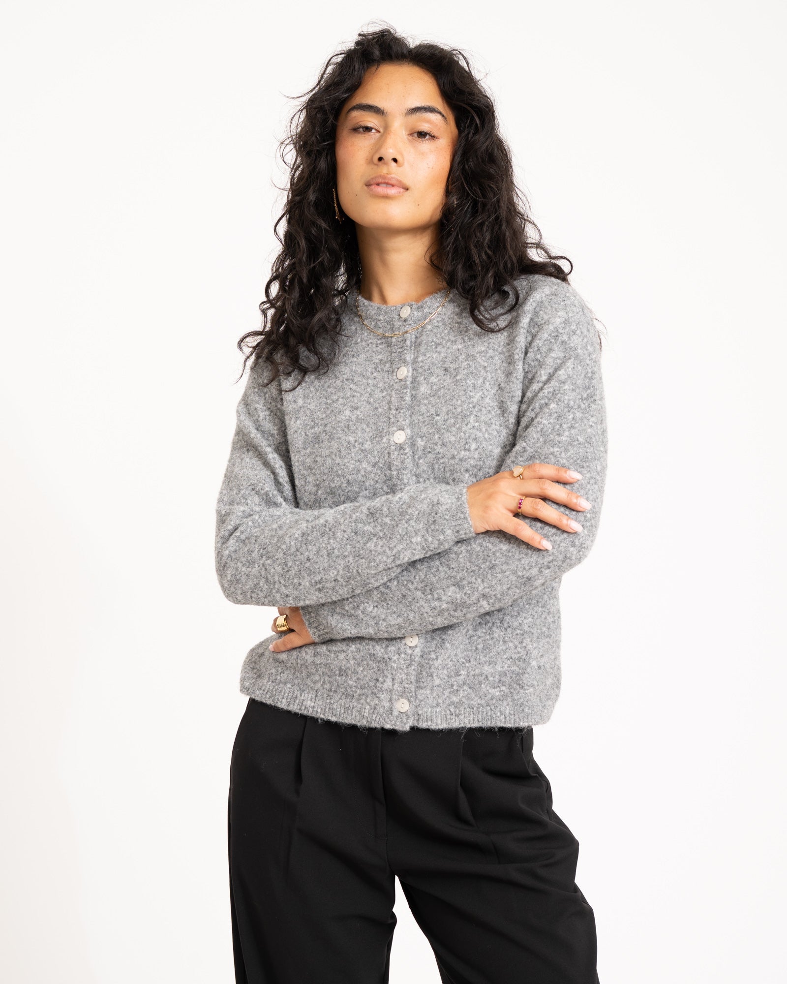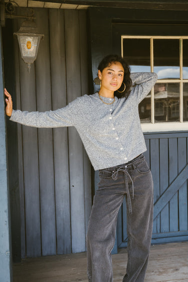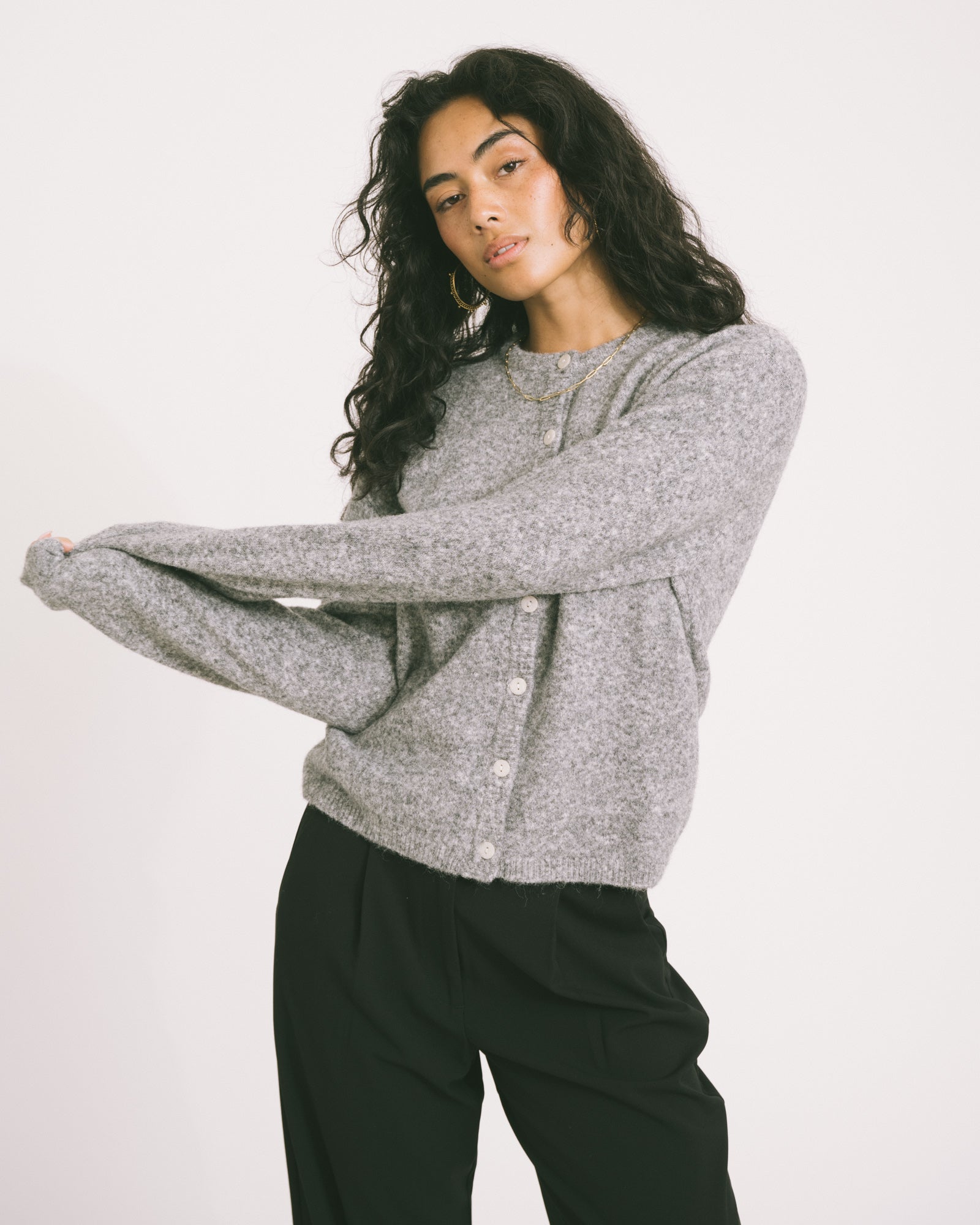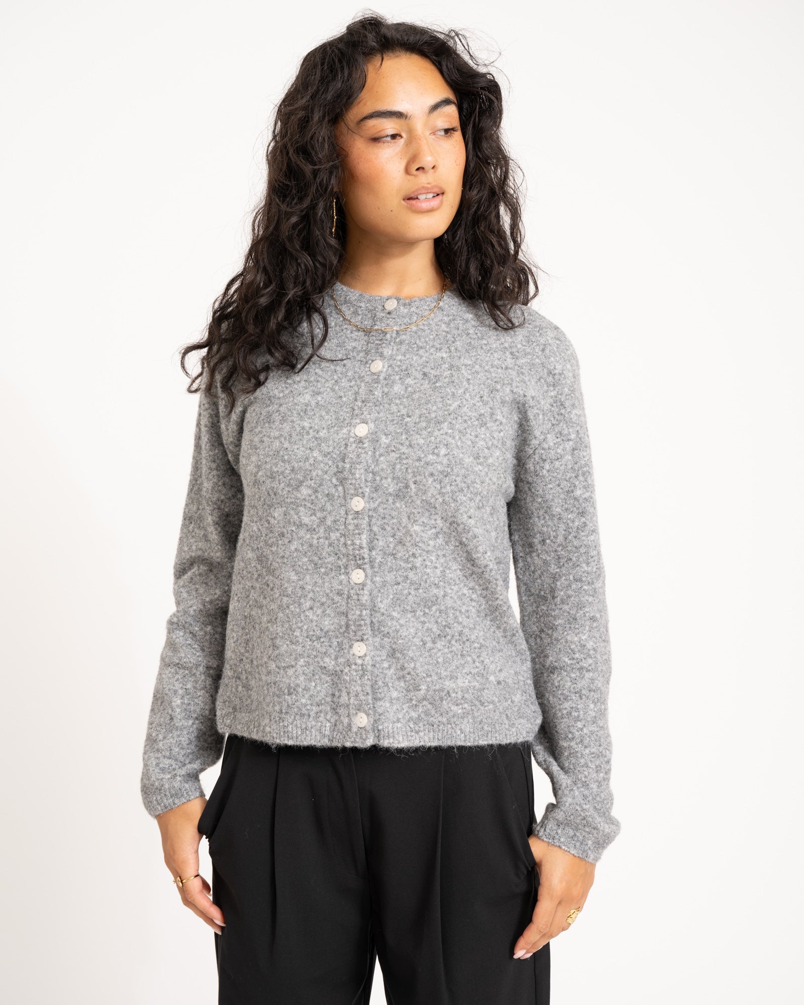 The Mona Cardigan is a super soft must-have for colder days. Made in a grey melange fabric with a button closure, so you can wear it open or closed.