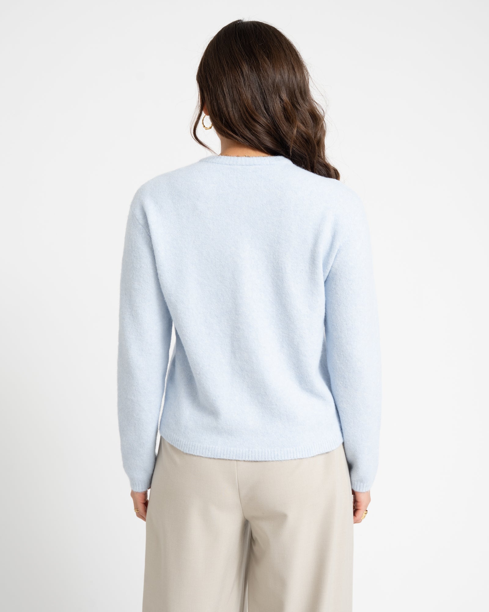 The Mona Cardigan is a super-soft must-have for colder days. Made from a light blue fabric with a white button closure, you can wear it open or closed.