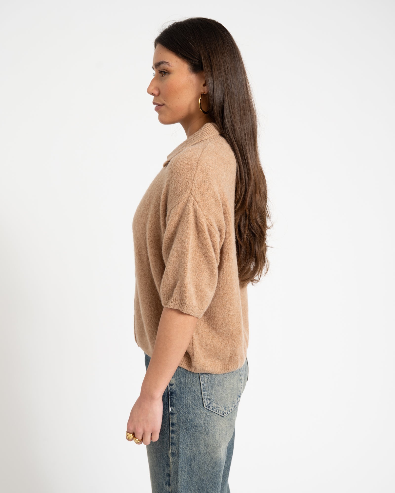 Soft, stretchy, and completely fall-proof. This half-sleeved knit features a collar, a button placket with white buttons, and a comfortable fit.