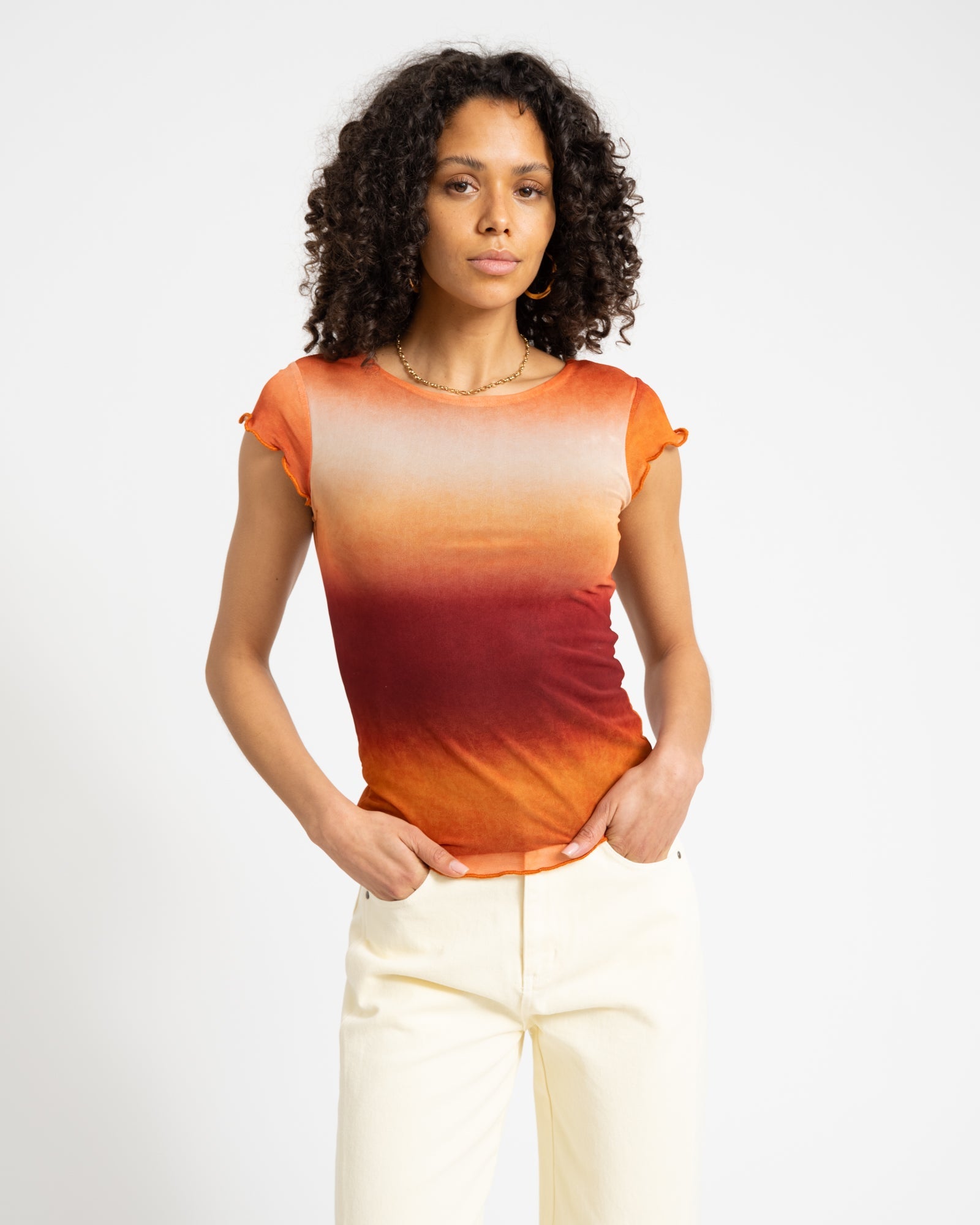 Orange top with a subtle color gradient for a warm, summery look. The fitted design and soft fabric make it perfect for everyday wear. 🧡