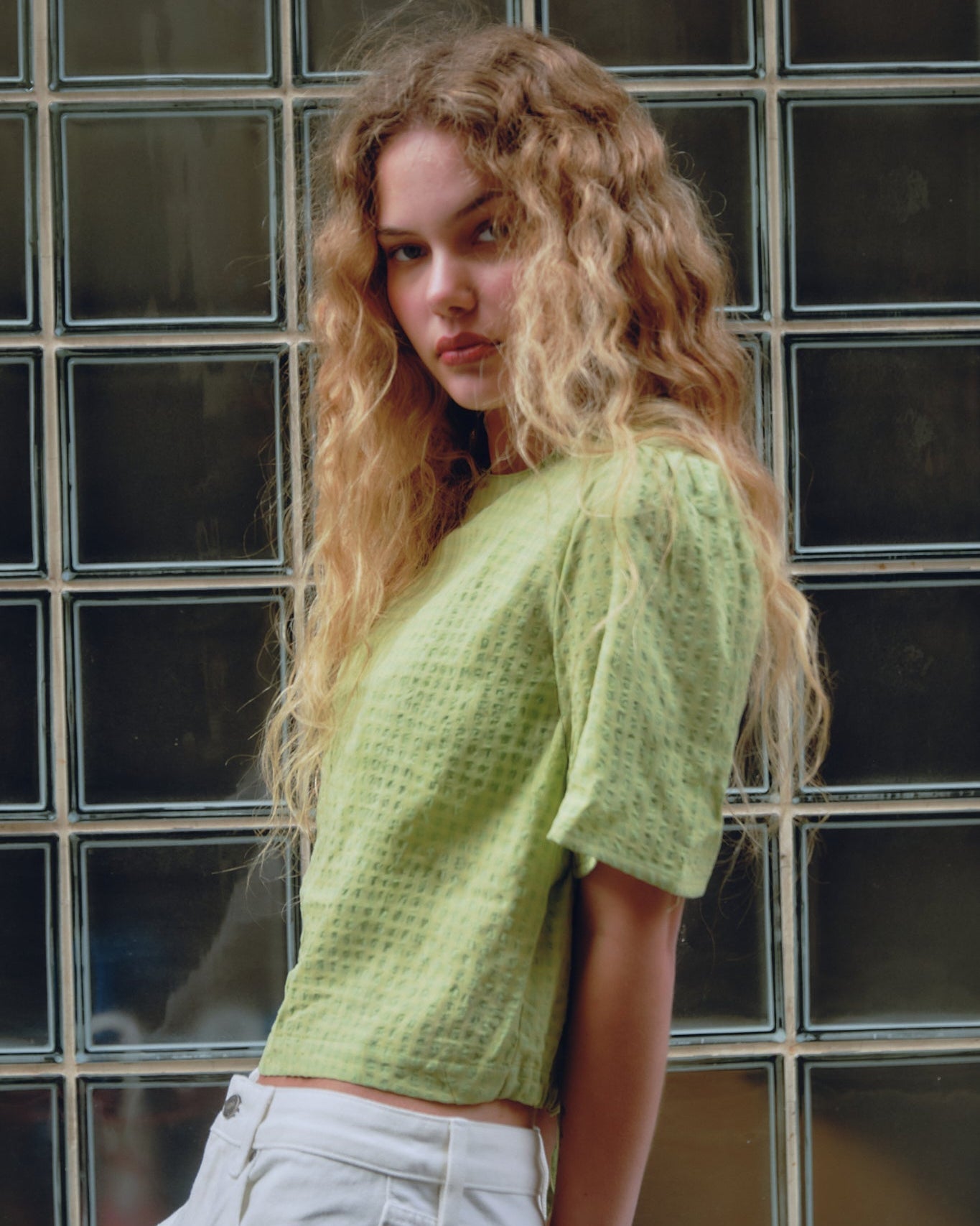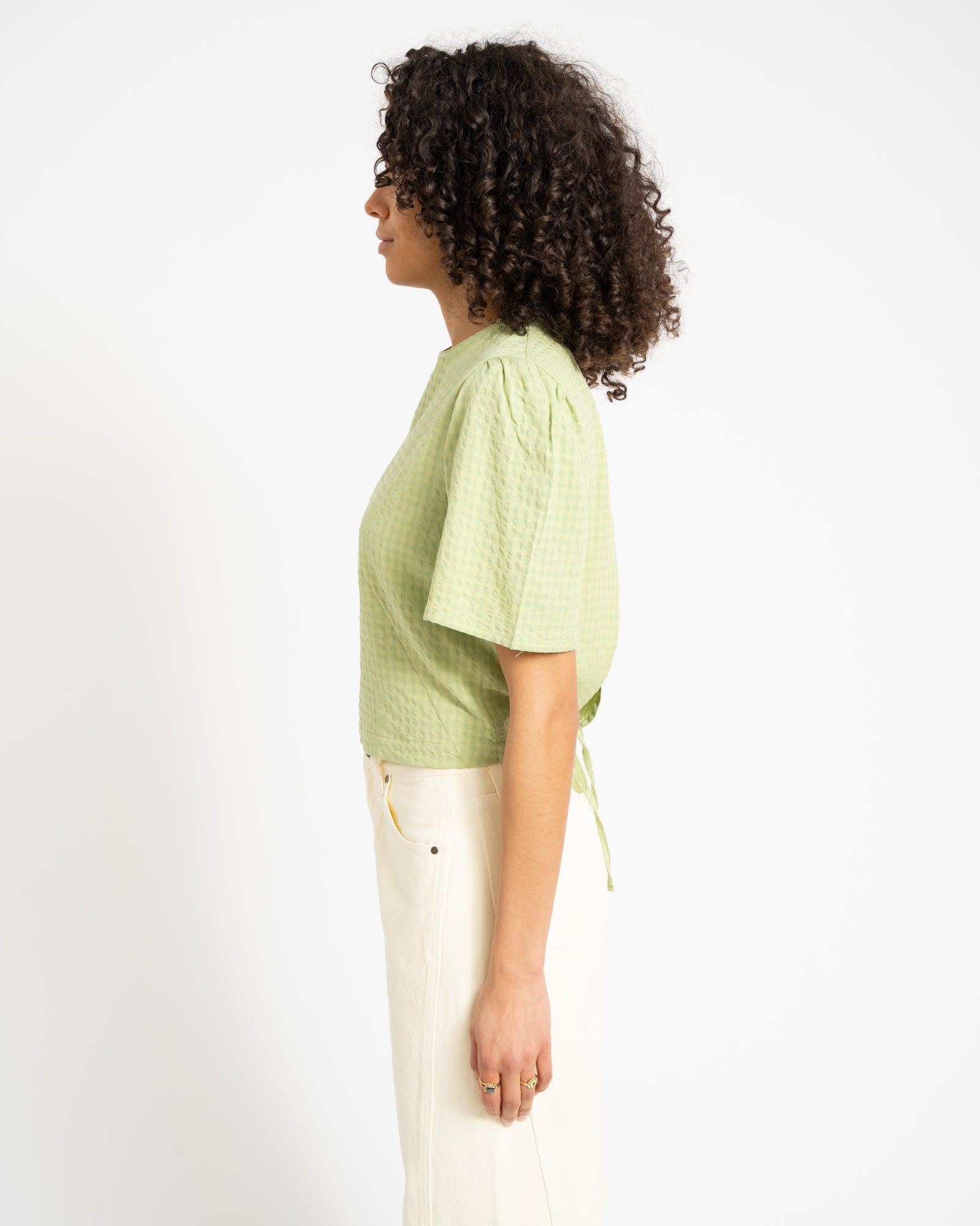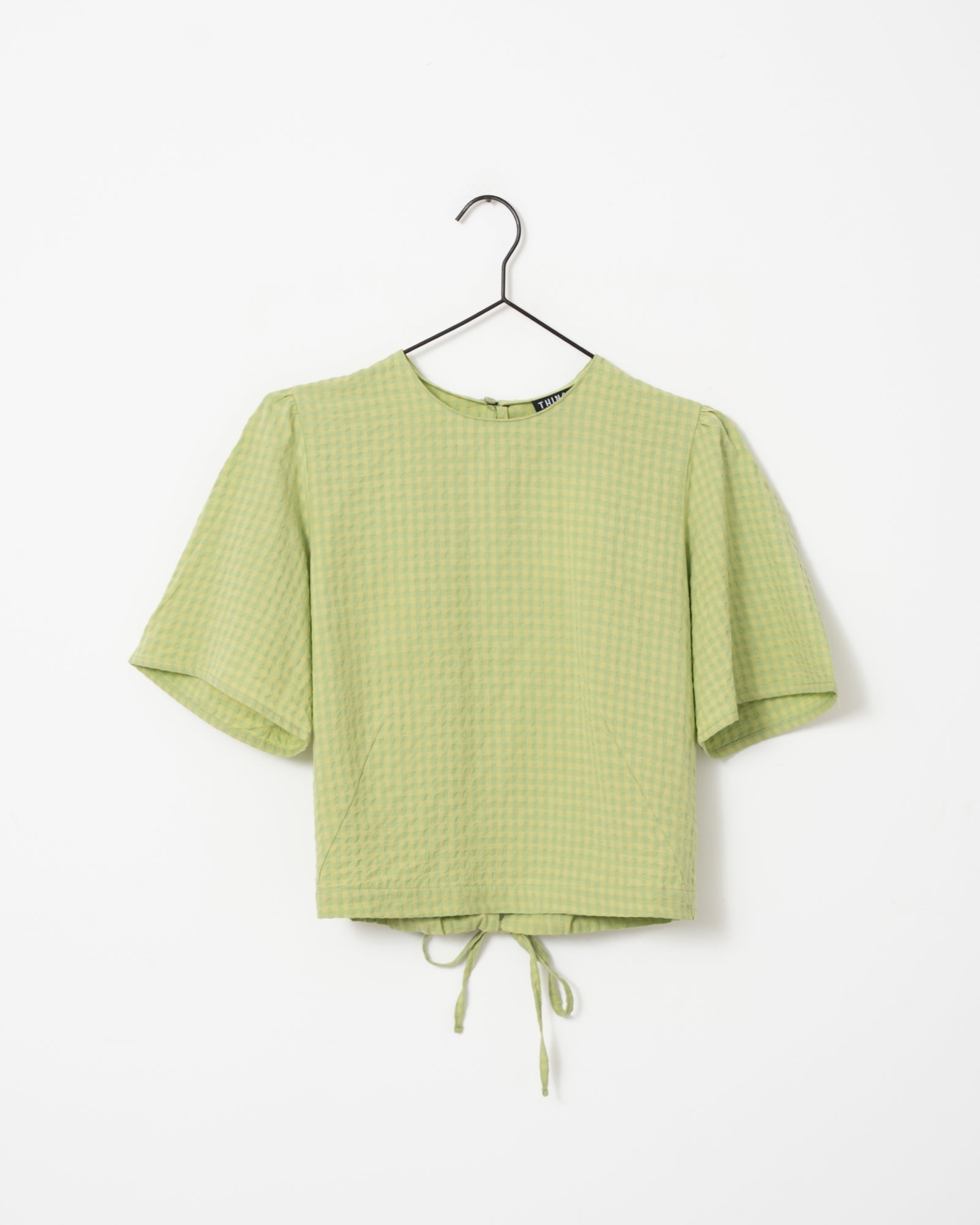 Green blouse with a subtle texture and an open back detail for a fresh, feminine look. The tie closure at the back adds that little extra. 💚