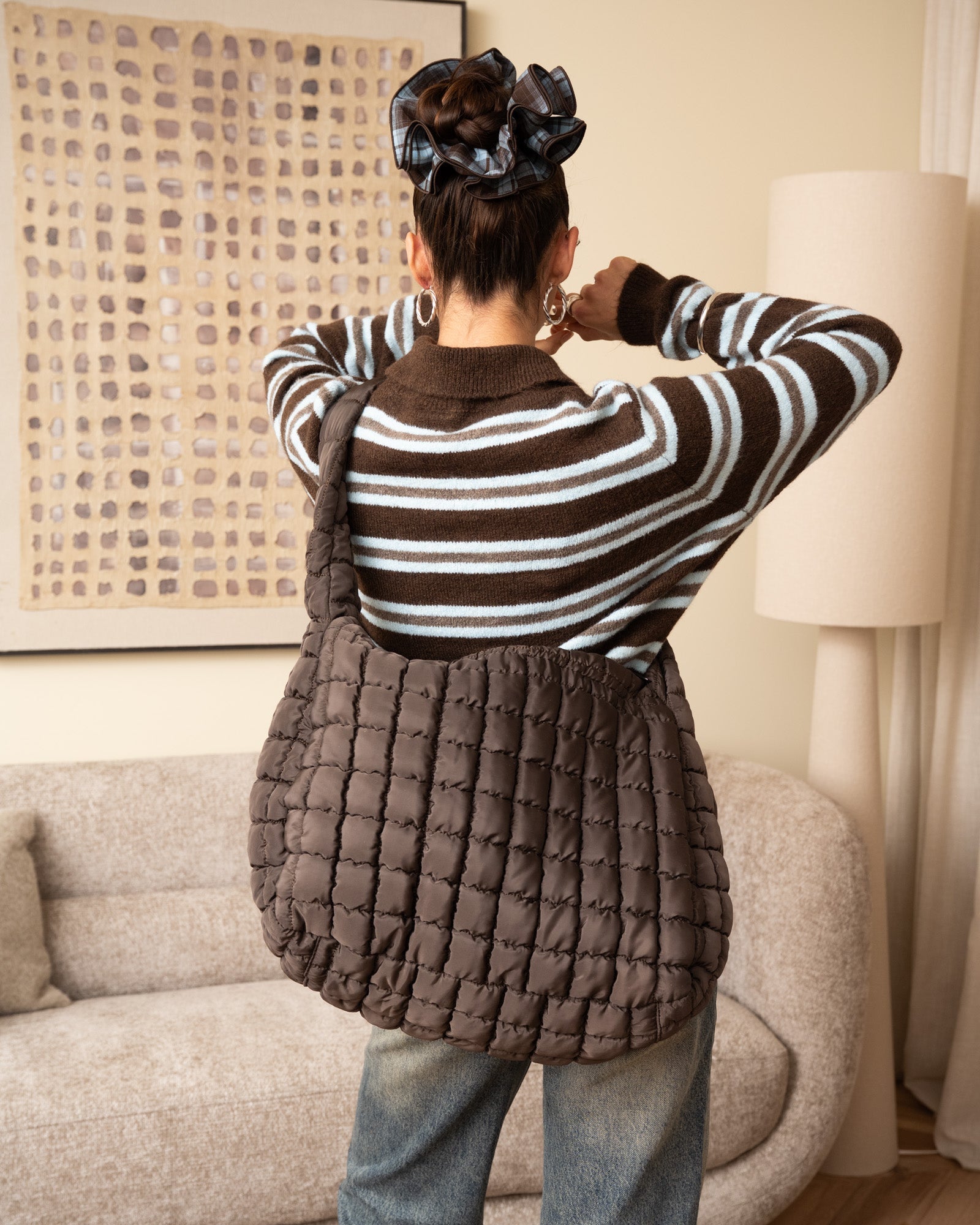 Extra roomy, soft, and with a trendy quilted look. It features a handy inner zippered pocket and can be worn over the shoulder or crossbody.