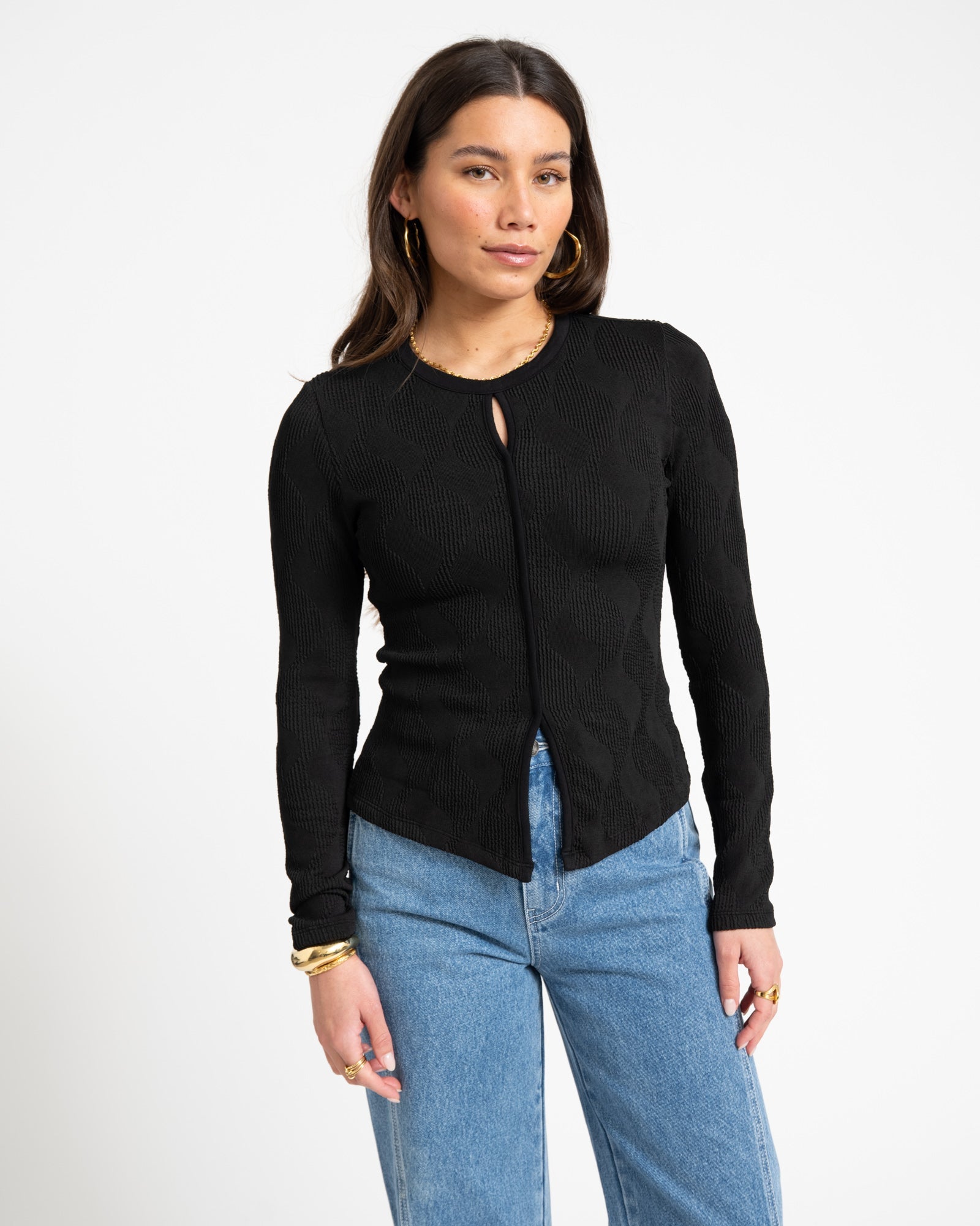 A basic top with a twist. The slim fit, small cutout, and playful slit make it anything but boring.