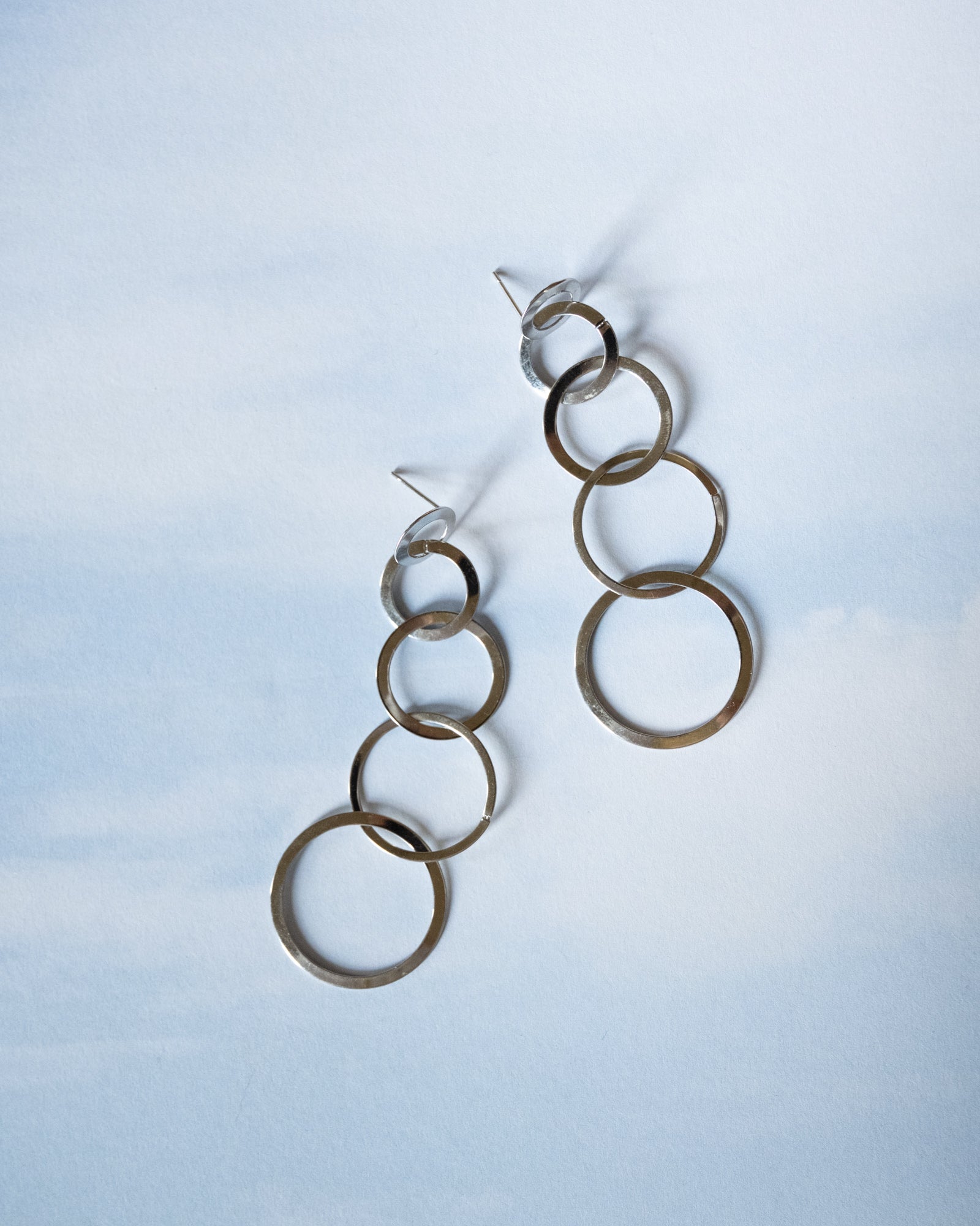 Silver earrings with five interconnected rings.