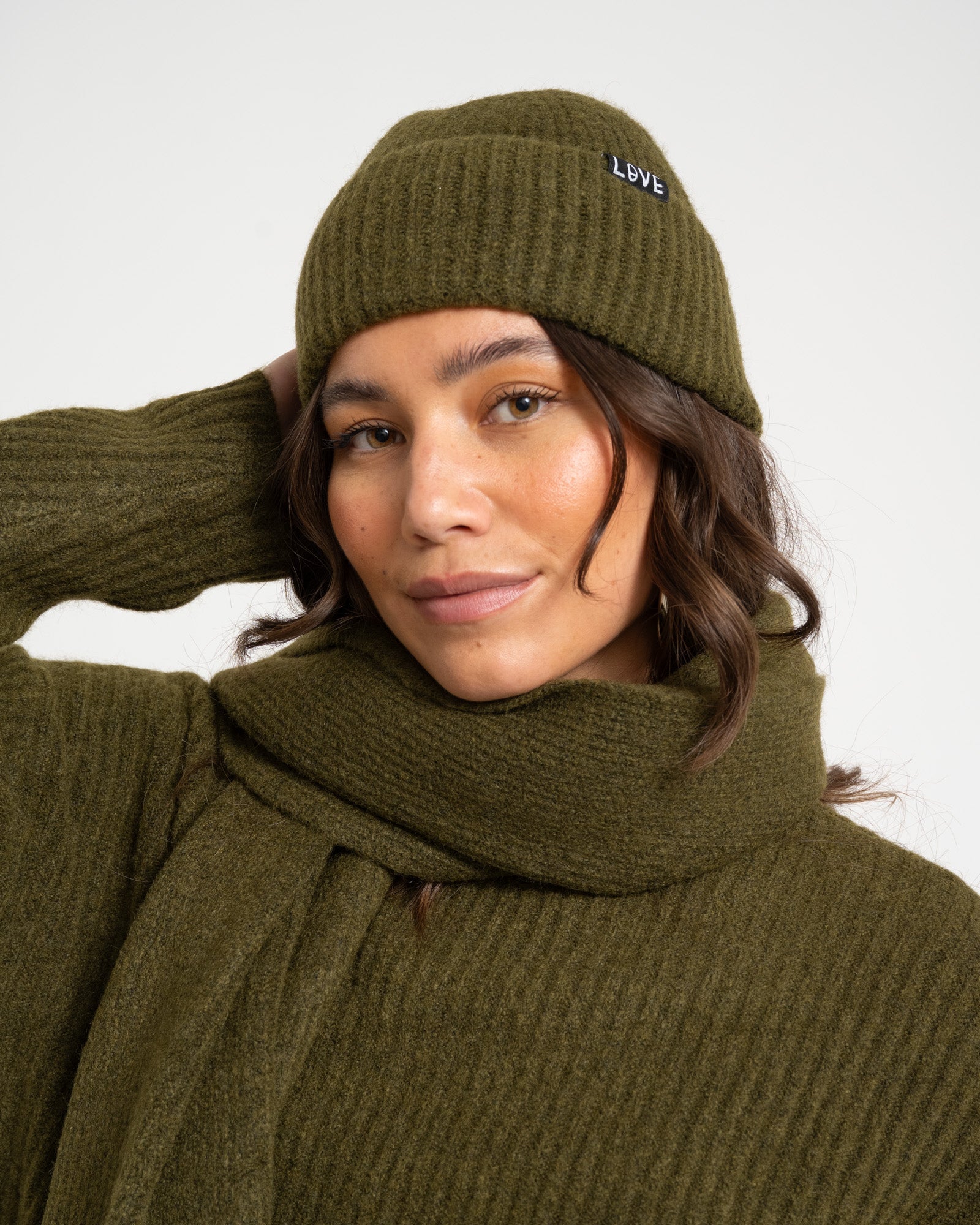 Our super soft and comfortable ribbed knit scarf. It has a small brand label with "LOVE," just like the beanie.