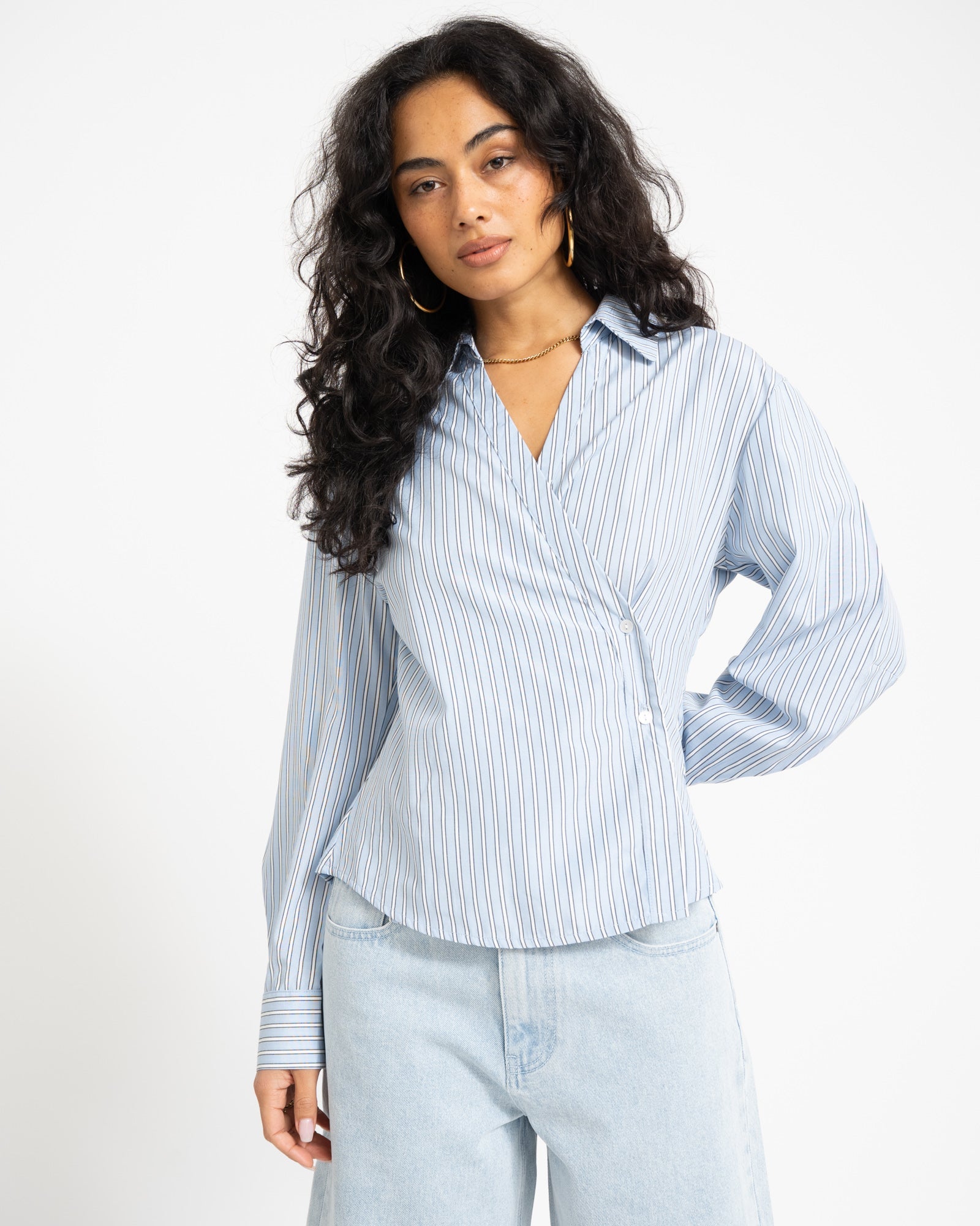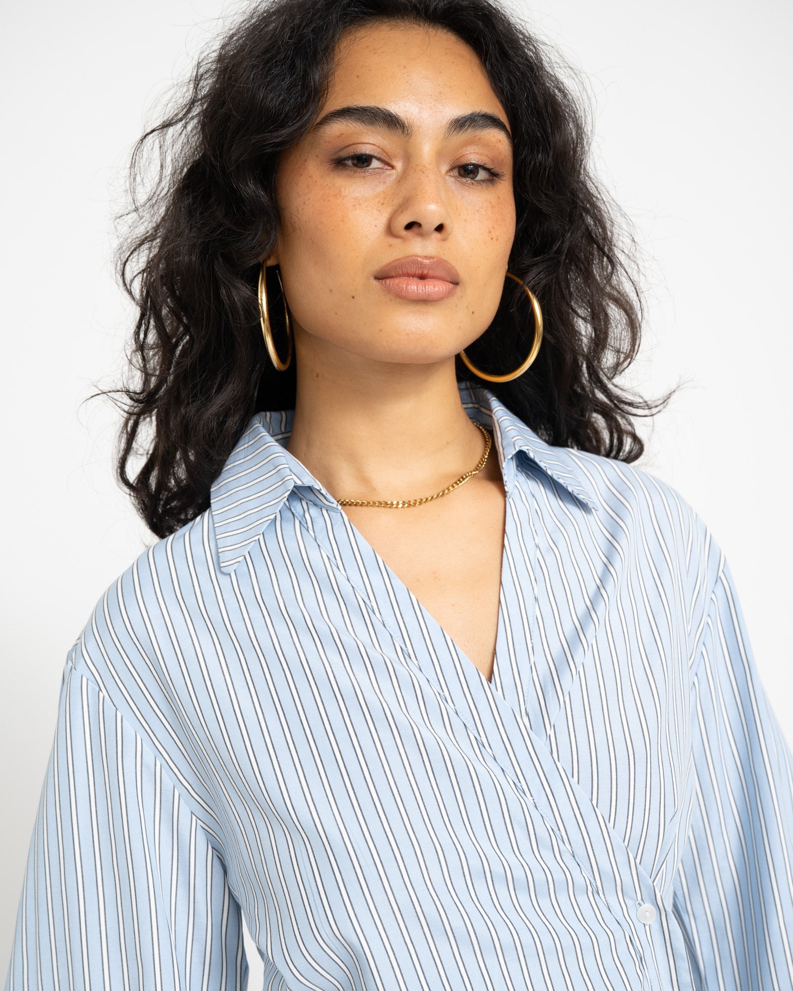 This light blue striped wrap blouse has a feminine fit and a timeless look. The subtle lines and soft fabric make it a refined choice for both everyday wear and formal outfits.