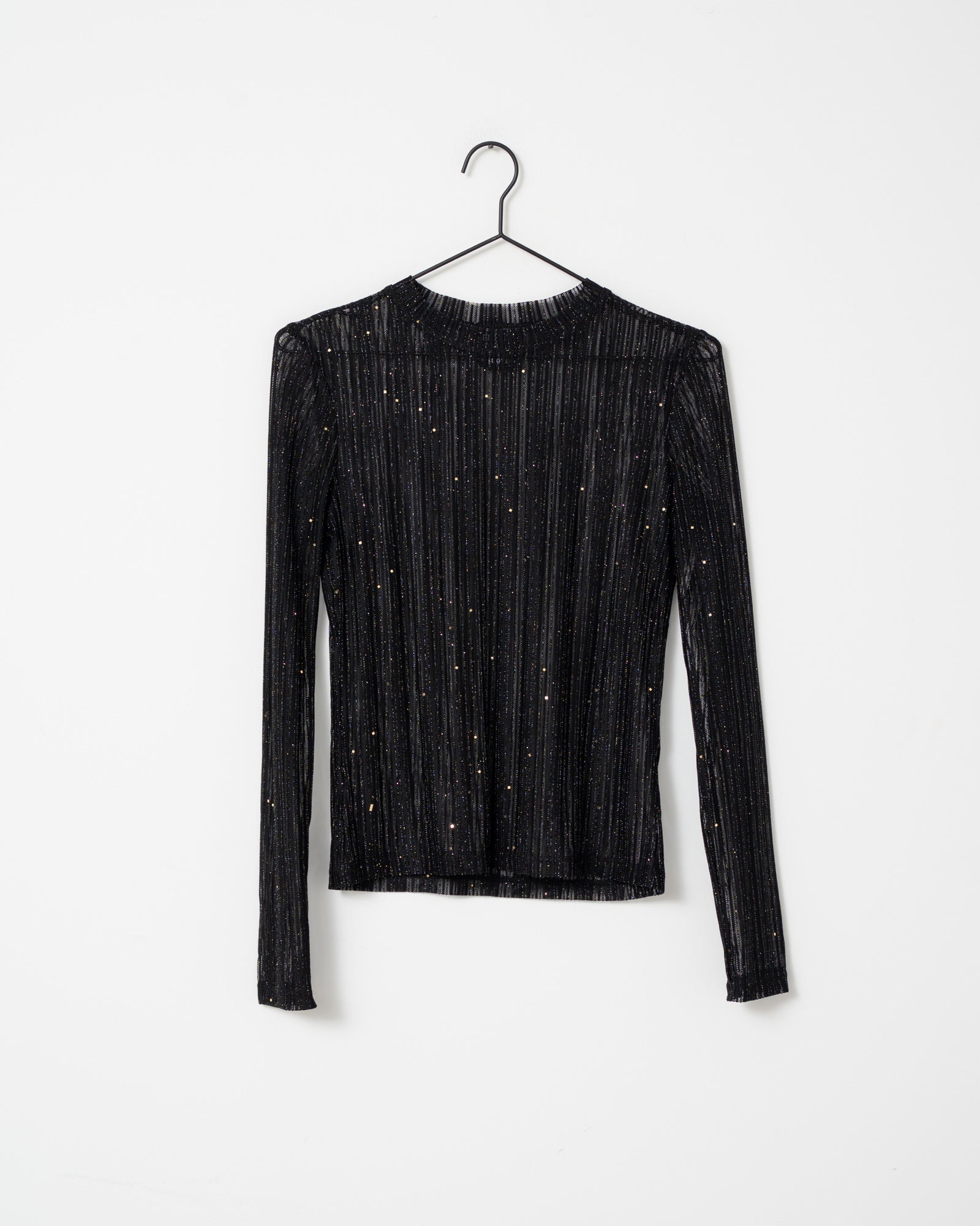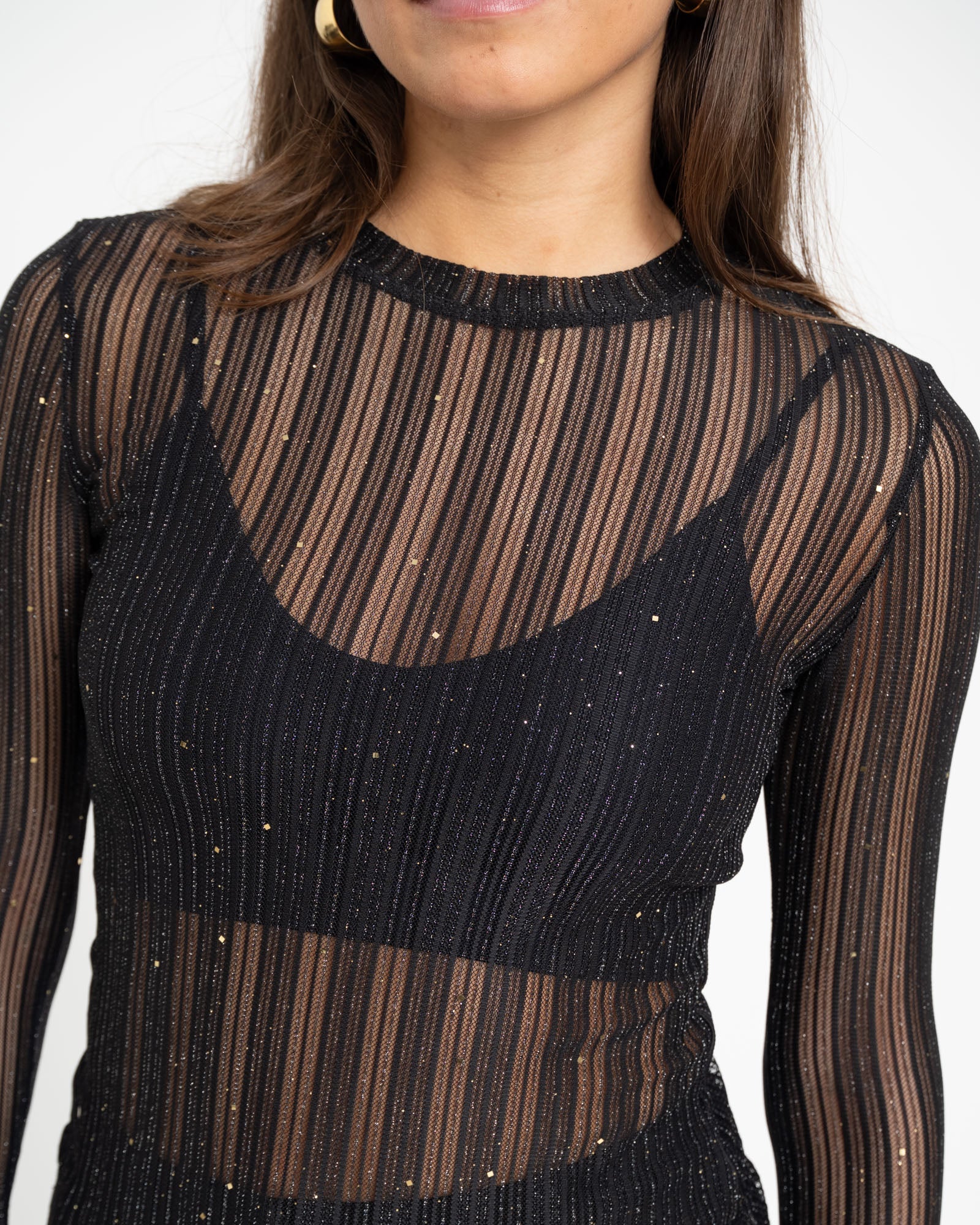Deze zwarte mesh top met glitterstrepen is perfect voor party nights. Subtiel see-through, stretchy en superflattering.