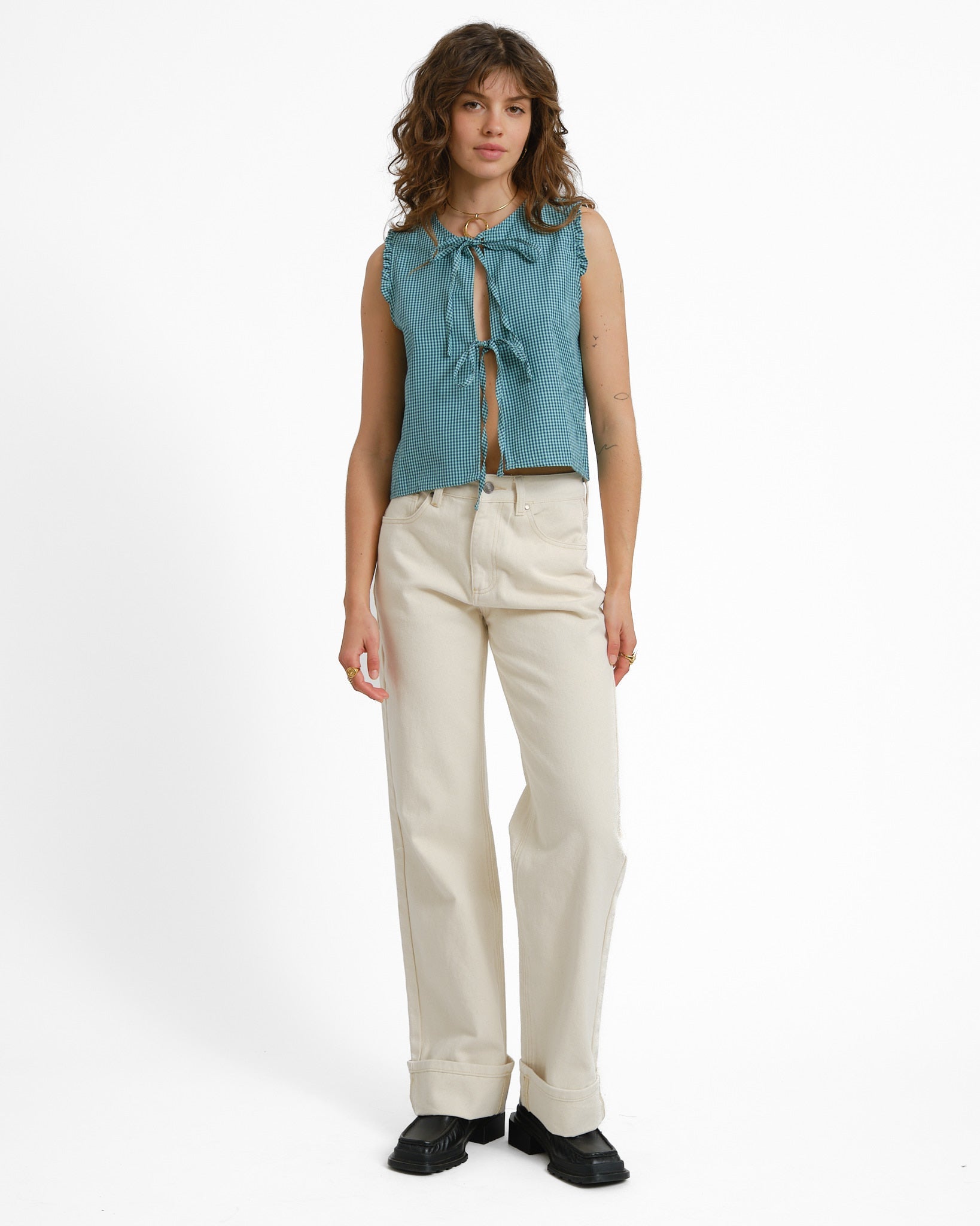 | Details | Ruffle details along the shoulders, Button closure at the front, Sleeveless |