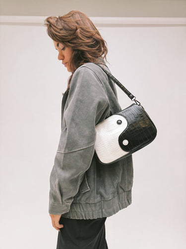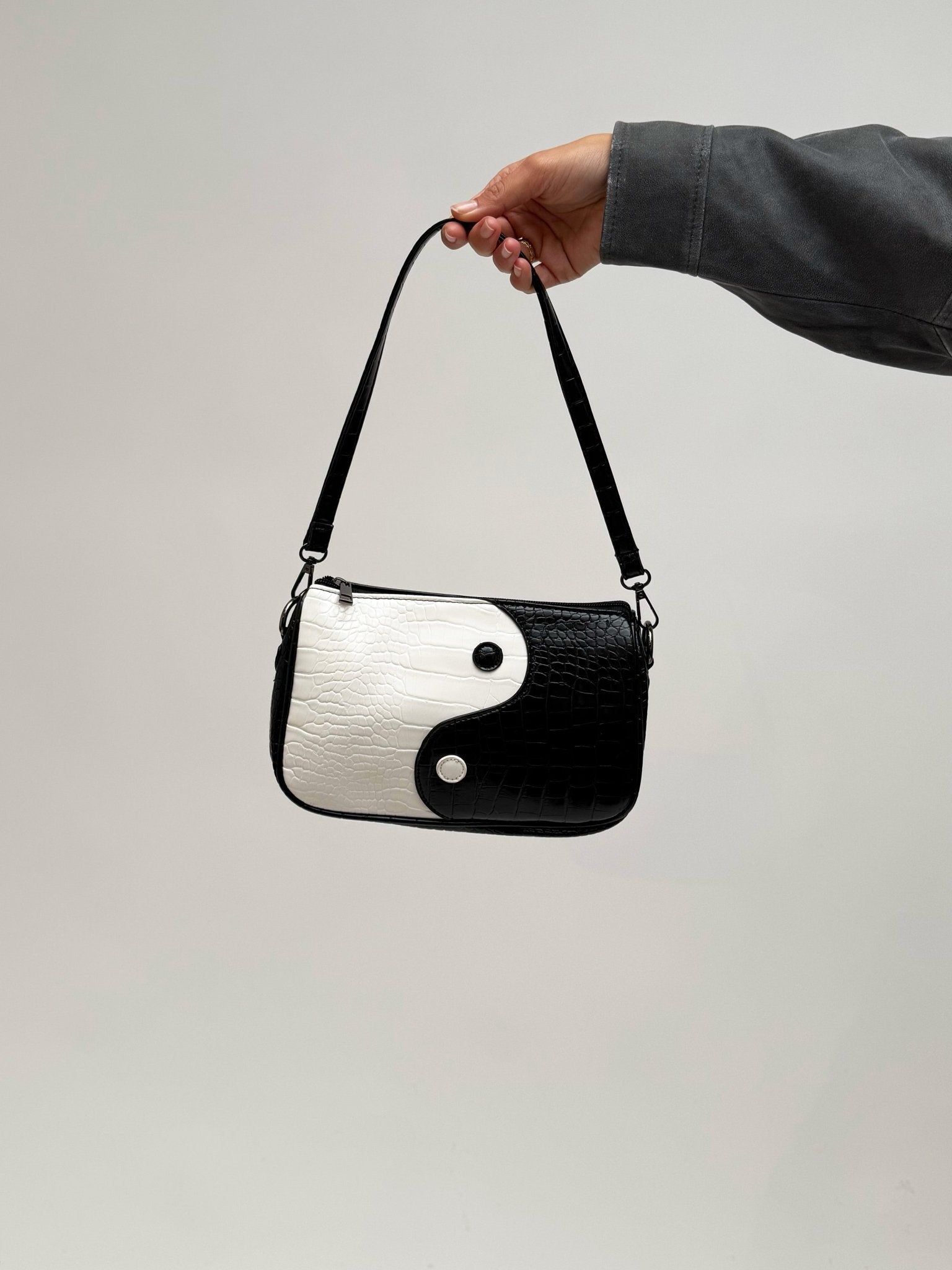 With a crocodile effect, a contrasting black-and-white look, and a compact size, it's perfect for your night-out essentials!