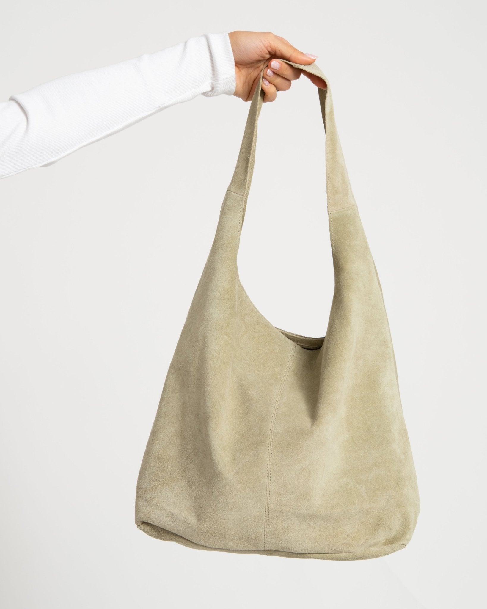Soft suede shoulder bag in a fresh moss green hue. Its casual shape and spacious interior make it perfect for everyday use. Minimalist, timeless, and easy to pair with any outfit.