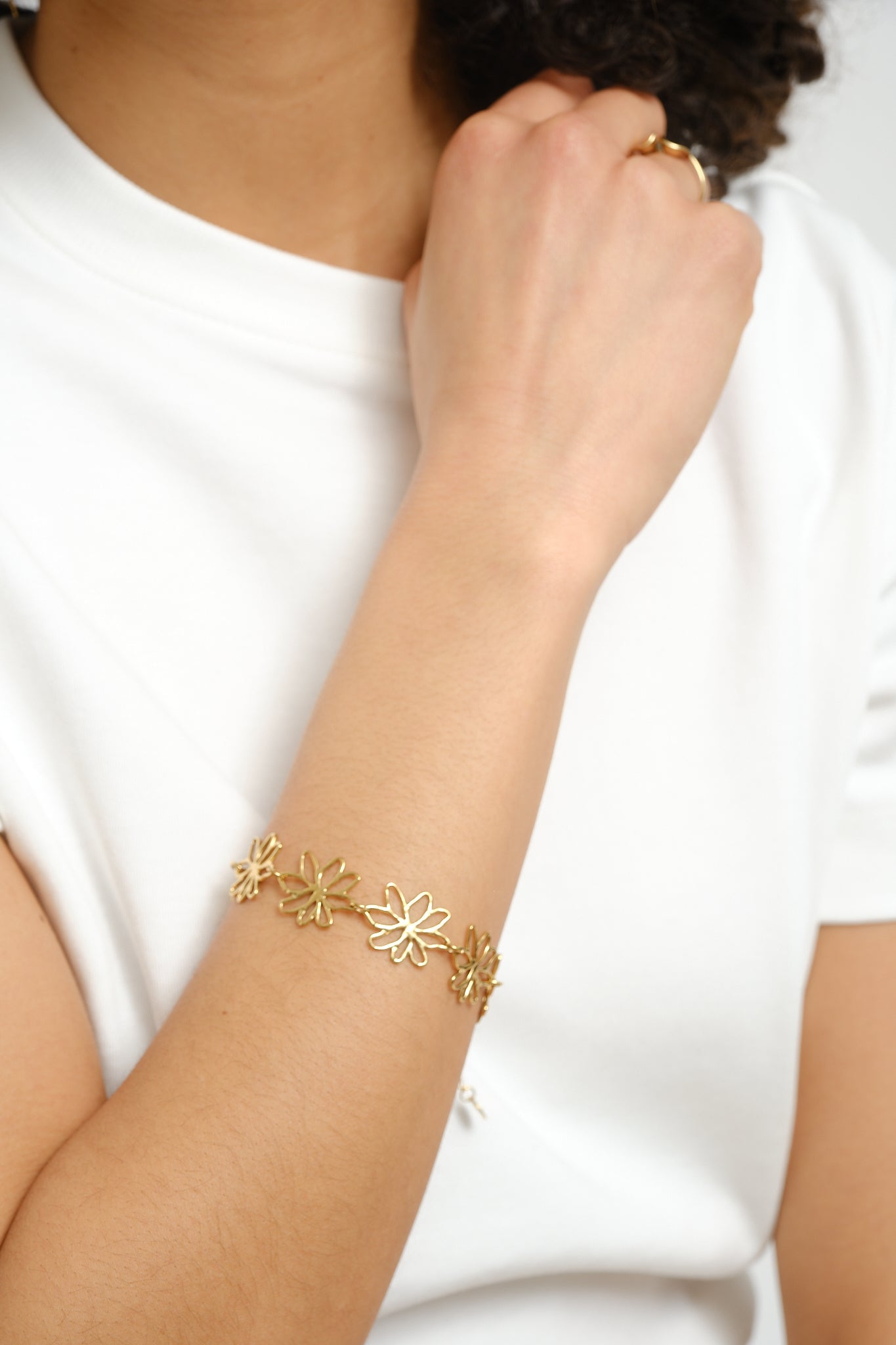 A refined, gold-toned bracelet with a playful floral detail as an eye-catcher