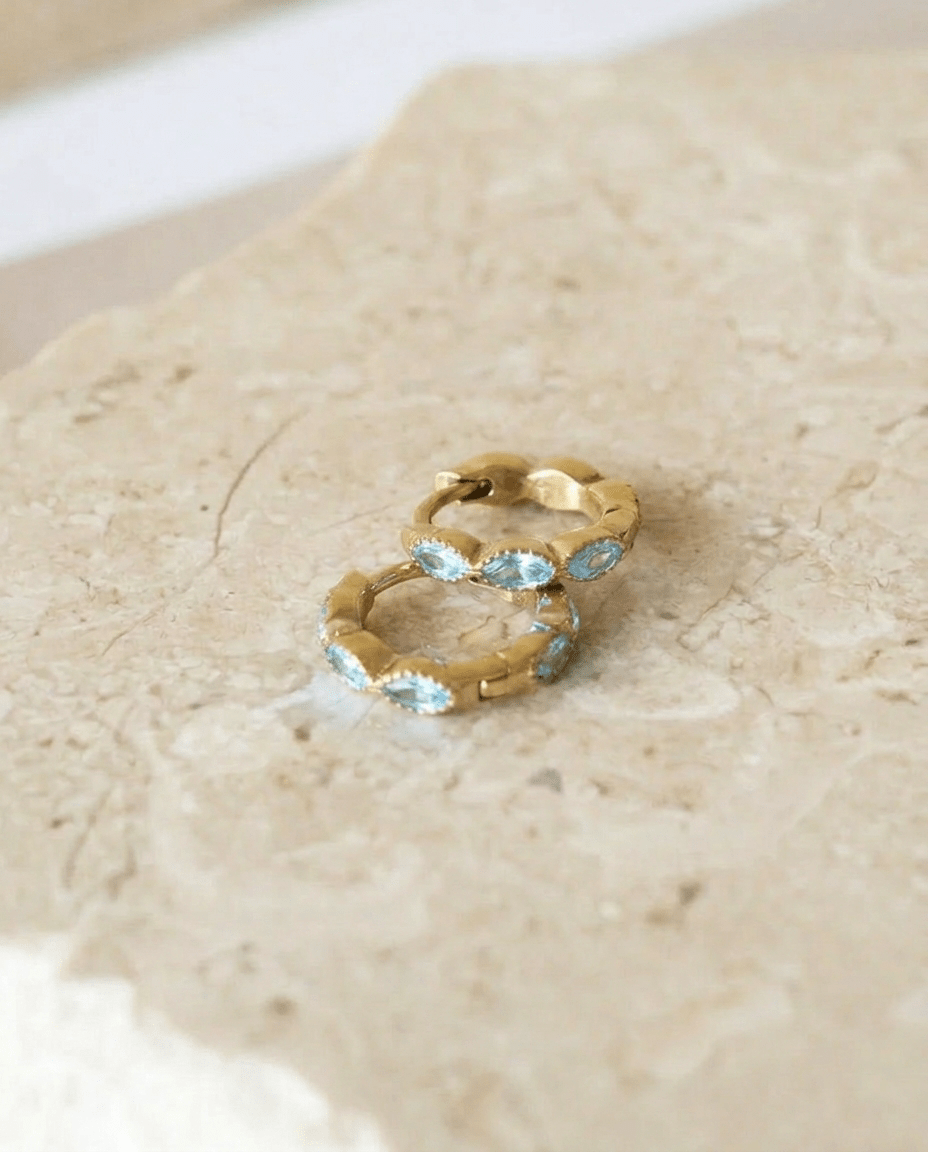 Gold-colored earrings with zircon stones in a fresh baby blue hue. A subtle eye-catcher that adds a playful, elegant touch to any outfit.